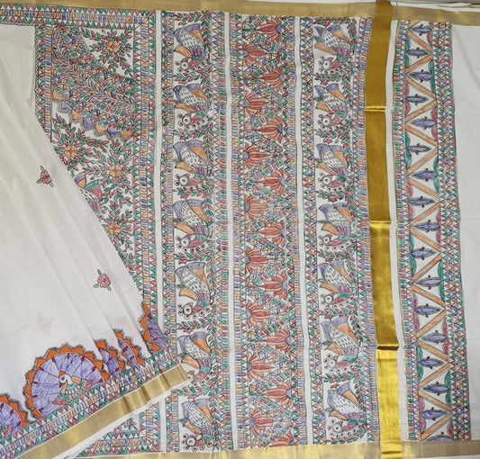 Artistic Madhubani Kerala Cotton Saree – Handcrafted Ivory Elegance with Multicolour Designs