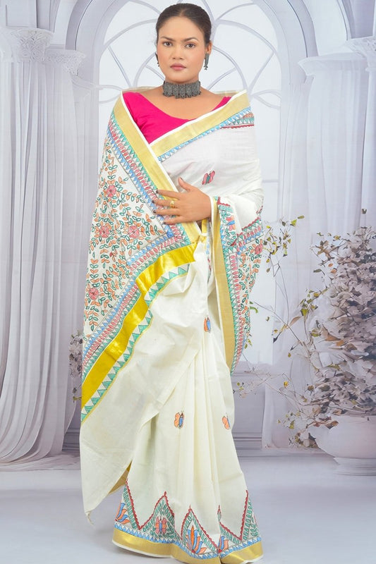 Ivory Elegance Madhubani Hand-Painted Kerala Cotton Saree – Floral Motifs with Artistic Borders