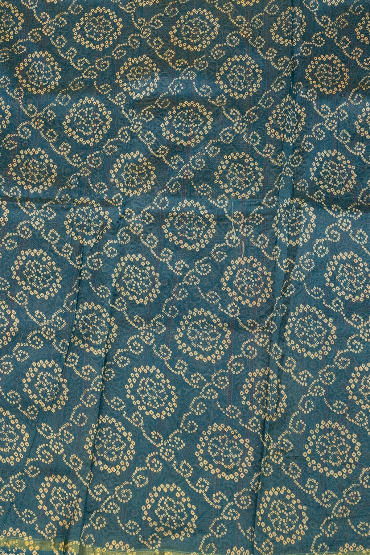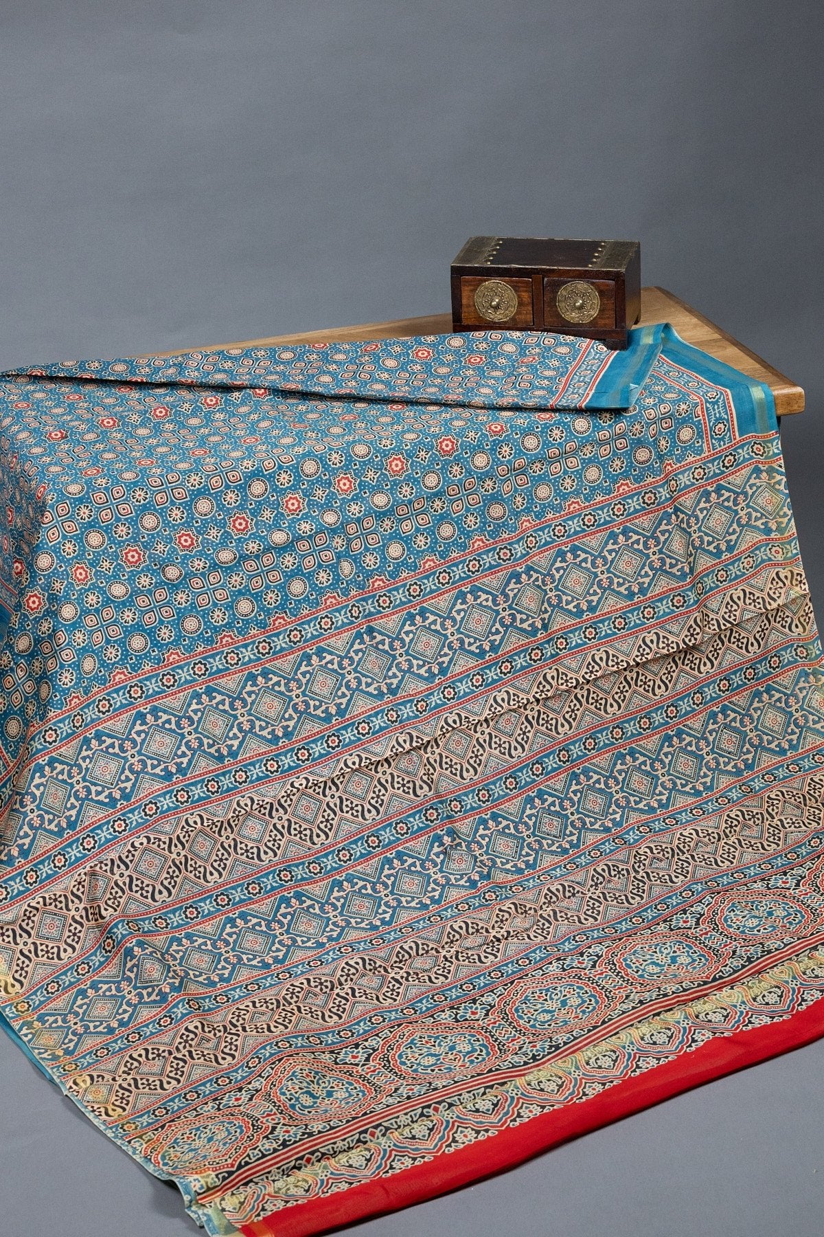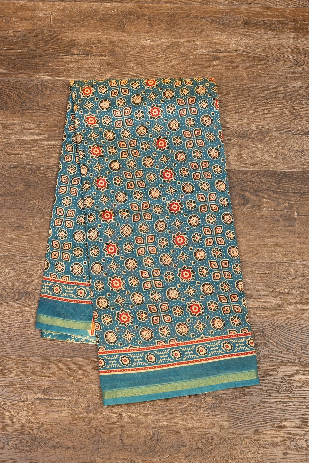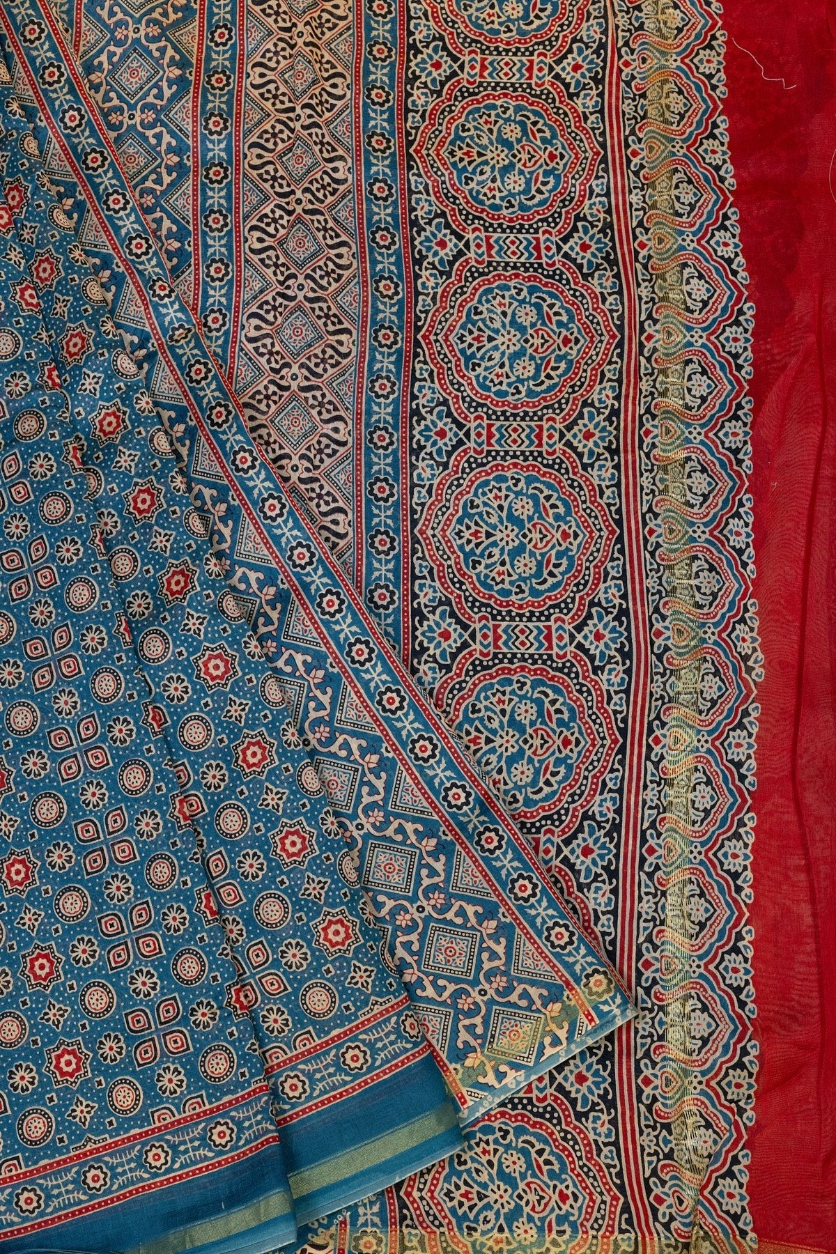 Immerse yourself in a confluence of tradition and luxury with this striking teal blue and red silk-cotton saree. Adorned with intricate Ajrak hand-block motifs and framed by a modest gold zari border, this saree is a showstopper.