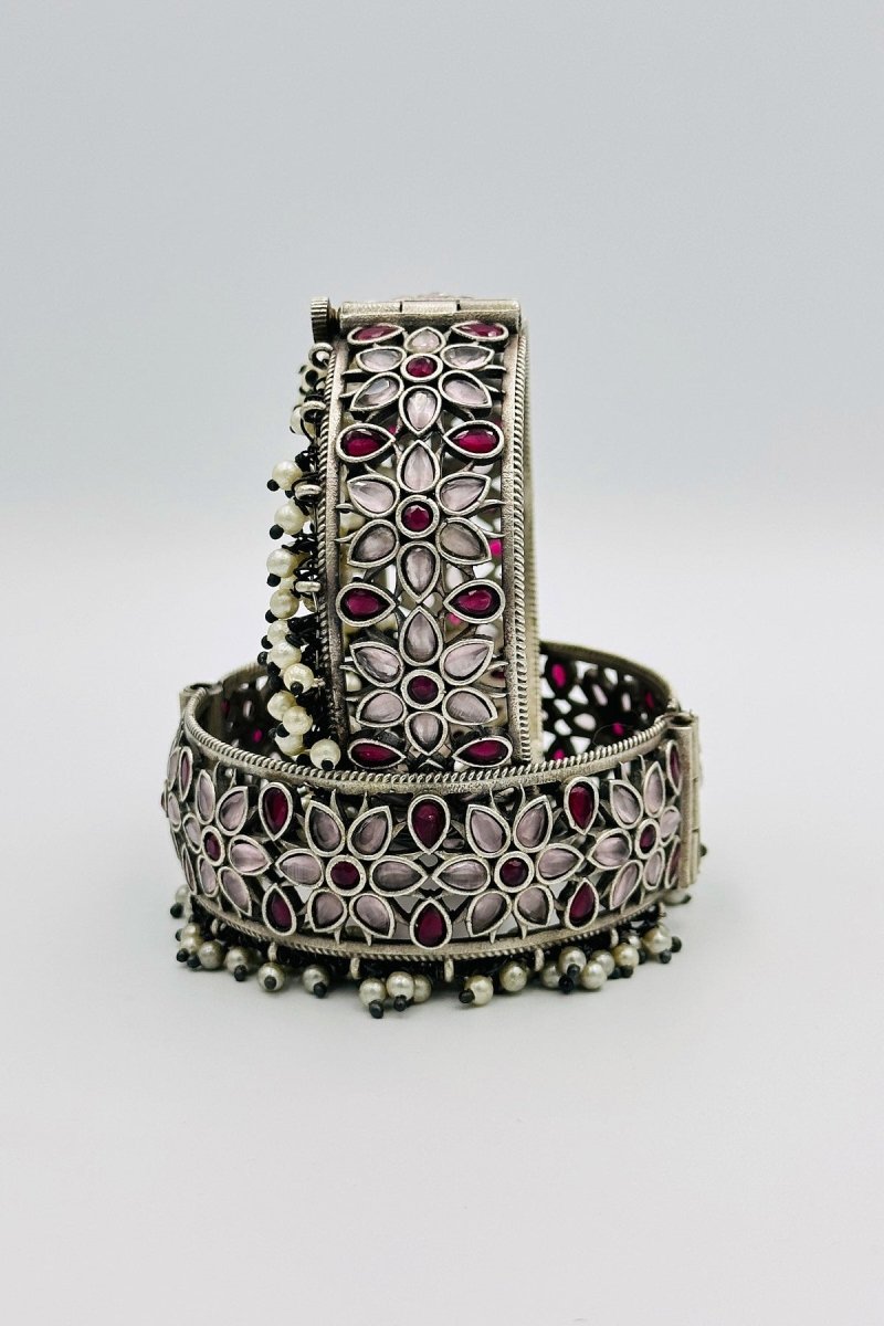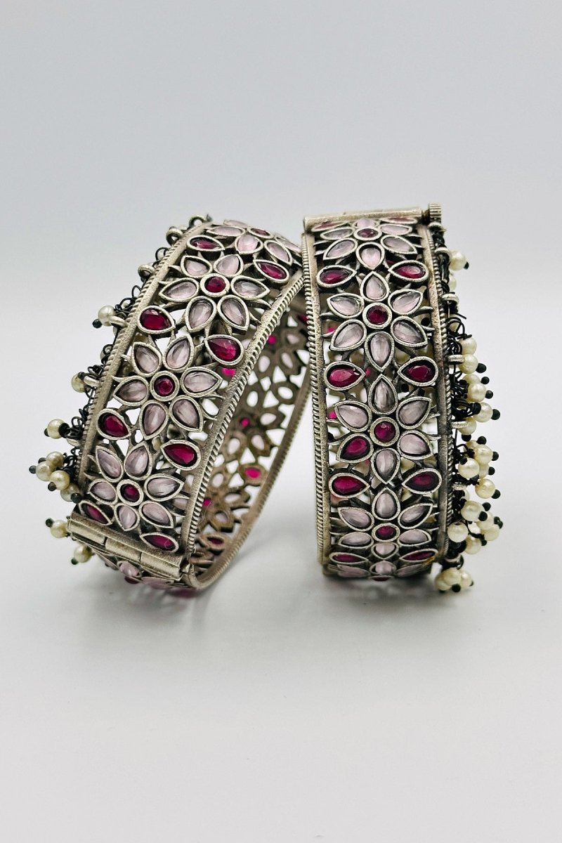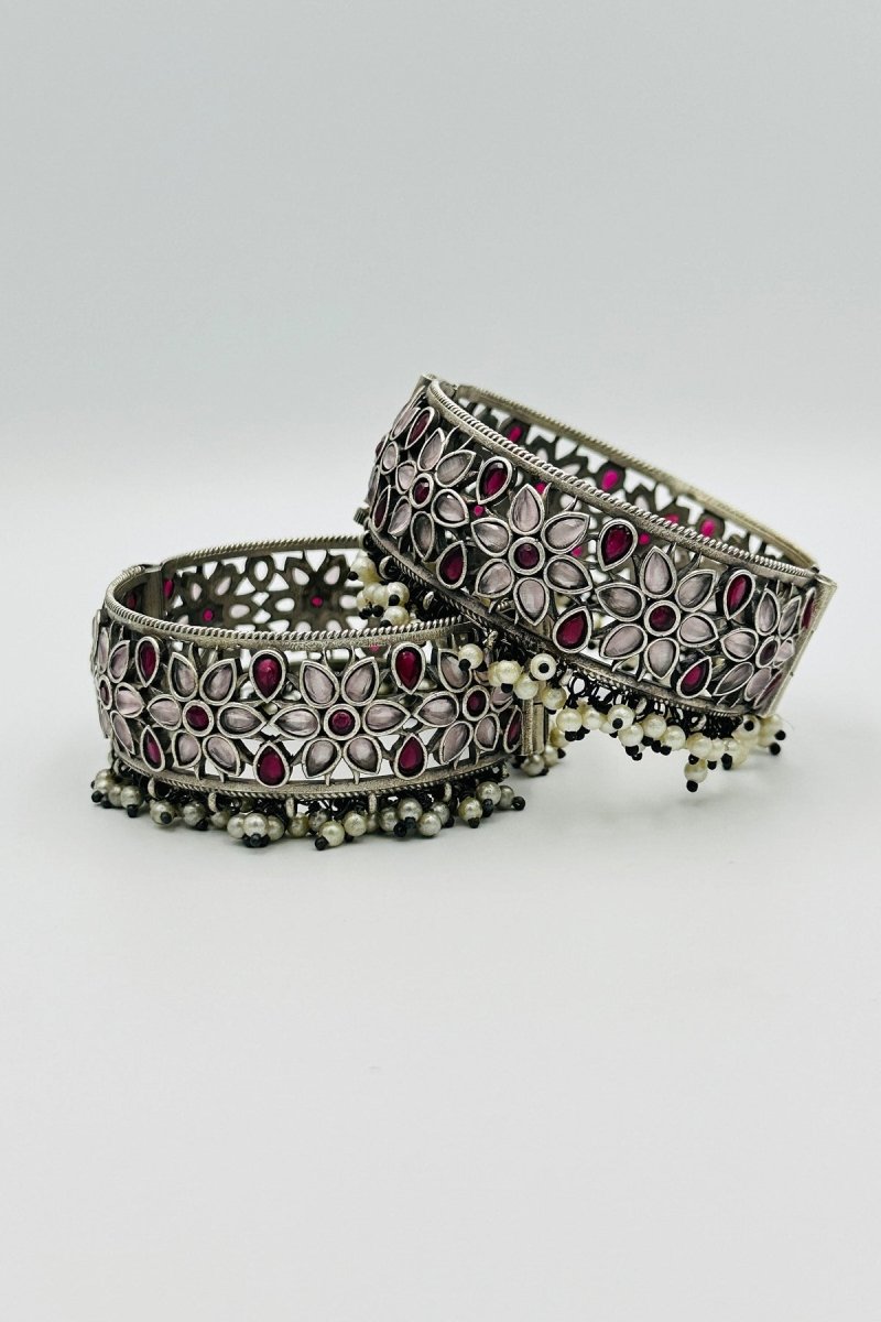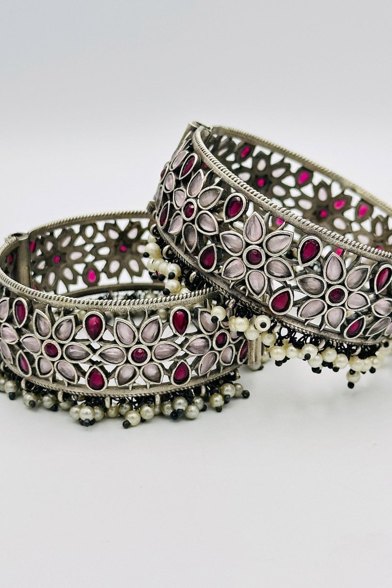 Elegance blooms with our sterling silver bangles, meticulously crafted in a breathtaking floral design. Each bangle is adorned with exquisite deep pink and blush pink stones, complemented by lustrous pearls that add a touch of sophistication. Perfect for those who cherish timeless beauty and artisanal craftsmanship, these bangles are a testament to the harmony of nature and fine jewelry.