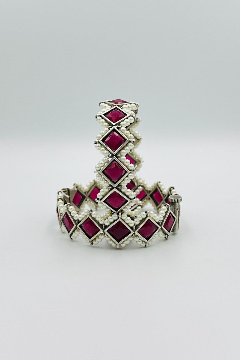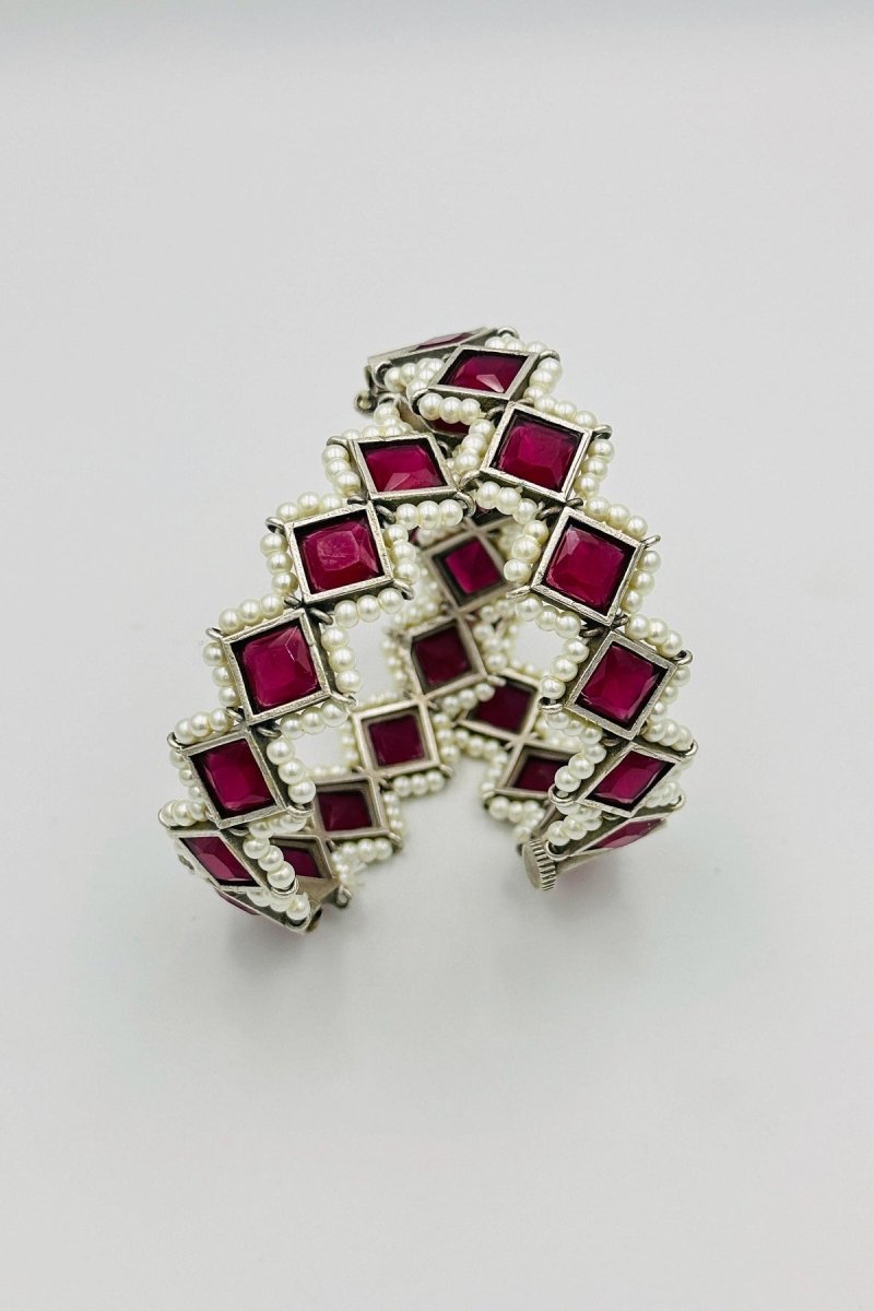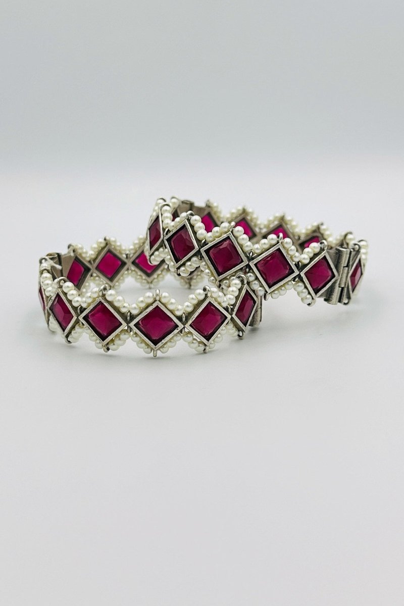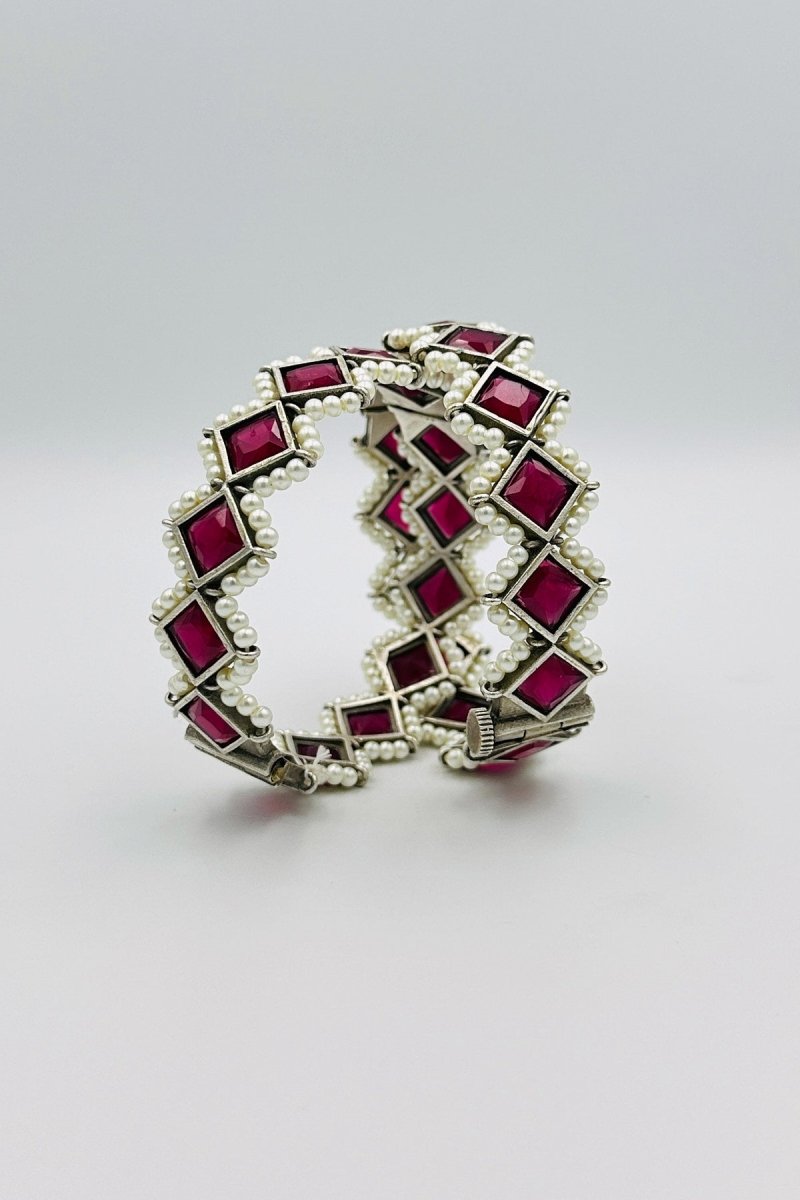 Elevate your elegance with our Opulent Silver Bangles, featuring a sophisticated design that exudes luxury and refinement. These exquisite bangles are meticulously crafted from the finest silver, showcasing intricate embossing that highlights their rich and elegant appeal. Each bangle is adorned with striking marquise-shaped deep red stones, exuding a captivating allure, and surrounded by lustrous pearls that add a touch of timeless sophistication. The harmonious blend of bold deep red stones and delicate pearls creates a stunning visual masterpiece, making these bangles the perfect accessory for special occasions or to add a touch of opulence to your everyday attire.