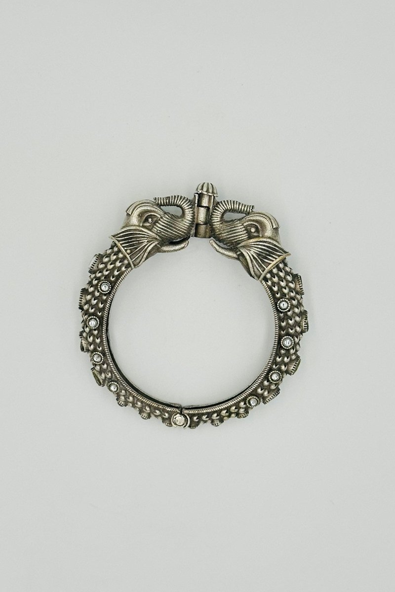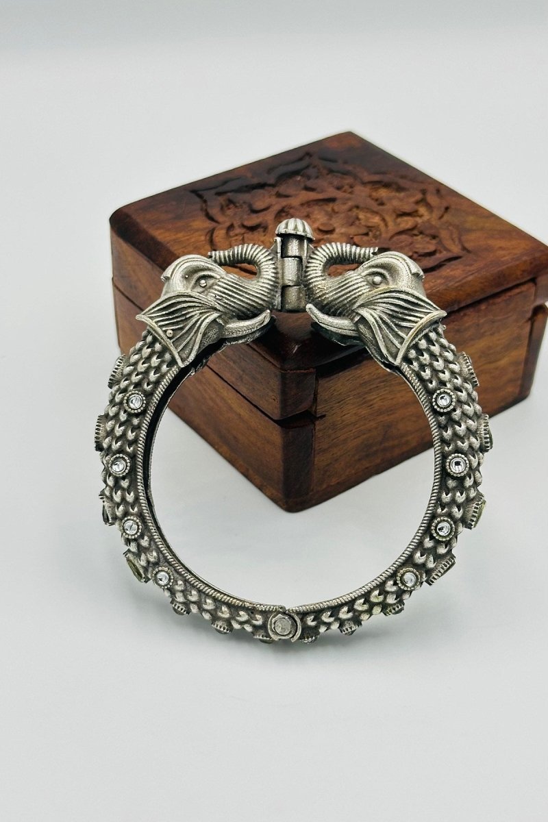 Add a touch of regal elegance to your jewelry collection with this stunning Elephant Design Kada in Oxidized Silver, adorned with white stones. The elephant is a symbol of royalty, power, and wisdom in many cultures, making this piece not only beautiful but also meaningful. The high-quality materials and intricate design ensure that this kada will be a timeless addition to your jewelry collection.