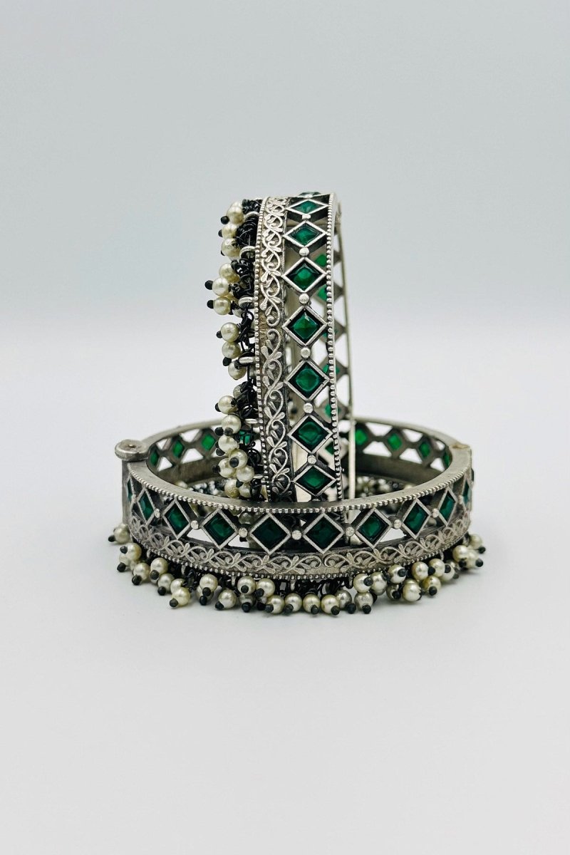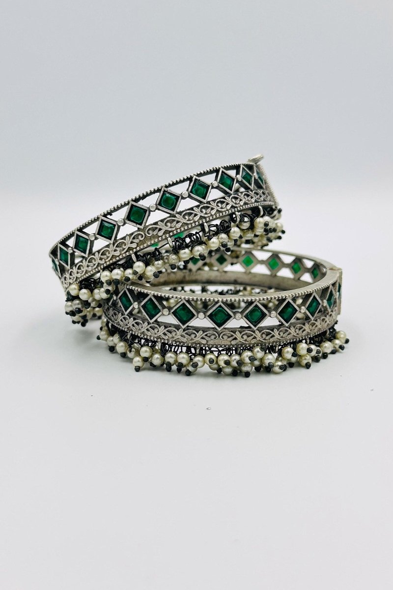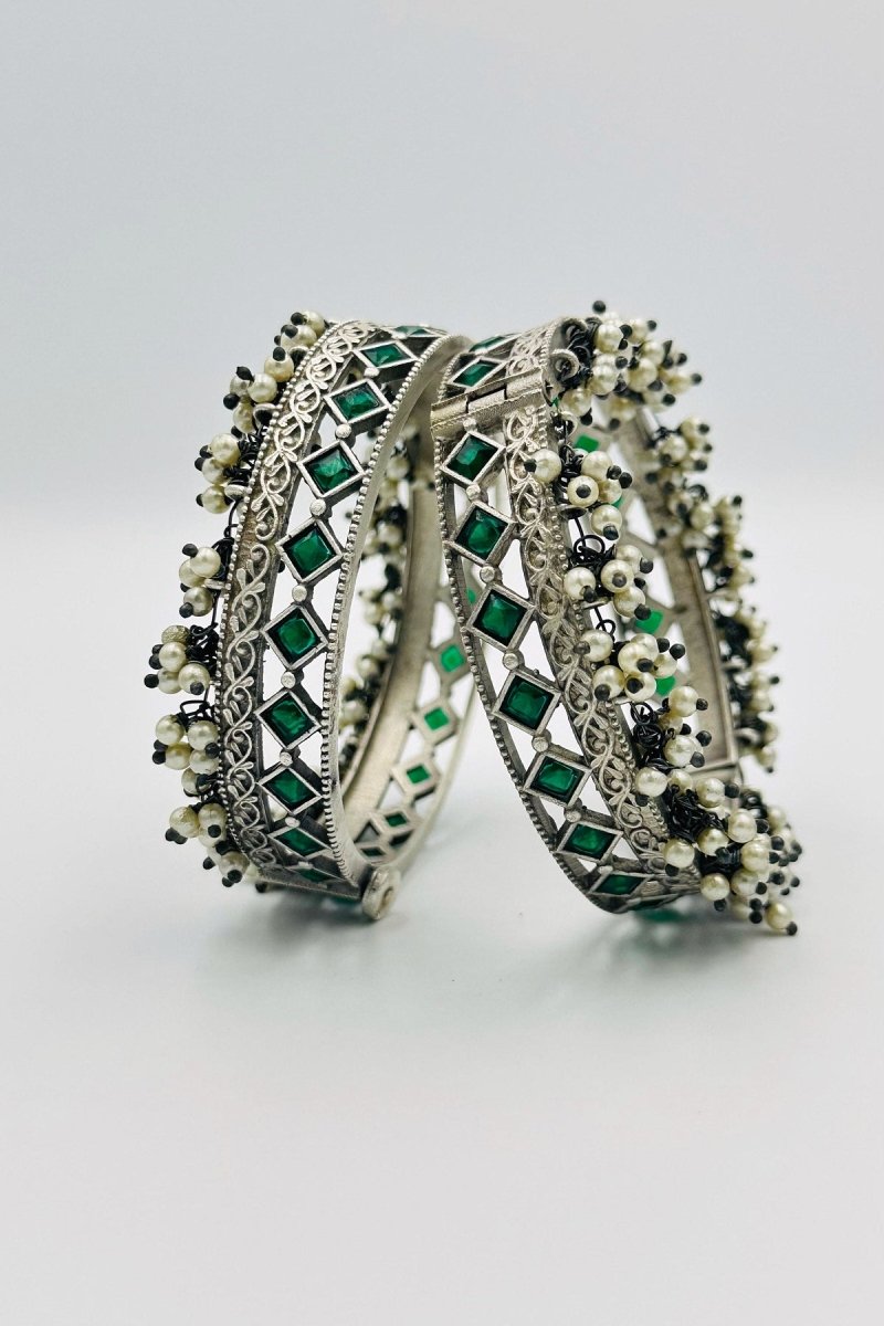 Silver Bangles with Green Crystal Stones and Pearls Description: - swadeshsouq.com