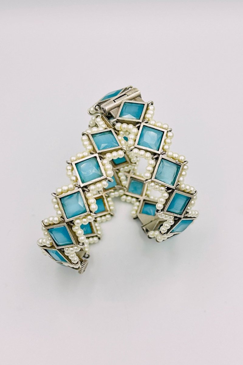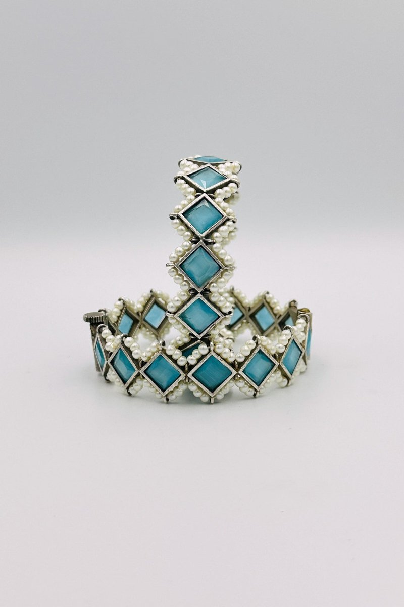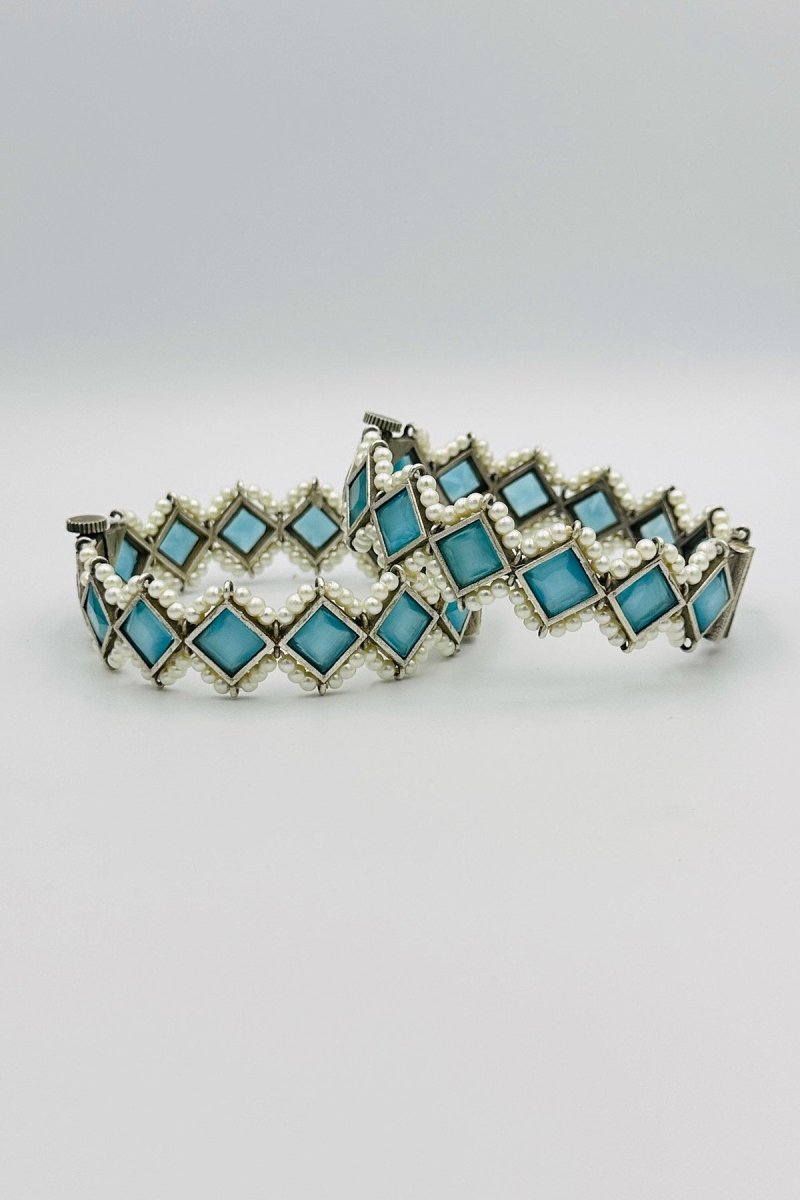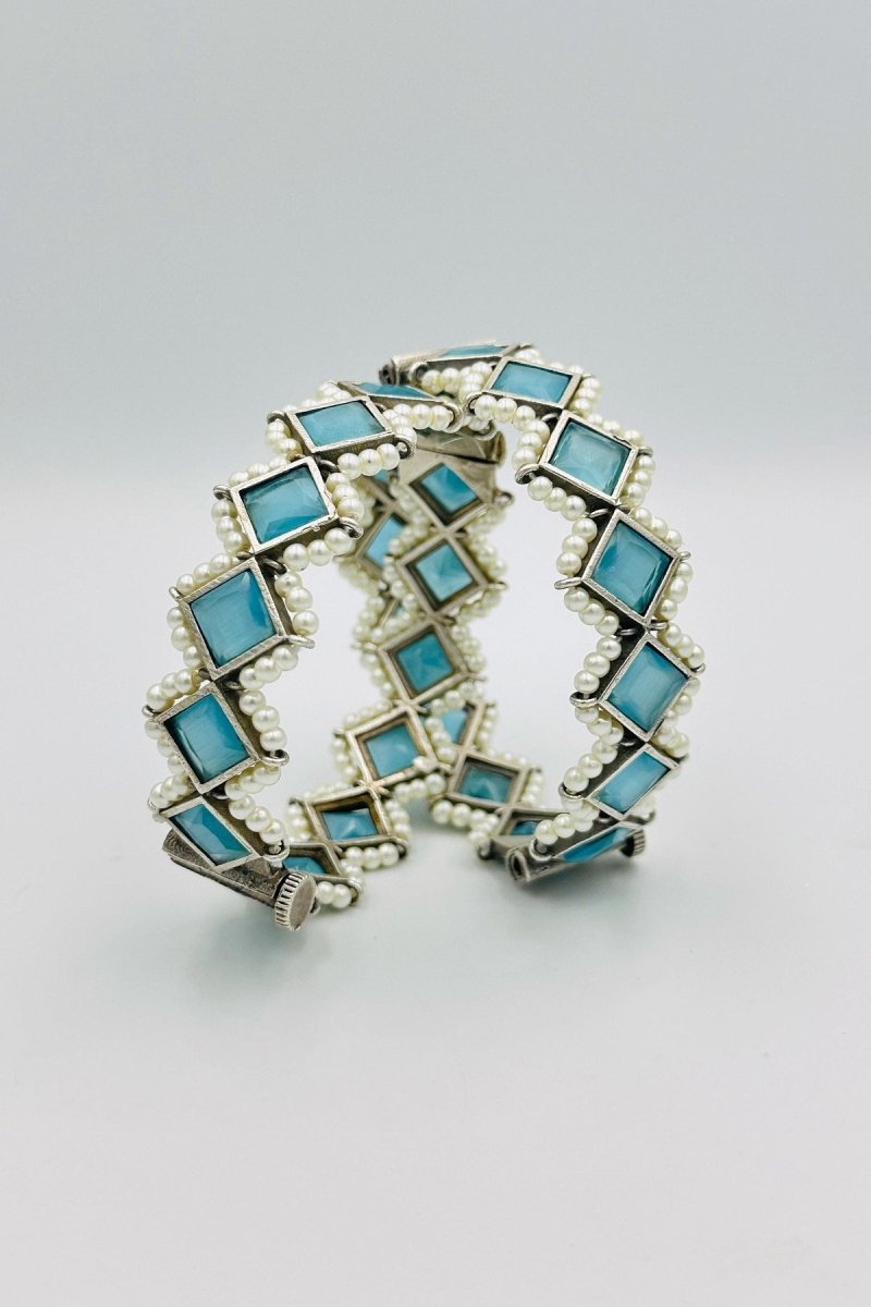 Indulge in the ethereal beauty of our Majestic Silver Bangles, where luxury meets tranquil elegance. These extraordinary bangles are crafted from the finest silver, featuring intricate embossing that adds depth and sophistication to their design. Each bangle is adorned with radiant sky blue marquise-shaped stones, offering a serene and captivating glow. The calming sky blue stones are perfectly accented by lustrous pearls, creating a breathtaking interplay of colors and textures. Ideal for both special occasions and adding a touch of graceful refinement to your everyday look, these bangles exemplify timeless craftsmanship and style. Transform your jewelry collection with the exquisite charm of these silver bangles, designed to enchant and impress.