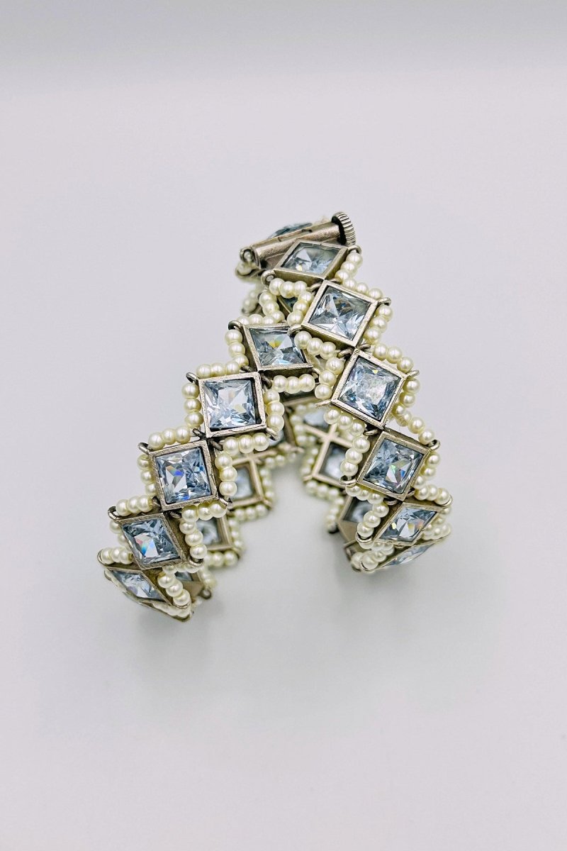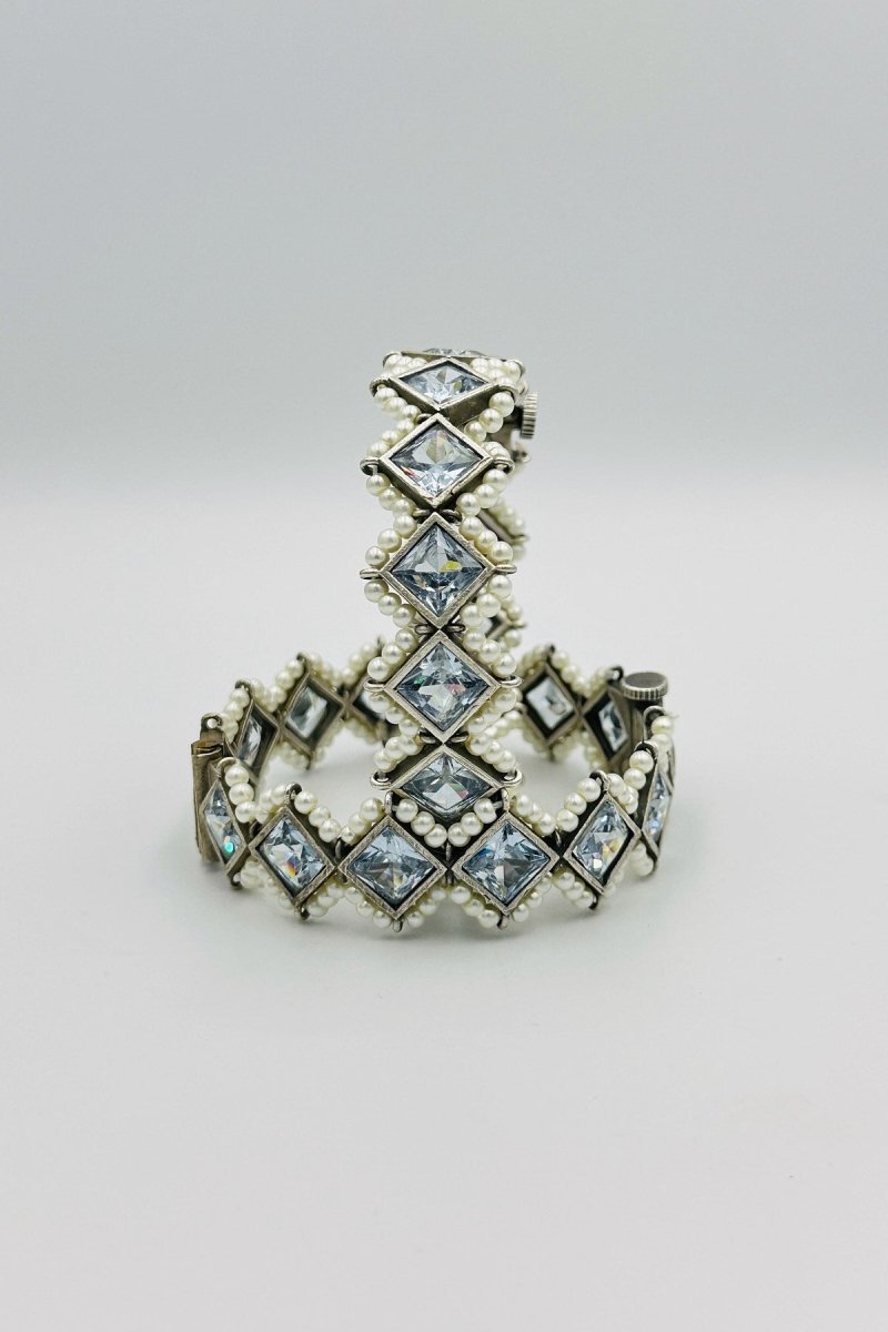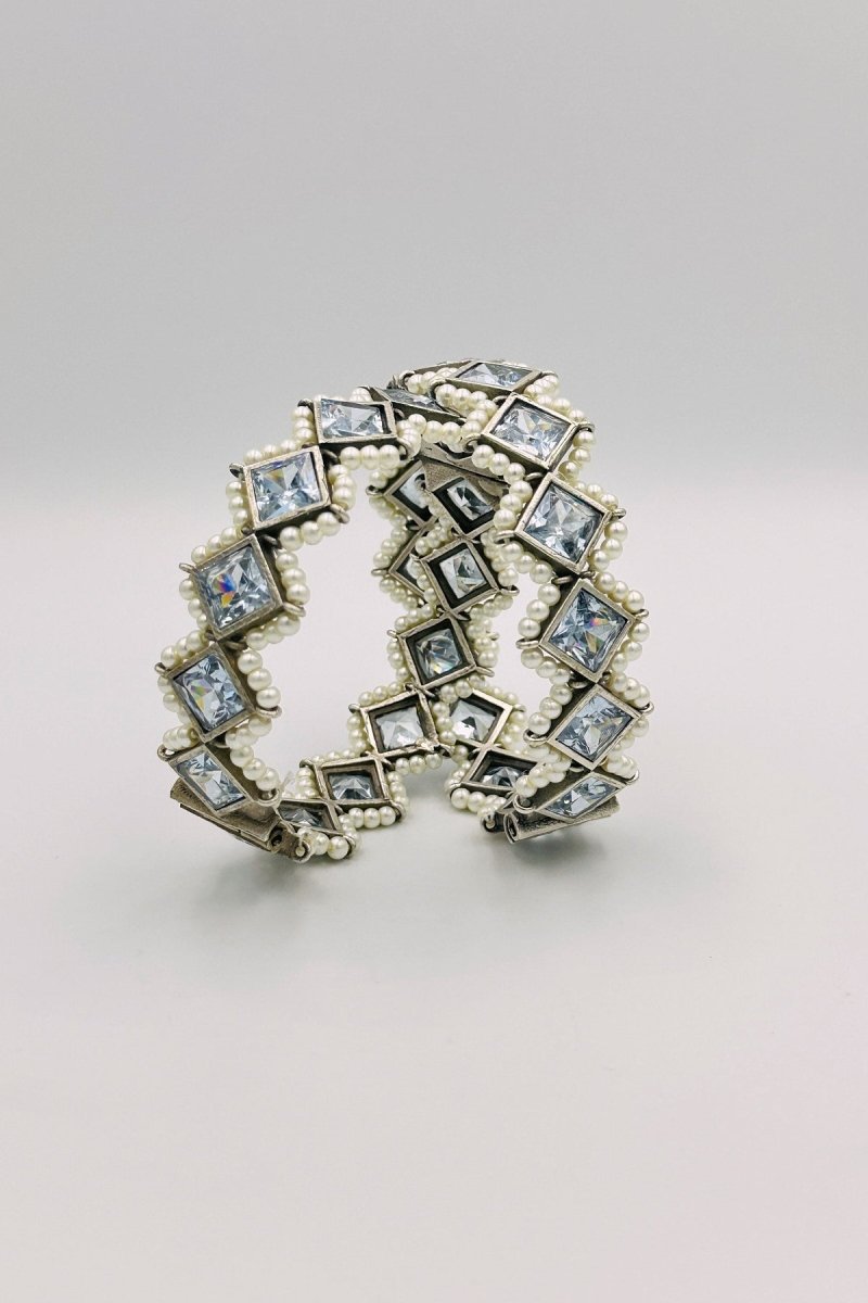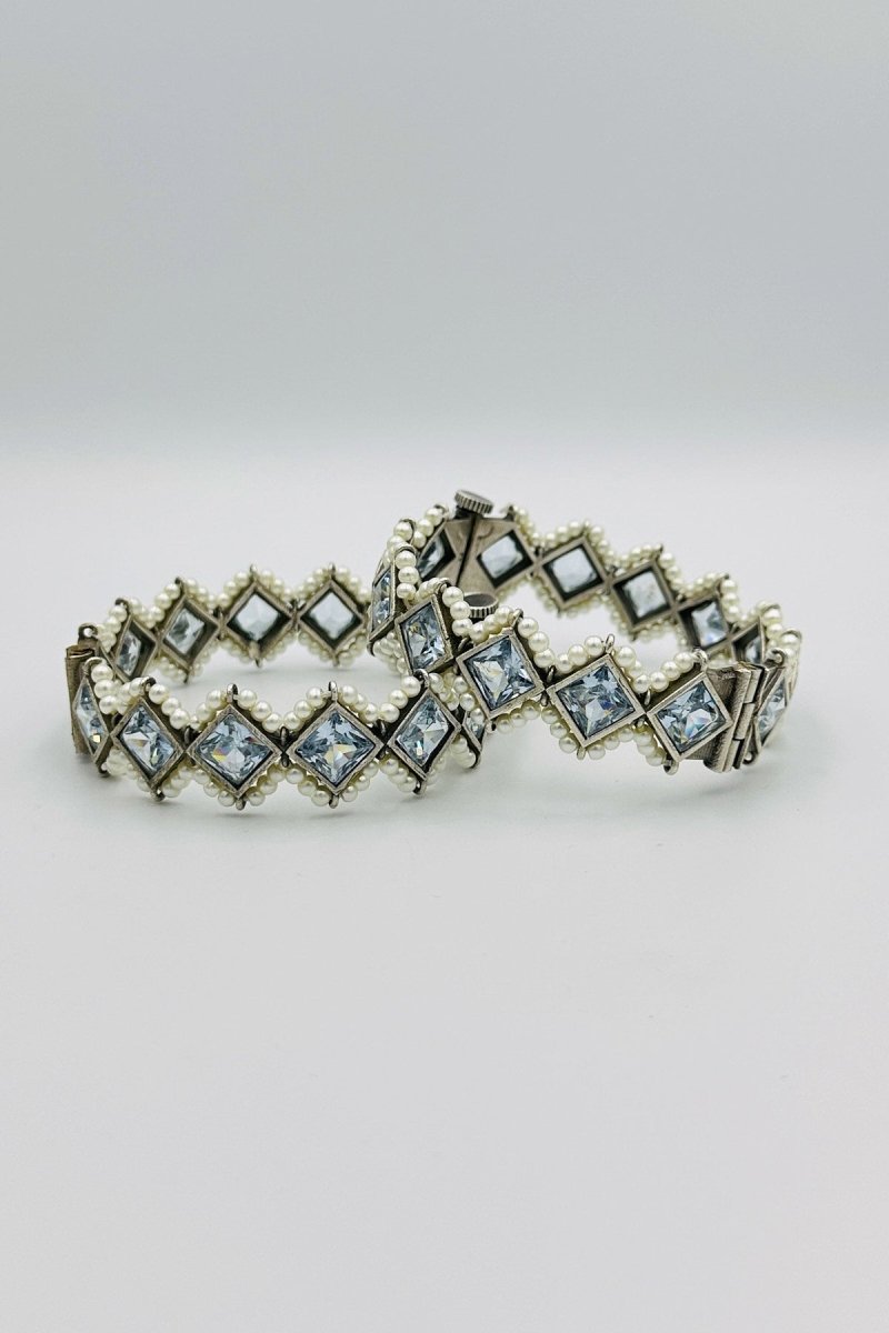 Step into a world of timeless beauty with our Majestic Silver Bangles, a true embodiment of luxury and elegance. These bangles are expertly crafted from premium silver, featuring intricate embossing that enhances their sophisticated design. Adorned with radiant white marquise-shaped stones, each bangle glows with a pure and captivating brilliance. The addition of lustrous pearls encircling the stones adds a layer of classic refinement, making these bangles perfect for any occasion. Whether for a special event or everyday elegance, these bangles will add a touch of grandeur to your look.