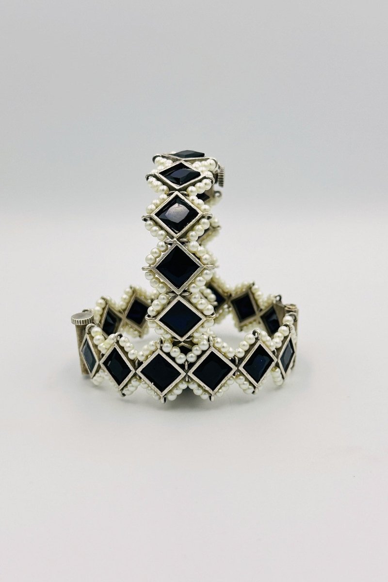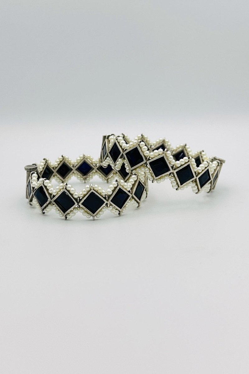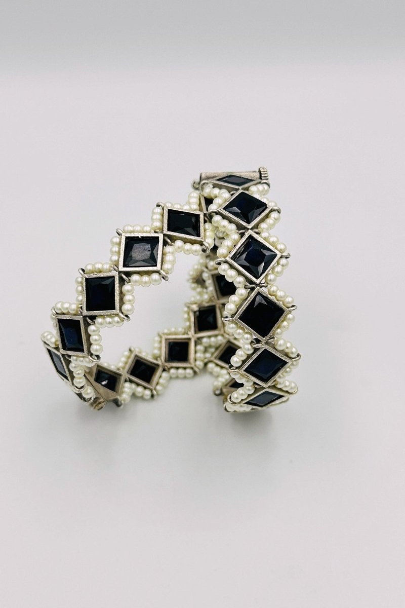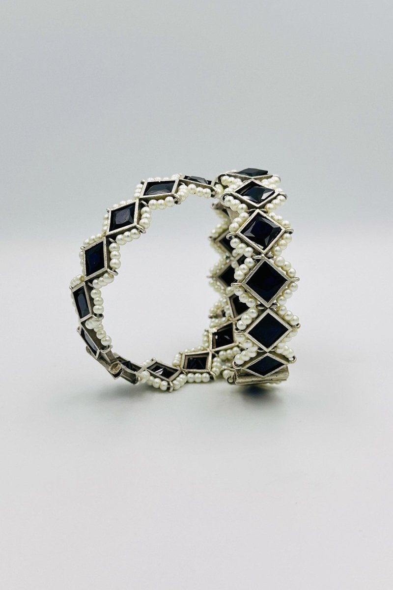 Elevate your style with our Majestic Silver Bangles, a perfect fusion of luxury and modern elegance. These bangles are meticulously crafted from premium silver, featuring intricate embossing that highlights their sophisticated design. Adorned with striking black marquise-shaped stones, each bangle exudes a bold and captivating allure. The dramatic black stones are beautifully framed by lustrous pearls, creating a striking contrast that adds a touch of timeless sophistication. Ideal for special occasions or to bring an element of refined drama to your everyday attire, these bangles are a statement of exquisite craftsmanship and elegance. Make these stunning silver bangles the centerpiece of your jewelry collection, radiating unmatched grace and style.