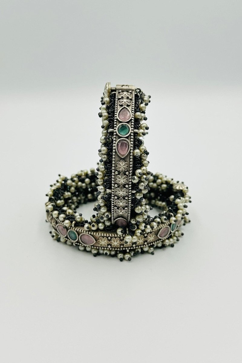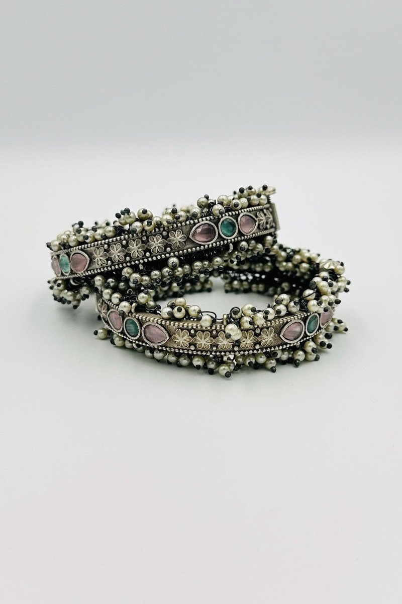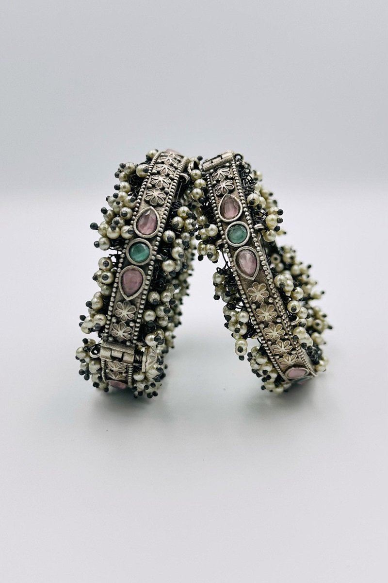 Spring Harmony: Pink and Green Pearl-Accented Silver Bangles - swadeshsouq.com
