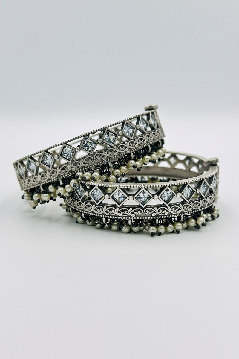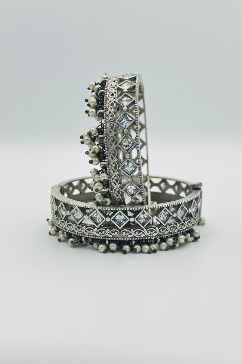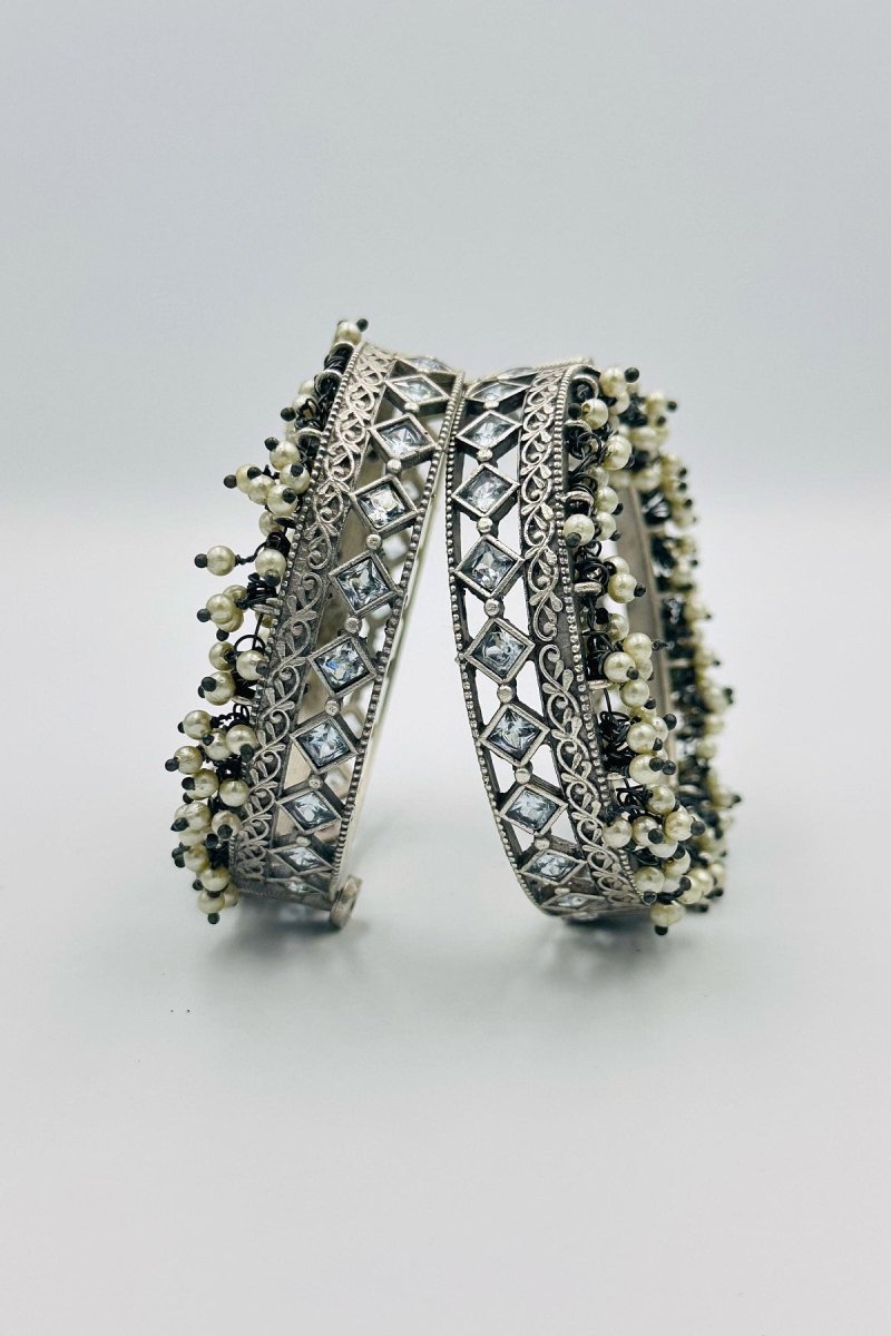 Timeless Silver Bangles with White Crystal Stones and Pearls - swadeshsouq.com