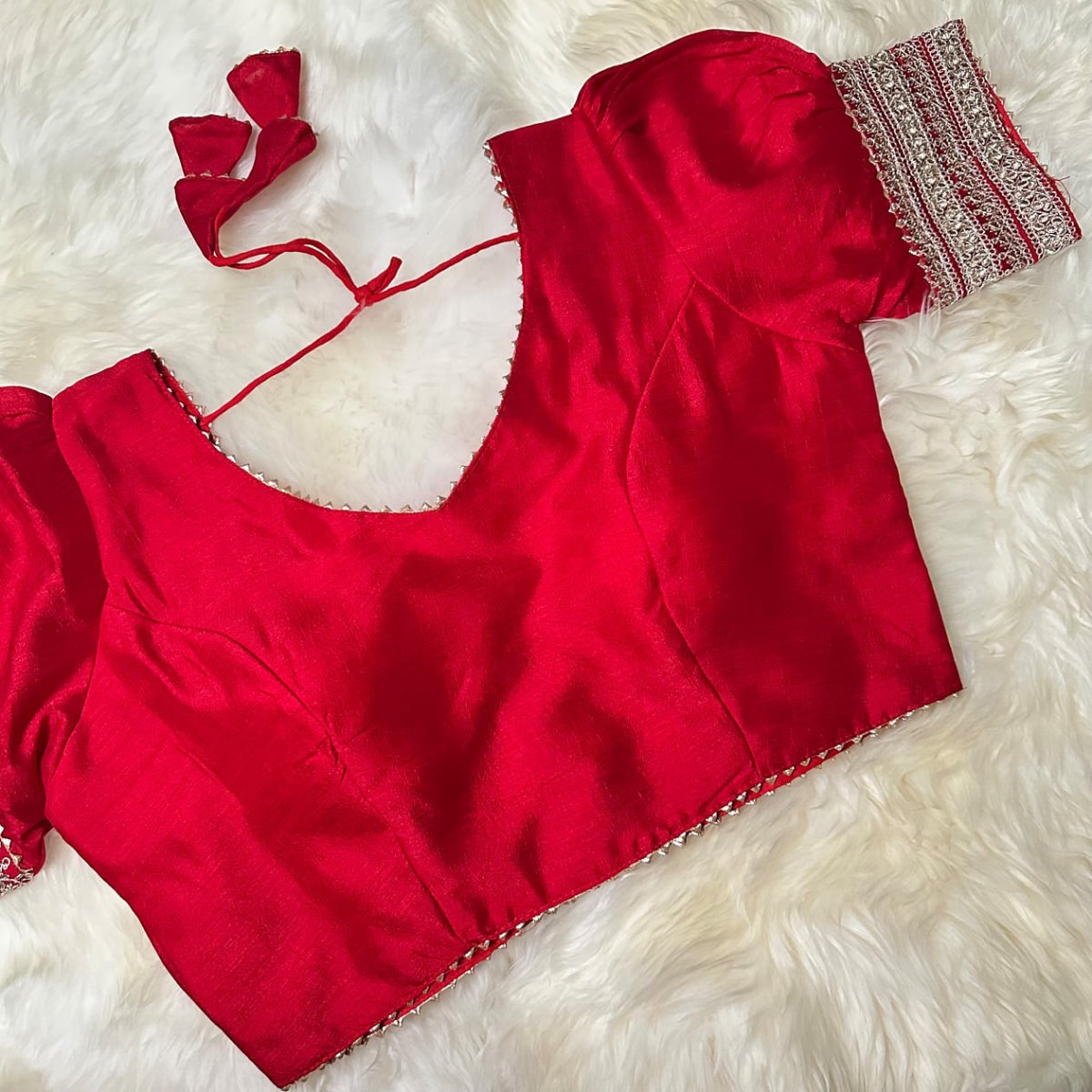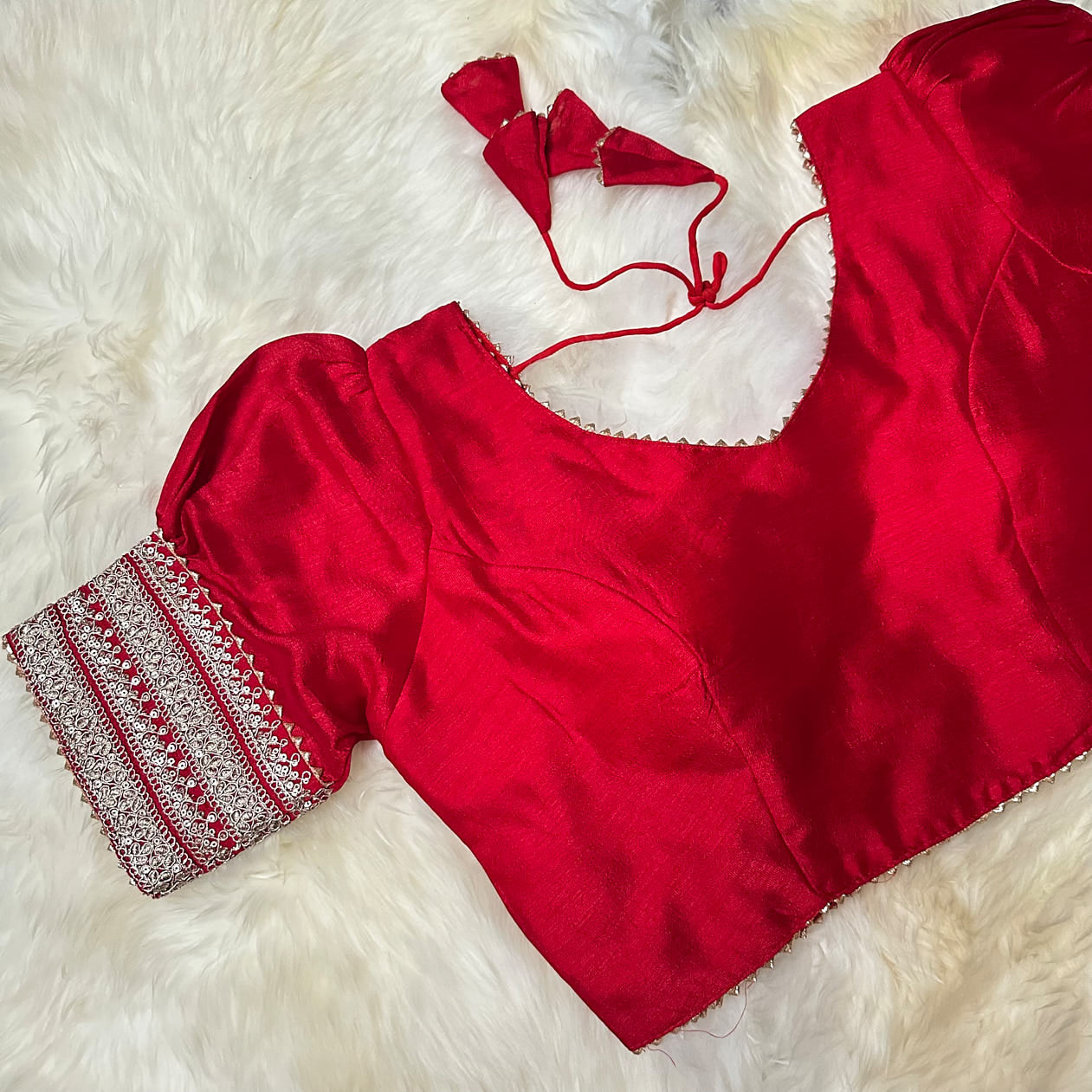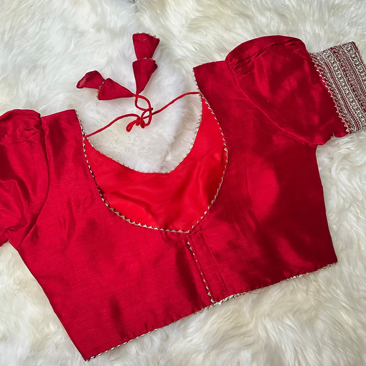 Make a bold and beautiful statement with our Crimson Red Silk Blouse, exquisitely crafted to blend tradition with trend. The luxurious silk fabric radiates festive charm, while the elegant puff sleeves add a touch of vintage allure. Perfect for celebrations, weddings, or festive gatherings, this blouse brings unmatched vibrance to your ethnic ensemble.