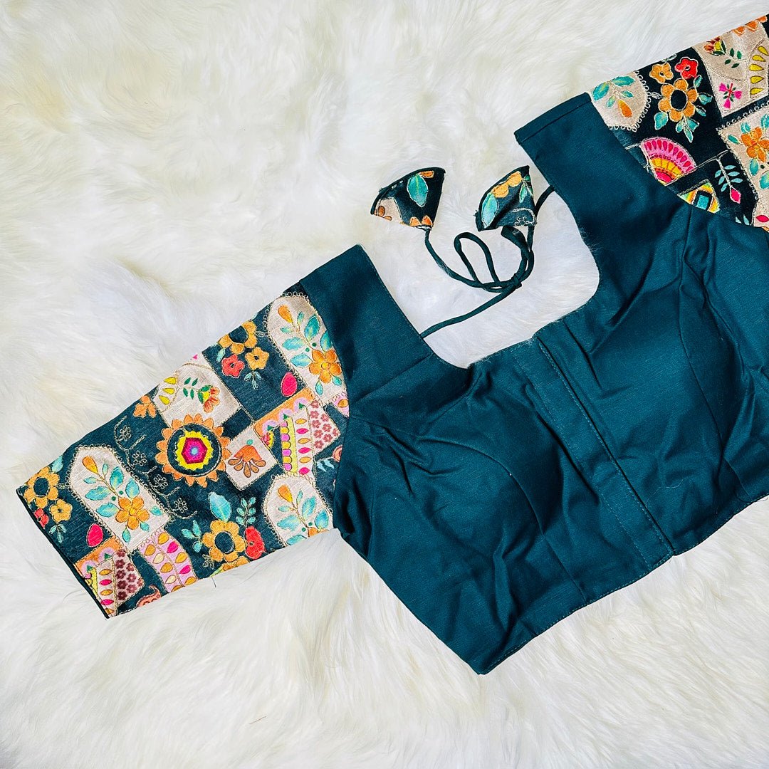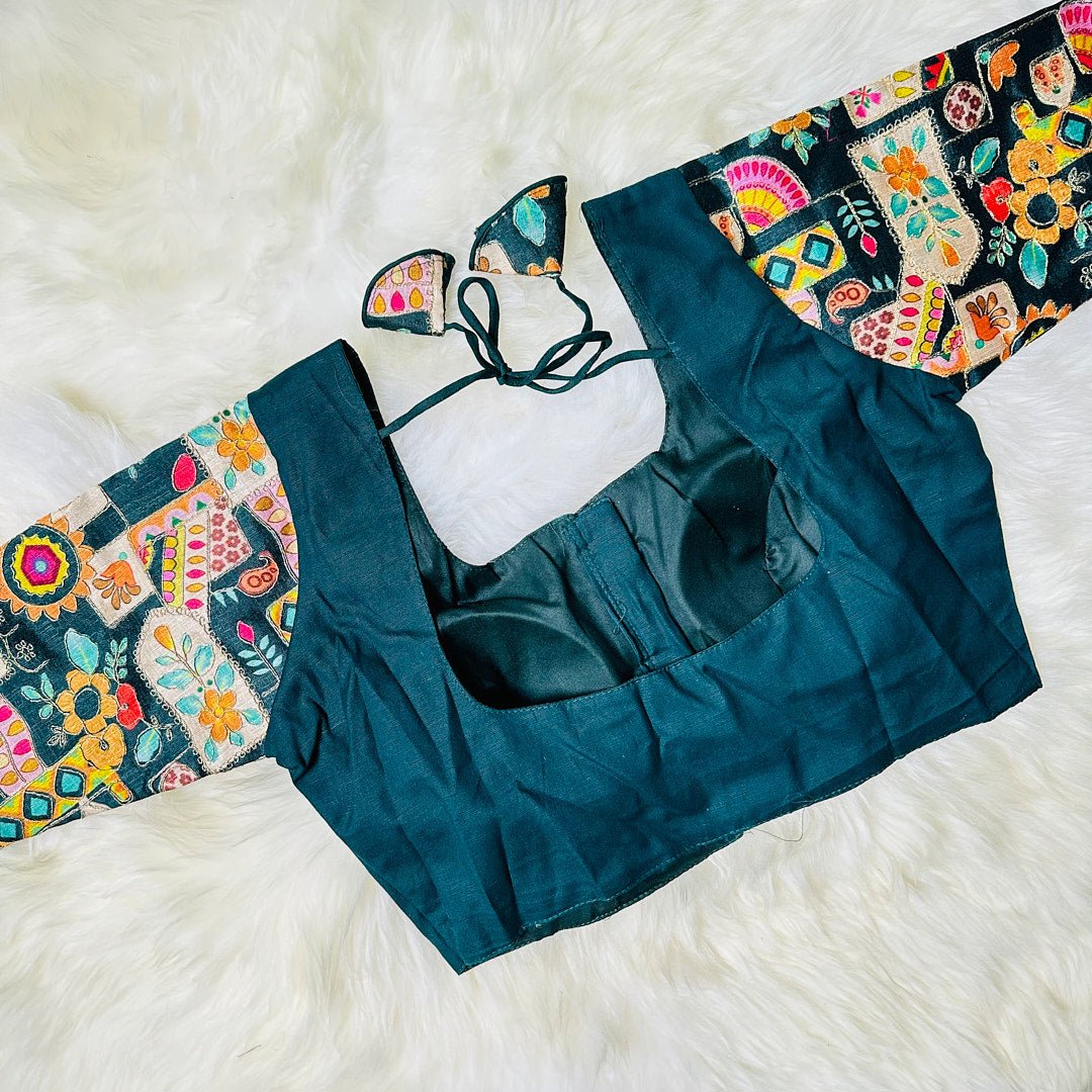 This exquisite blouse boasts a gorgeous and vibrant teal blue hue that exudes sophistication and charm. Its contrasting sleeves add a playful and modern twist, showcasing a beautiful design that seamlessly blends contemporary fashion with classic elegance. This garment is sure to elevate any outfit and make a statement with its stunning beauty, perfect for any occasion where you want to radiate confidence and style.