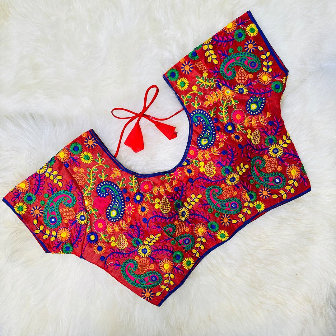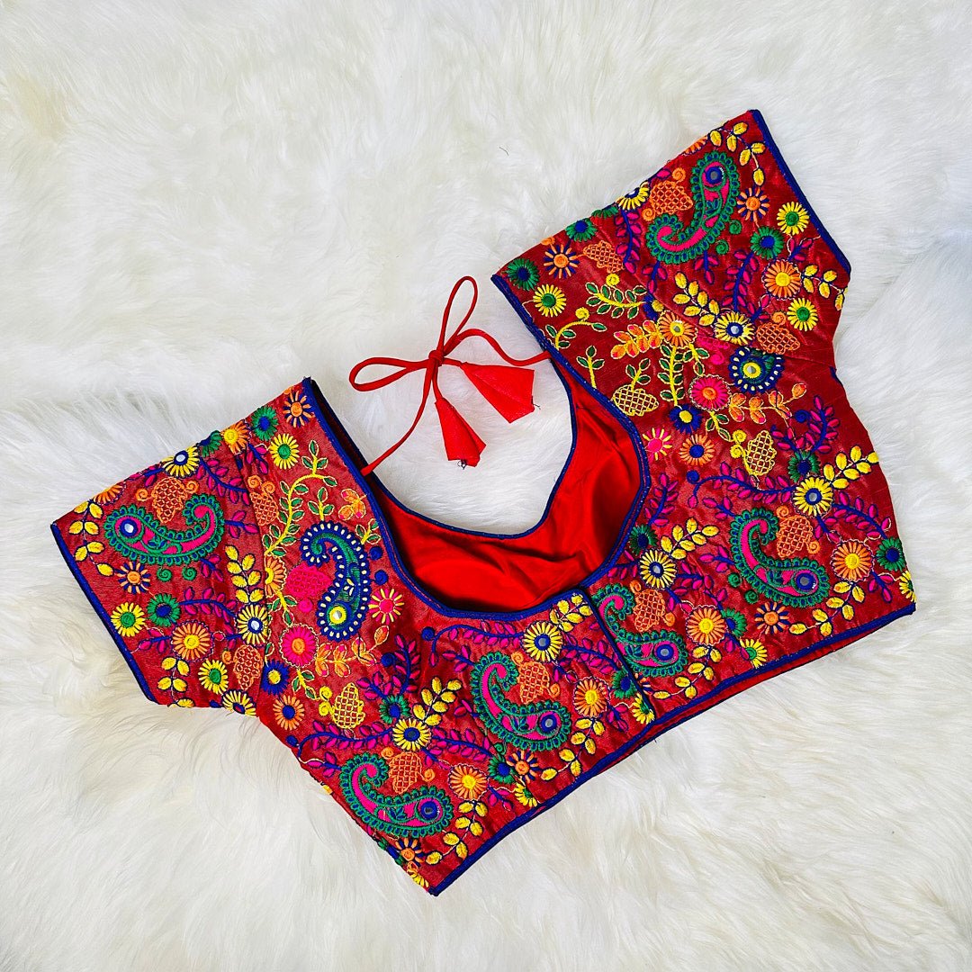 Upgrade your ethnic wear collection with this stunning brick red blouse featuring intricate multi-colored embroidery. Made with high-quality fabric, this blouse offers both style and comfort. The brick red color adds a touch of sophistication and is sure to turn heads wherever you go.
