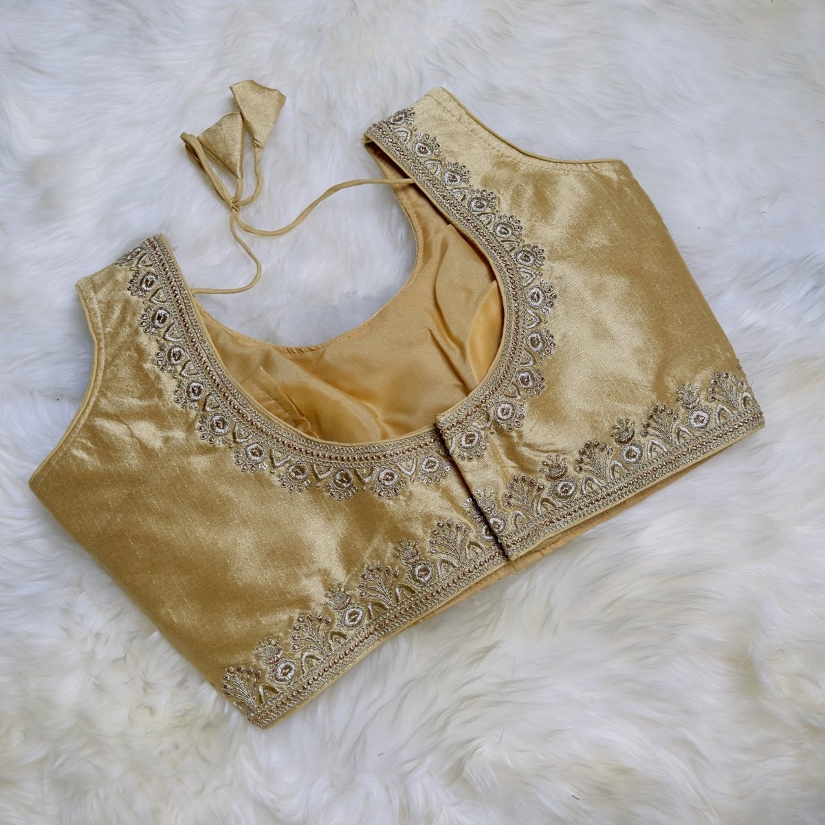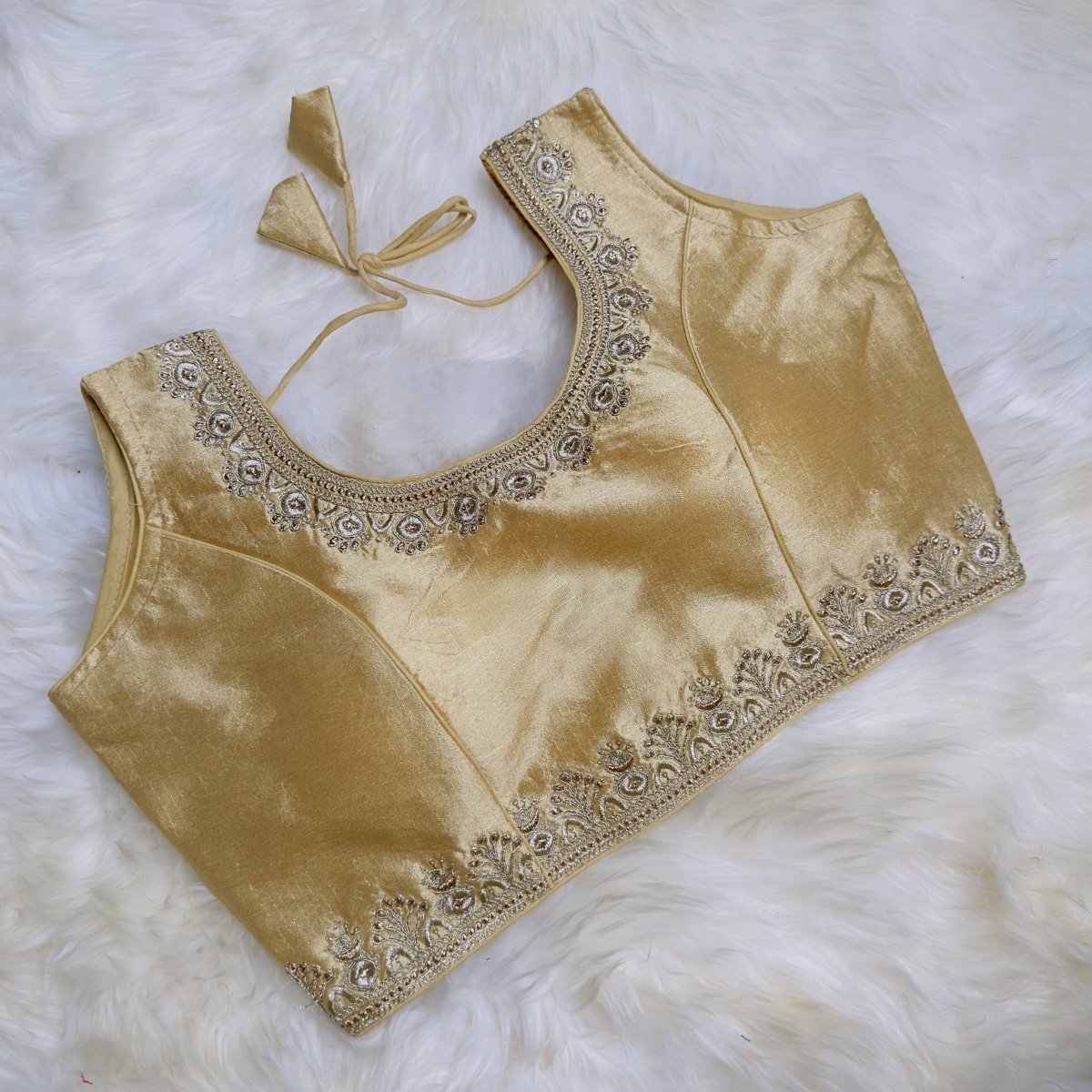 Embrace traditional elegance with this Elegant Gold Blouse featuring Intricate Golden Embroidery. Crafted from high-quality silk, this blouse radiates a subtle sheen that complements the elaborate golden embroidery along the neckline and hemline. Perfect for festive celebrations, weddings, or special occasions, this blouse will make you stand out with its luxurious charm. Sleeves are included for added comfort, allowing for a versatile and polished look.