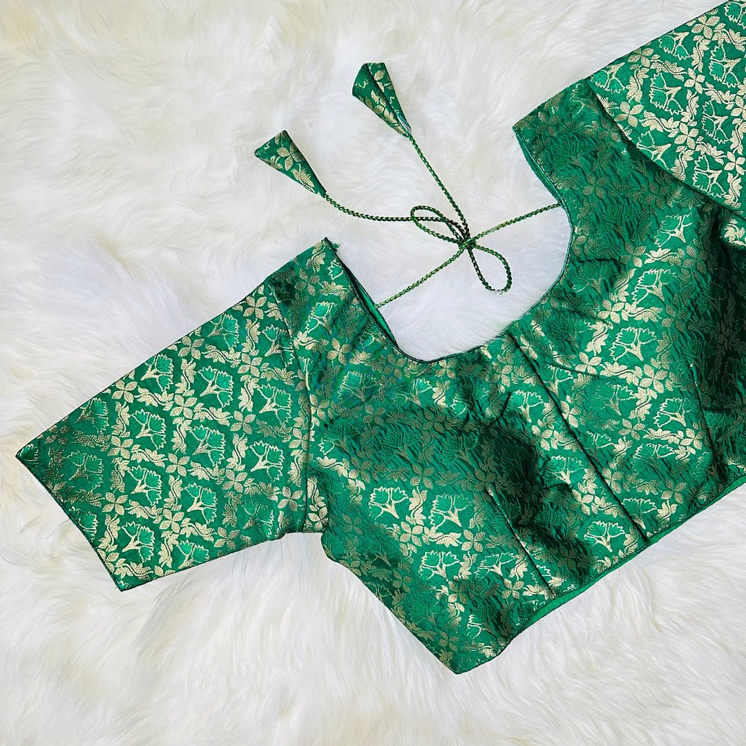 dd a touch of serenity to your ethnic wear with this exquisite Rama green brocade blouse, adorned with intricate golden floral patterns. The luxurious fabric and delicate detailing create a look that exudes elegance and sophistication, perfect for any formal event. The golden floral patterns catch the light and create a mesmerizing effect, making this blouse a true showstopper. The serene Rama green color adds a touch of calmness and purity, making it a perfect addition to your festive wardrobe. The blouse is tailored to perfection to fit you snugly and provide maximum comfort.
