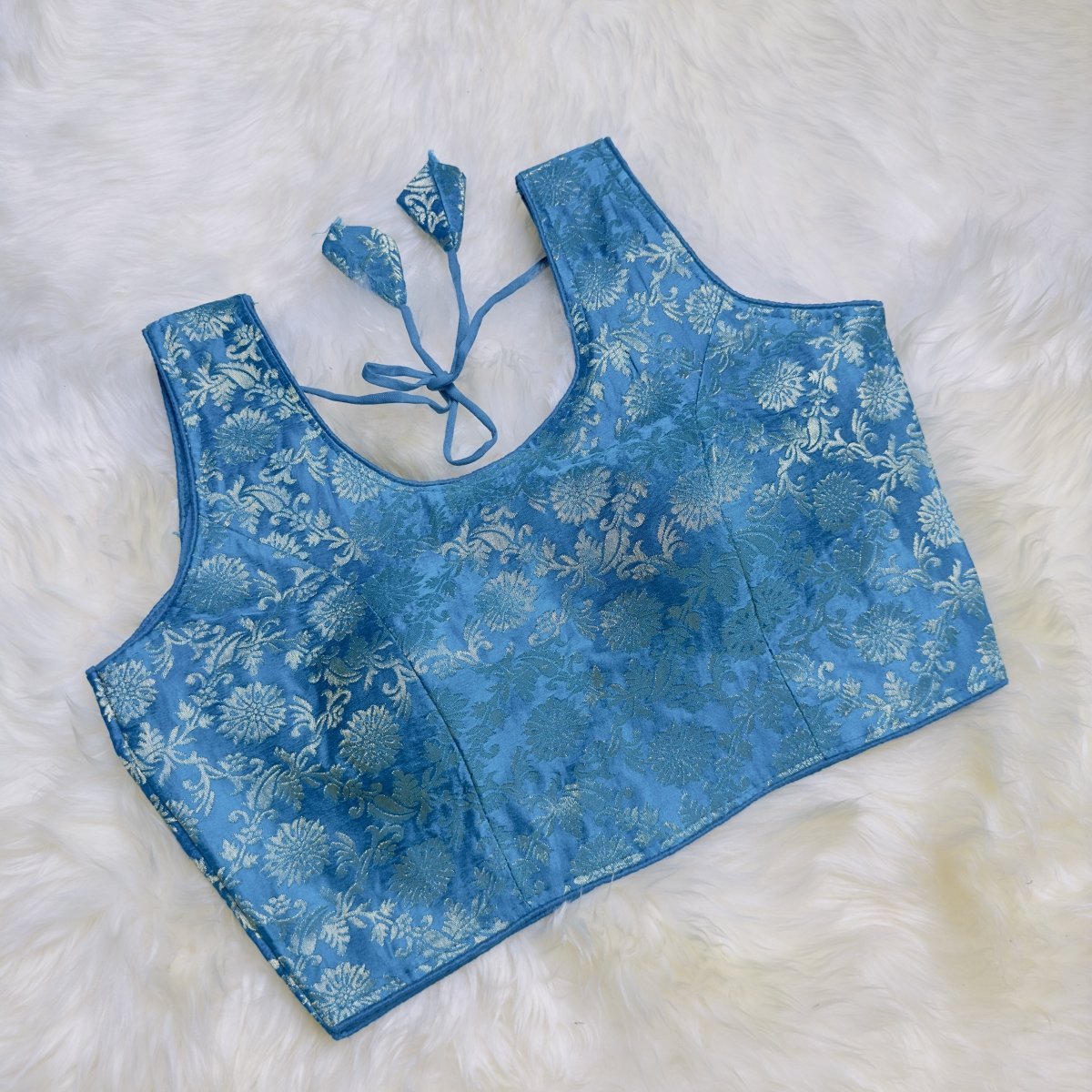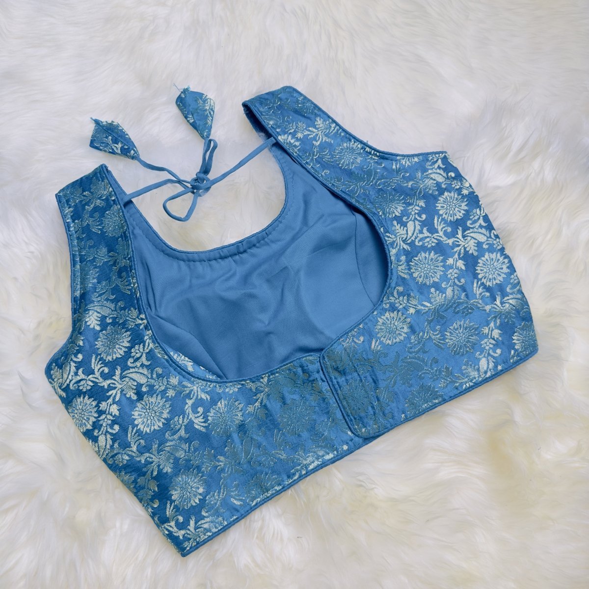 Add a touch of ethereal charm to your ethnic attire with our Enchanting Deep Sea Blue and Silver Brocade Silk Blouse. This captivating blouse features an intricate floral brocade pattern in a rich deep sea blue shade paired with delicate silver accents, exuding an aura of grace and elegance. Crafted from premium silk, the sleeveless design with a tailored fit makes it a perfect choice for weddings, festive occasions, and grand celebrations. Pair it with a saree or lehenga to create a sophisticated and graceful look that leaves an impression of effortless beauty.