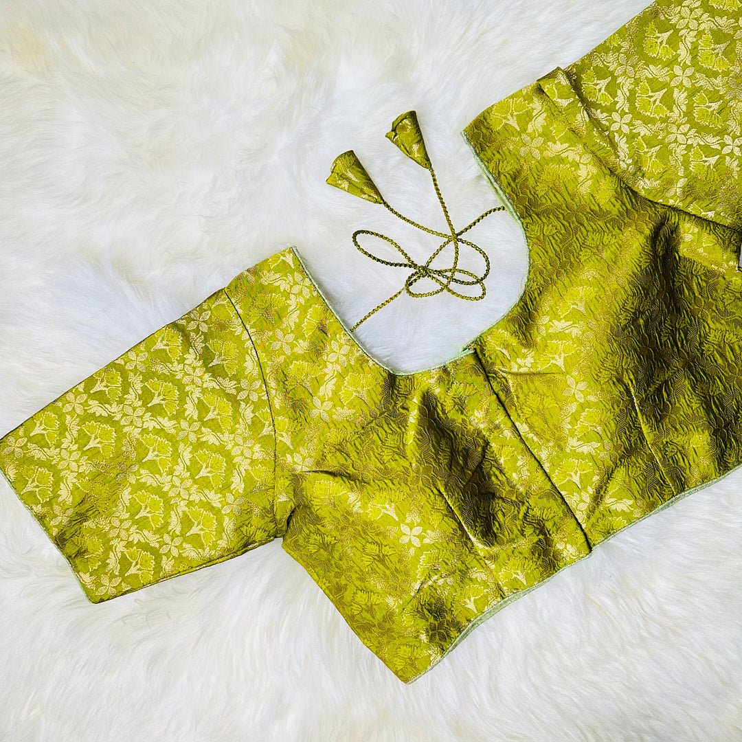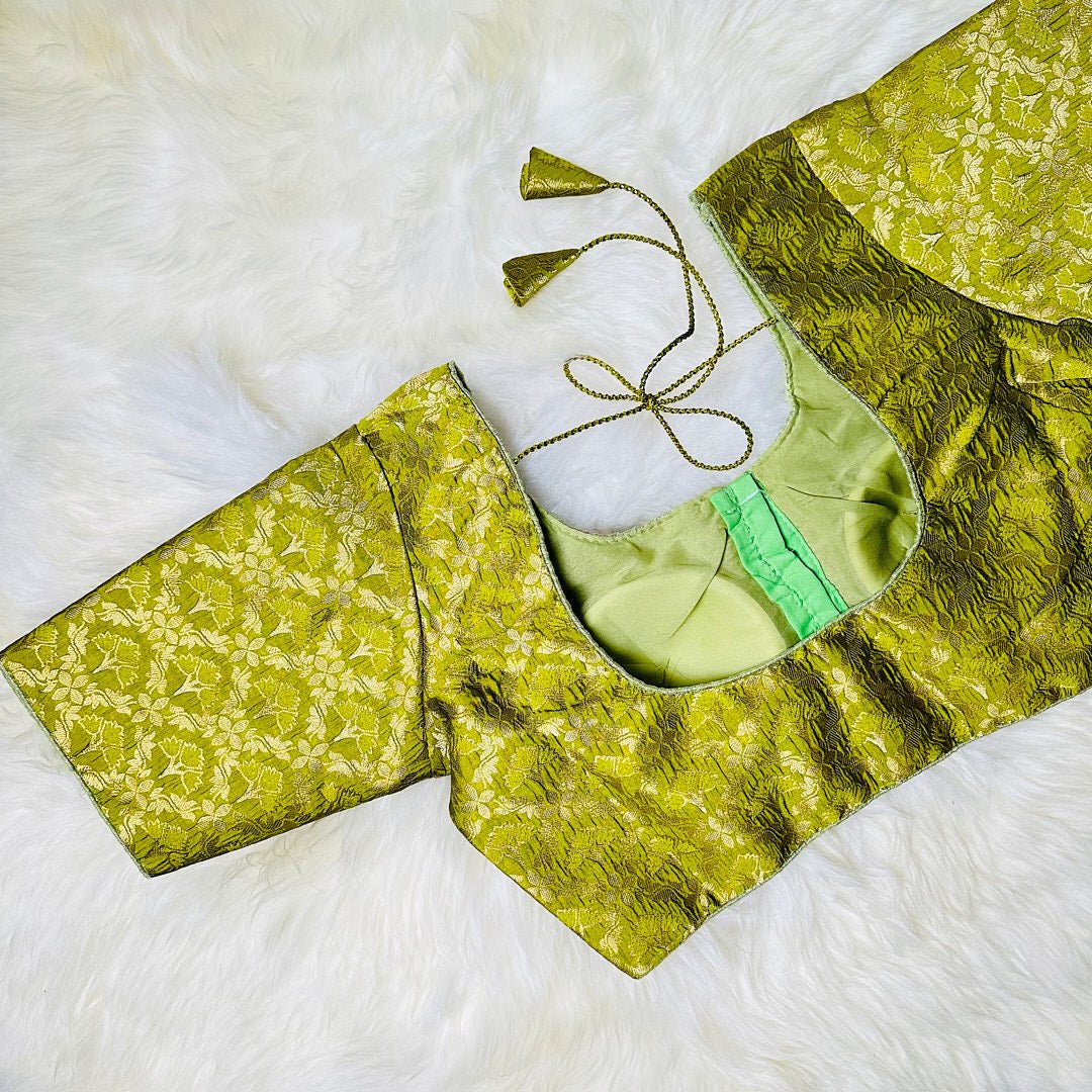 Introducing an exquisite masterpiece of artistry - the Mehndi Green Brocade Blouse adorned with intricate golden floral patterns. This stunning piece boasts a perfect blend of traditional and contemporary style, featuring an eye-catching color palette that complements any occasion. The rich and luxurious brocade fabric is intricately woven to create a stunning texture that adds an extra dimension to the blouse. The intricate golden floral patterns, meticulously crafted by skilled artisans, exude elegance and sophistication, making it a perfect choice for any festive occasion. This blouse is a true embodiment of timeless beauty and a must-have addition to any fashion-conscious wardrobe.