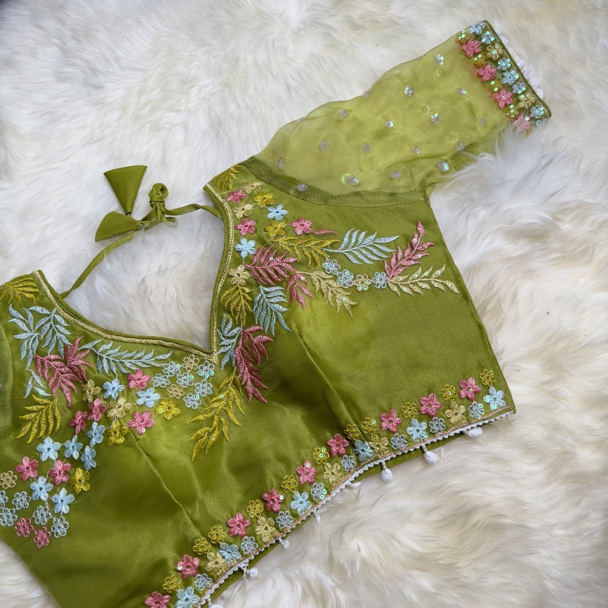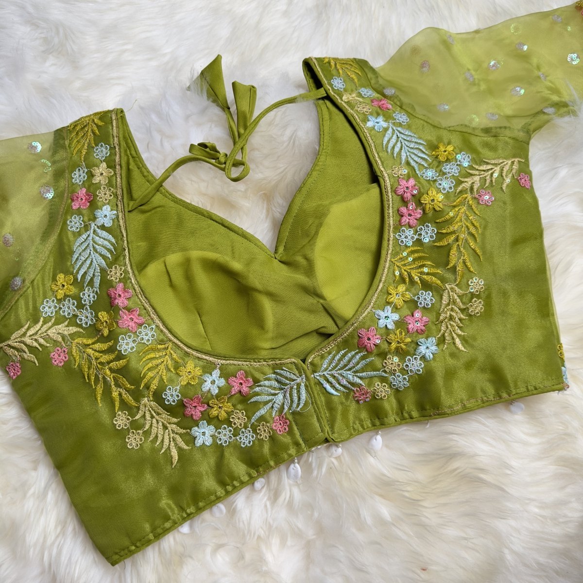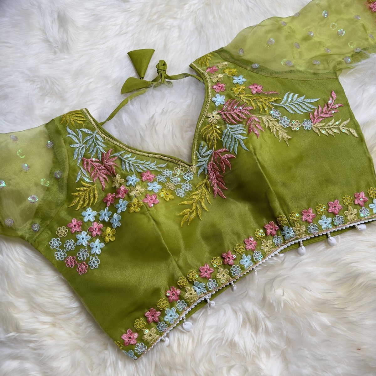 Elevate your ethnic look with this stunning green organza blouse, beautifully adorned with intricate floral embroidery. The blouse features elbow-length sleeves and charming shell tassels at the waist and sleeves, adding an extra touch of elegance. Crafted to perfection, this blouse is perfect for festive occasions, weddings, and traditional gatherings, effortlessly complementing sarees and lehengas with its unique charm.