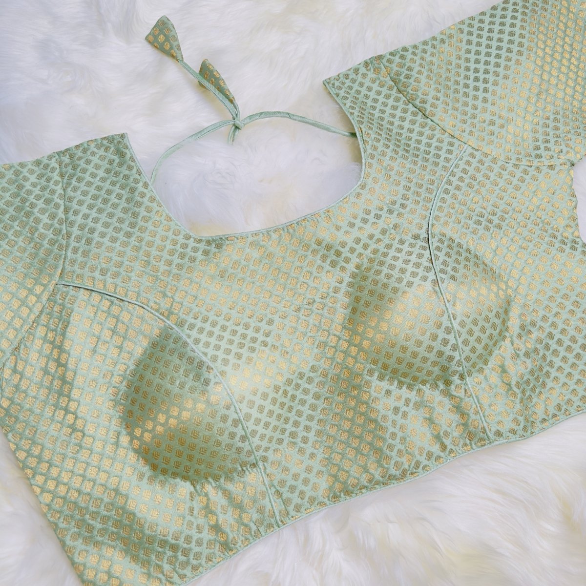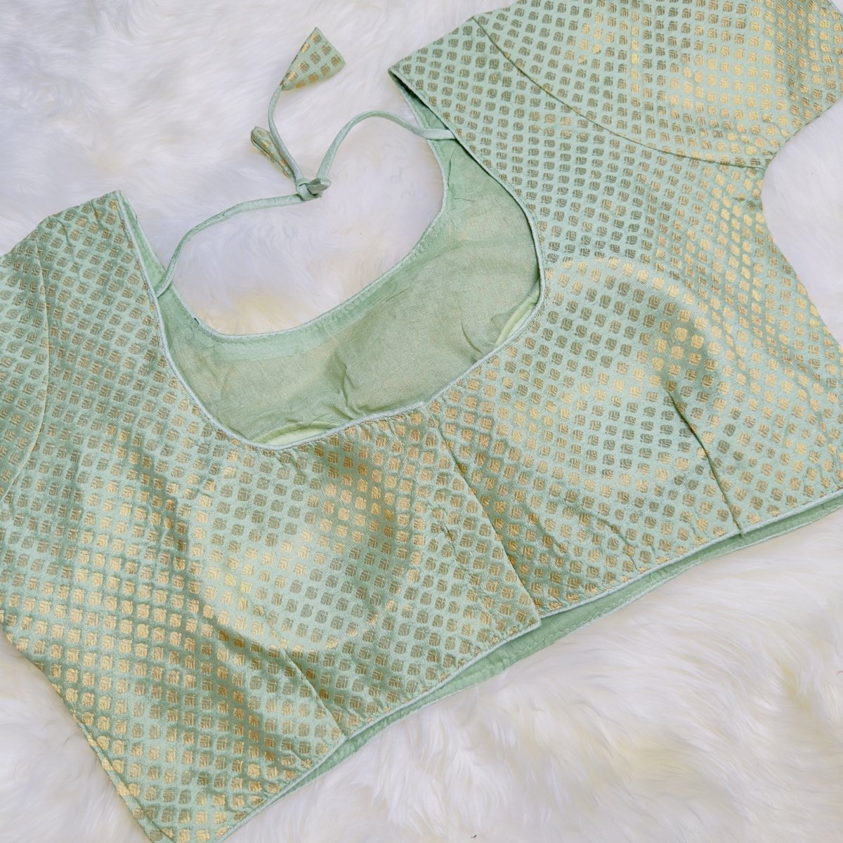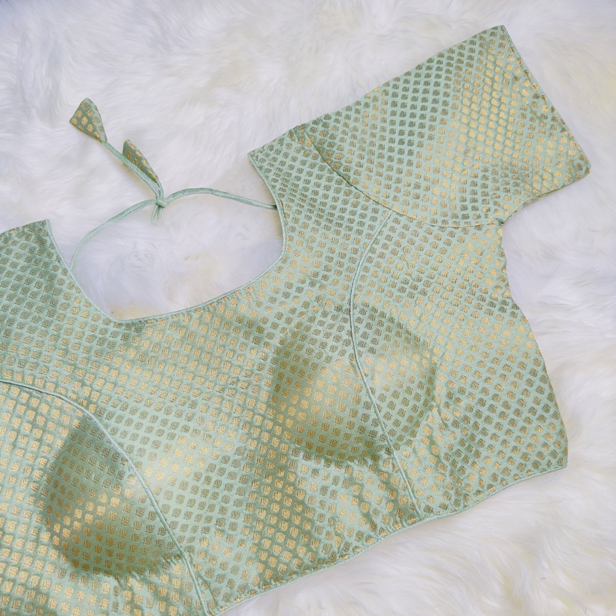 Elevate your traditional style with our Mint Green Silk Blouse with Attached Sleeves. This exquisite blouse features a refreshing mint green silk fabric adorned with intricate golden accents, delivering a unique combination of elegance and charm. The attached sleeves provide a classic silhouette, making it the perfect choice for weddings, parties, or festive events. Crafted to ensure a tailored fit, this blouse effortlessly complements your sarees or lehengas, adding an aura of graceful elegance to your ensemble.