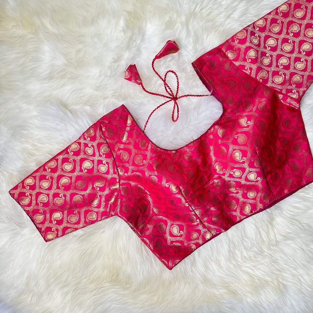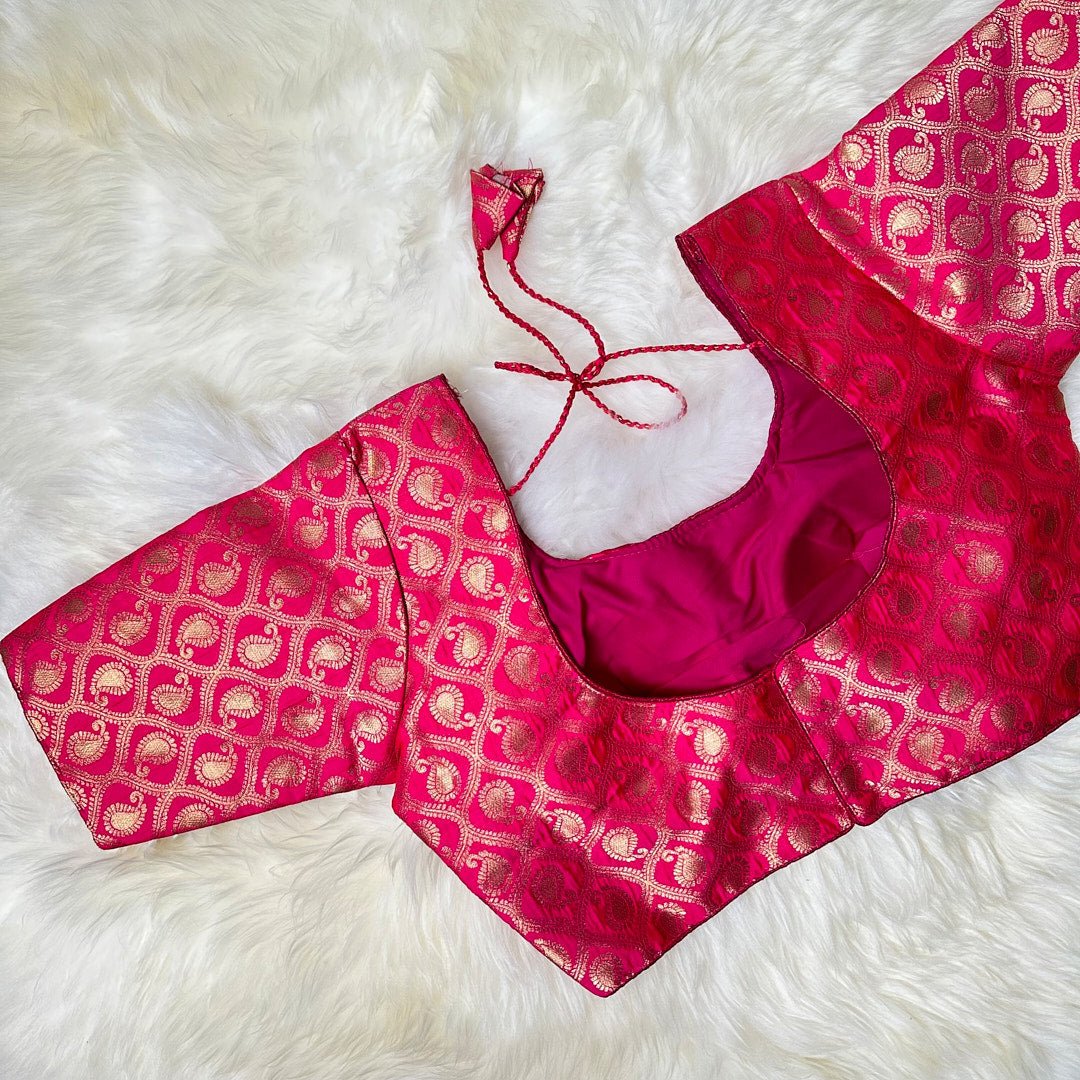 Radiate Grace with a Pink Brocade Blouse with Golden Mango Motifs. - swadeshsouq.com