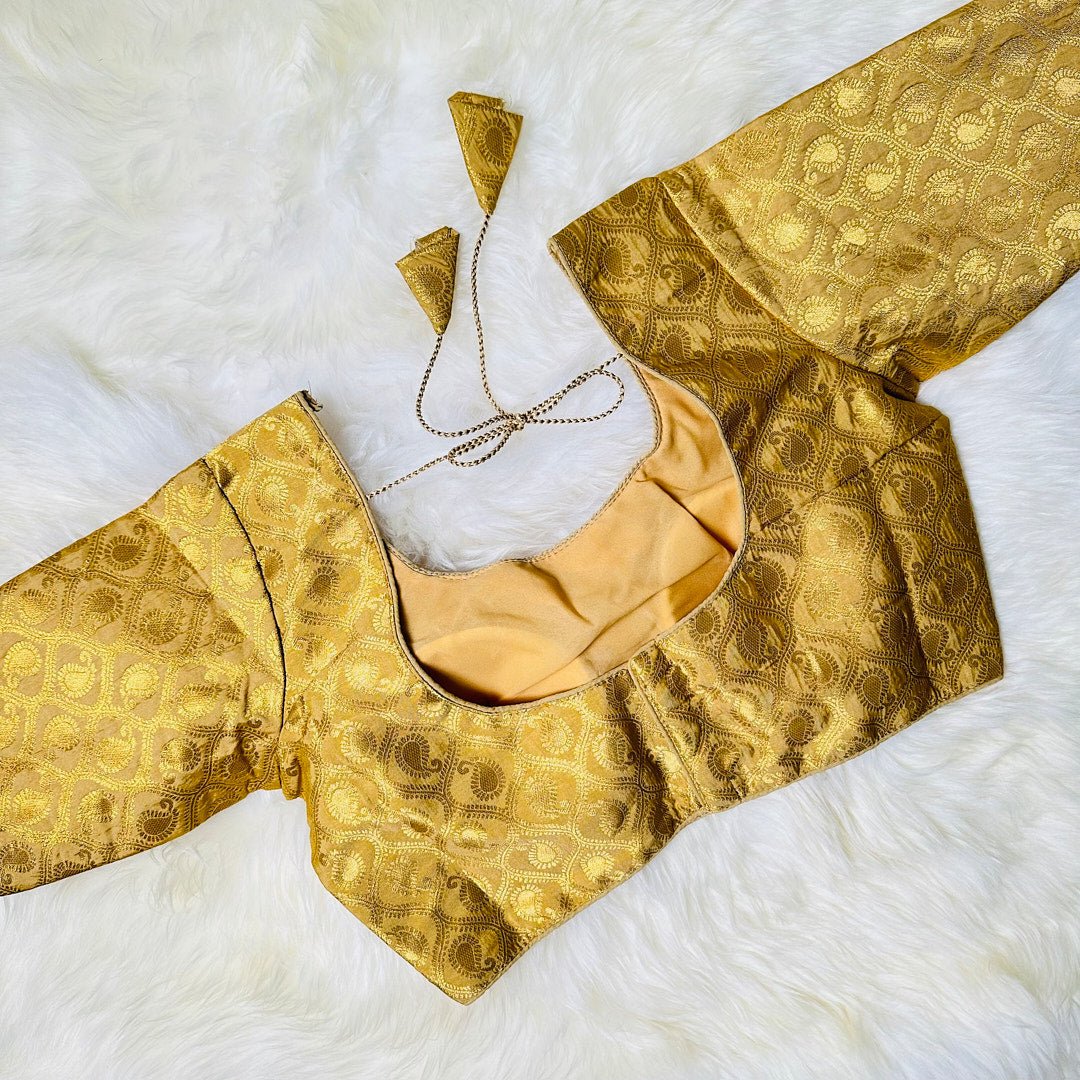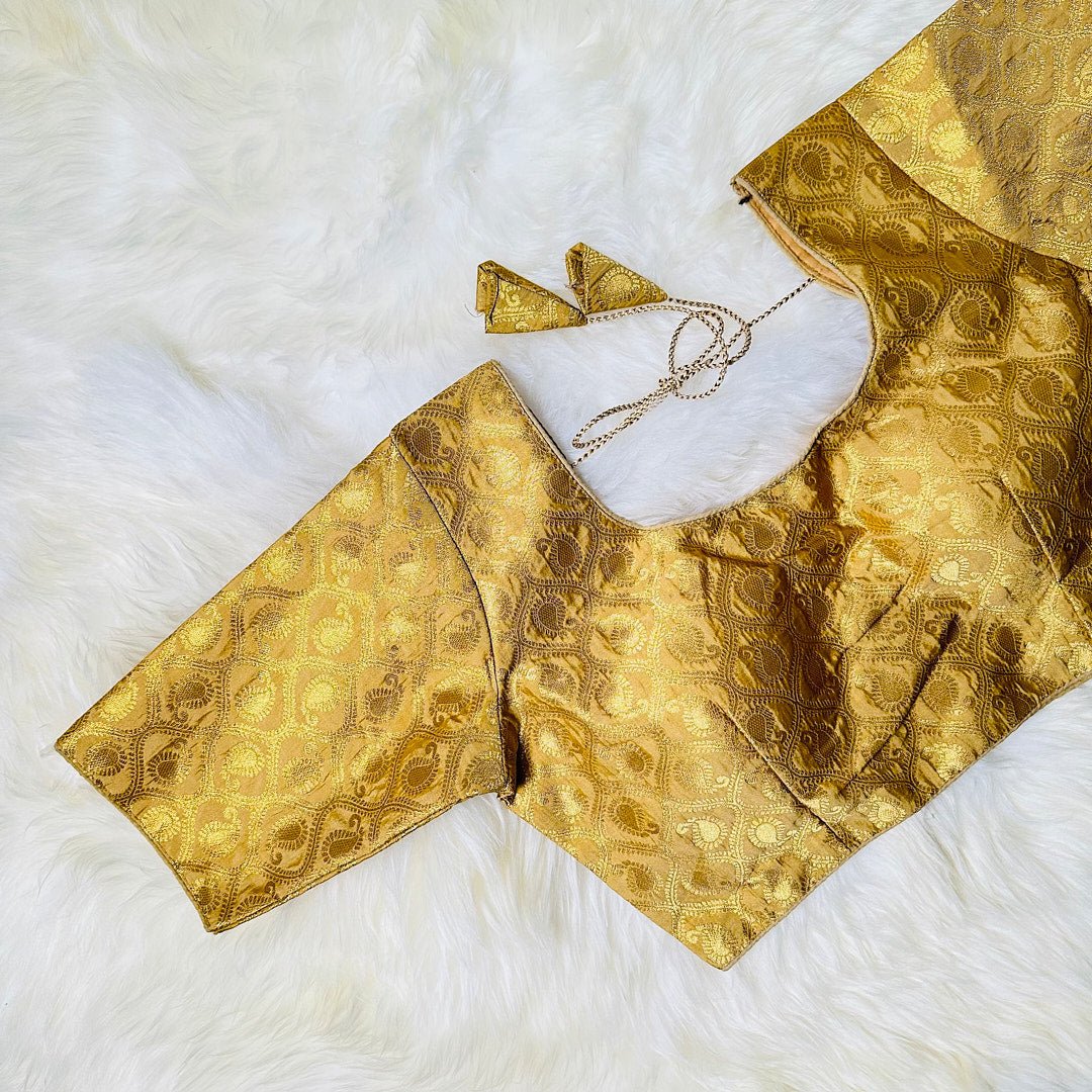 Bring a touch of tradition to your ethnic wear with this beautiful golden cream brocade blouse, adorned with intricate golden mango motifs. The rich fabric and delicate detailing make it a perfect addition to your festive wardrobe. The golden mango motifs create a mesmerizing effect, while the golden cream color adds a touch of regality to your look. The blouse is tailored to perfection to fit you snugly and provide maximum comfort. Whether it's a wedding or a special occasion, this blouse is sure to make a statement. Show off your sense of style and elegance with this stunning piece that is sure to stand the test of time.