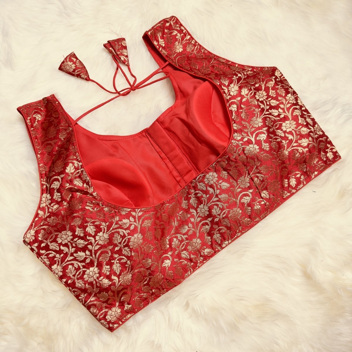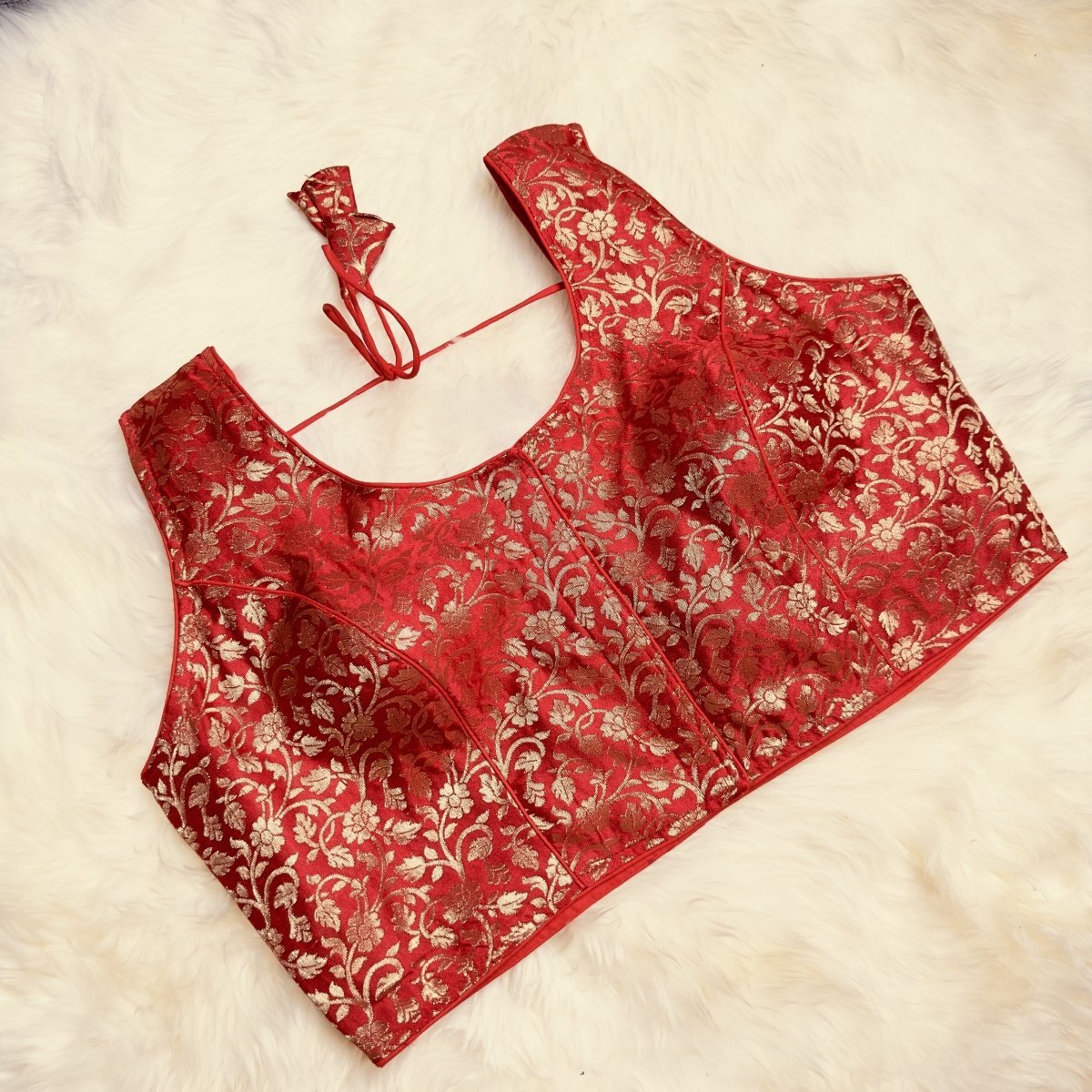 Embrace the allure of classic elegance with our Regal Red Brocade Blouse with Intricate Floral Pattern. This blouse, featuring rich brocade fabric in a stunning deep red hue with golden floral motifs, is a perfect blend of tradition and luxury. The sleeveless design provides a modern touch while maintaining the charm of ethnic wear. Ideal for festive occasions, weddings, and celebrations, this blouse effortlessly elevates any saree or lehenga ensemble, ensuring you stand out with grace and sophistication.