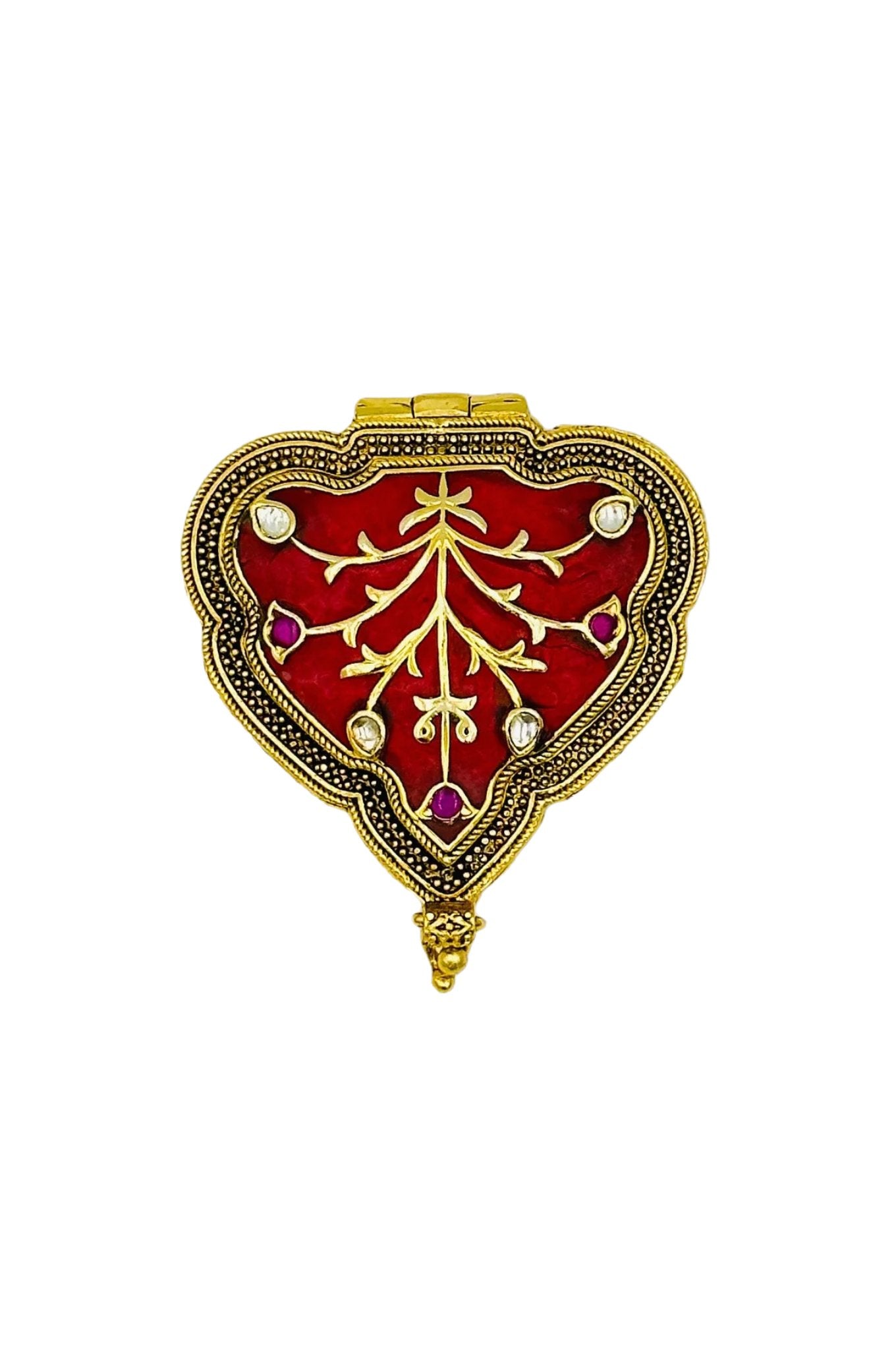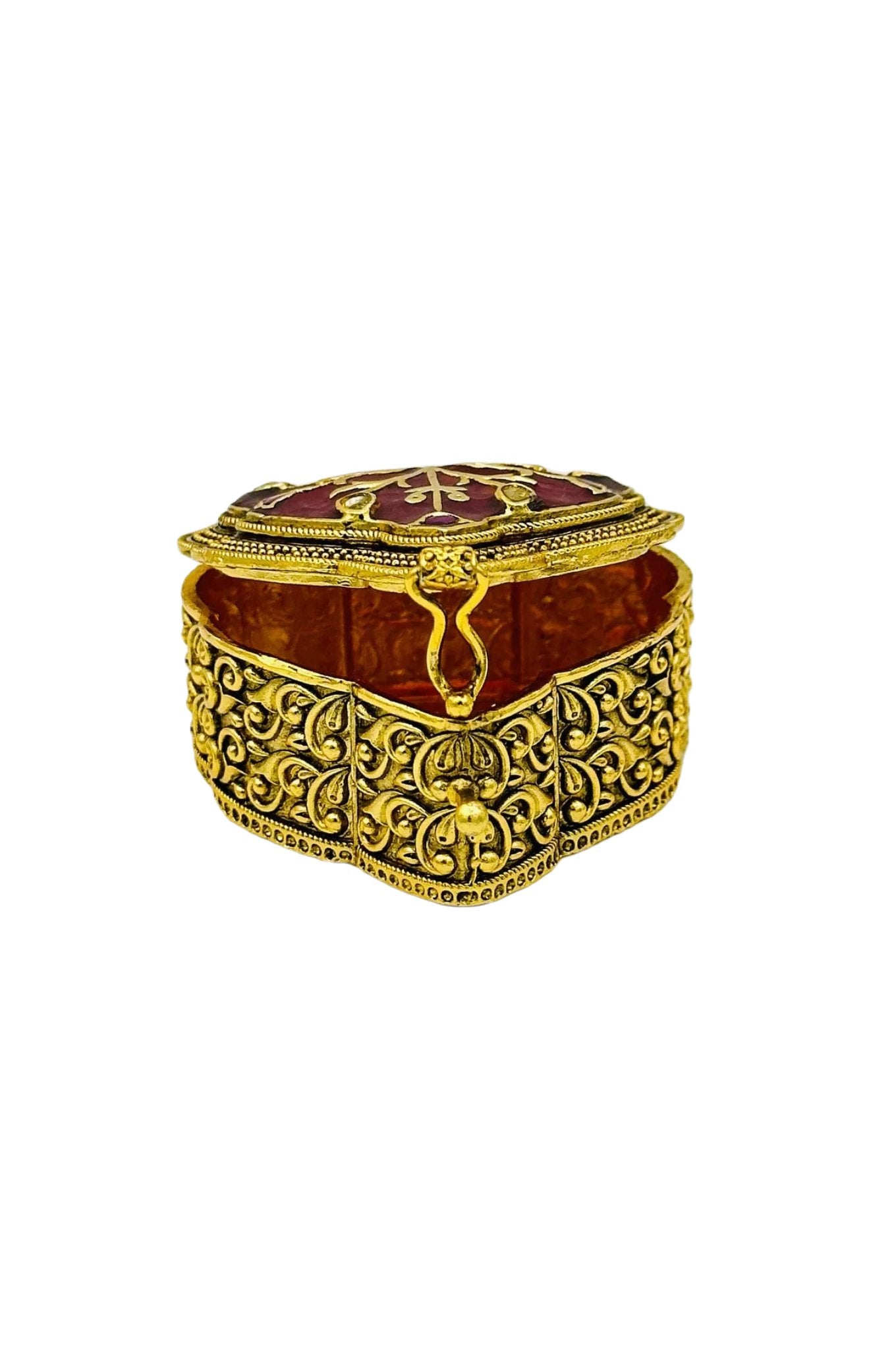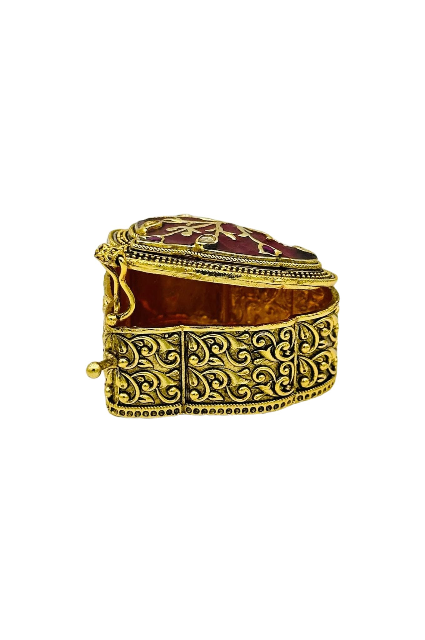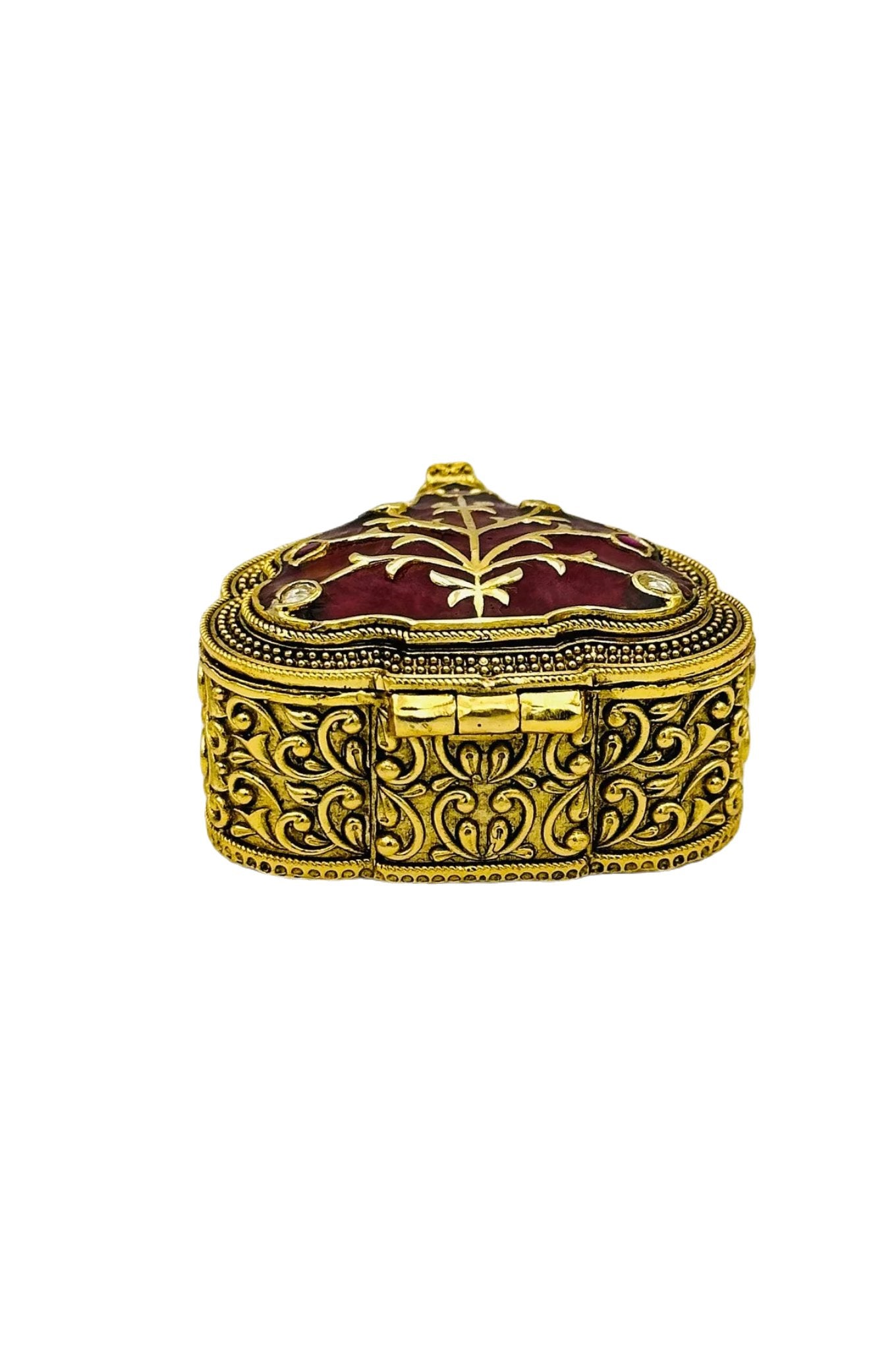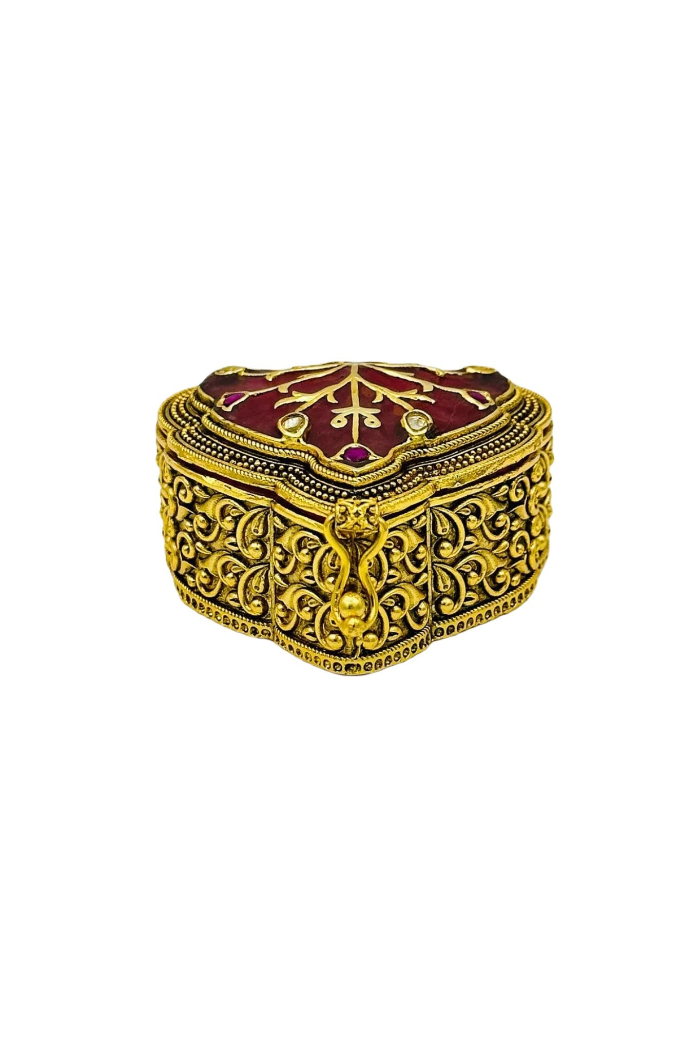 Unveil the depth and allure of our maroon Jadau box, a celebration of vintage elegance. Imbued with a rich burgundy hue, the box features the detailed artistry of Nagas designs, echoing tales of bygone eras. The lustrous filigree work, encasing the radiant Jadau stone, amplifies its grandeur, creating a piece that seamlessly marries tradition with refined aesthetics.