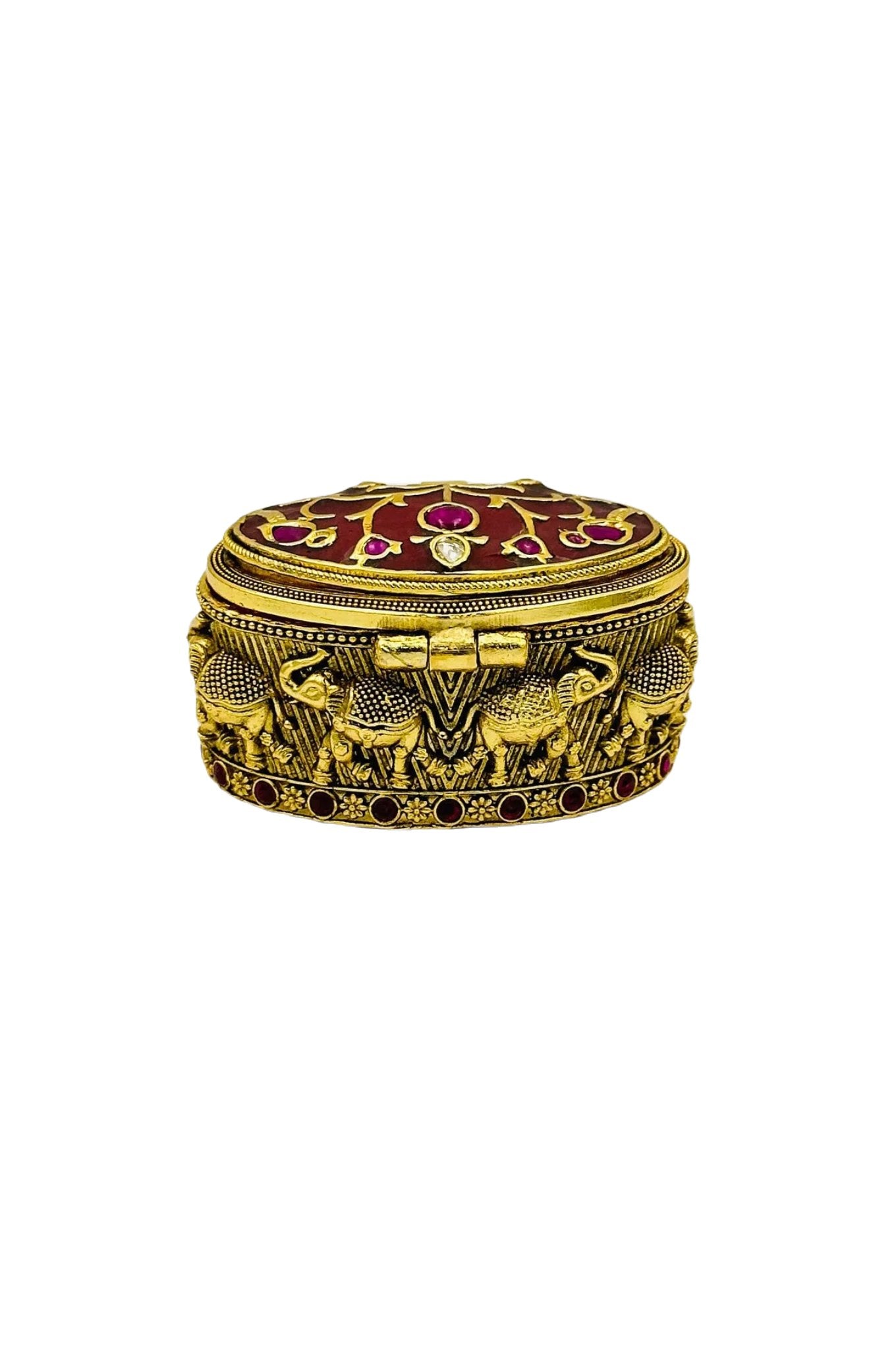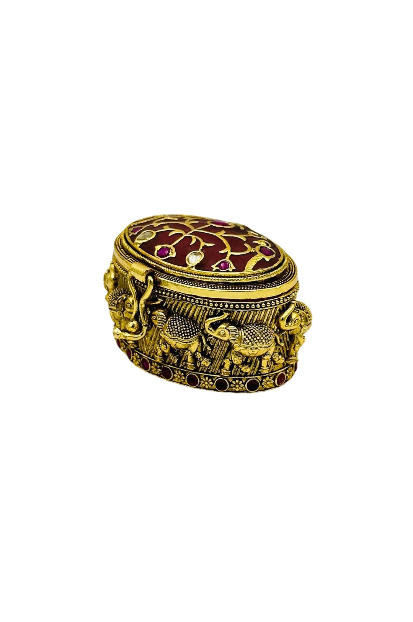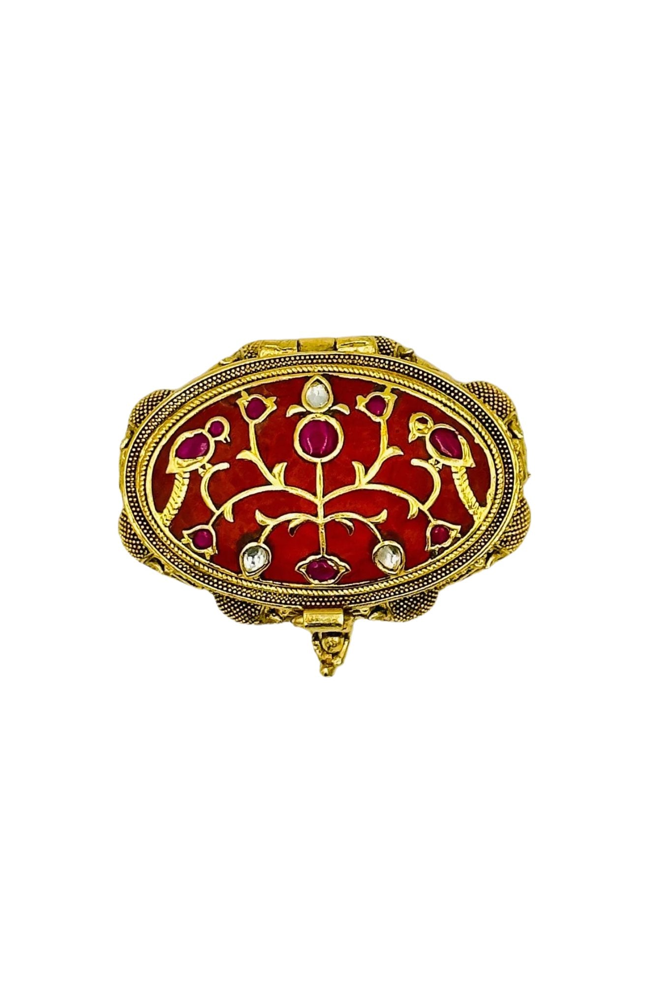 Indulge in the luxurious charm of our maroon Jadau kumkum box. Its deep, rich hue, reminiscent of royal gatherings, is meticulously complemented by intricate gold filigree. The age-old Nagas design graces its facade, making this box not just a vessel for kumkum but a testament to timeless artistry and elegance.