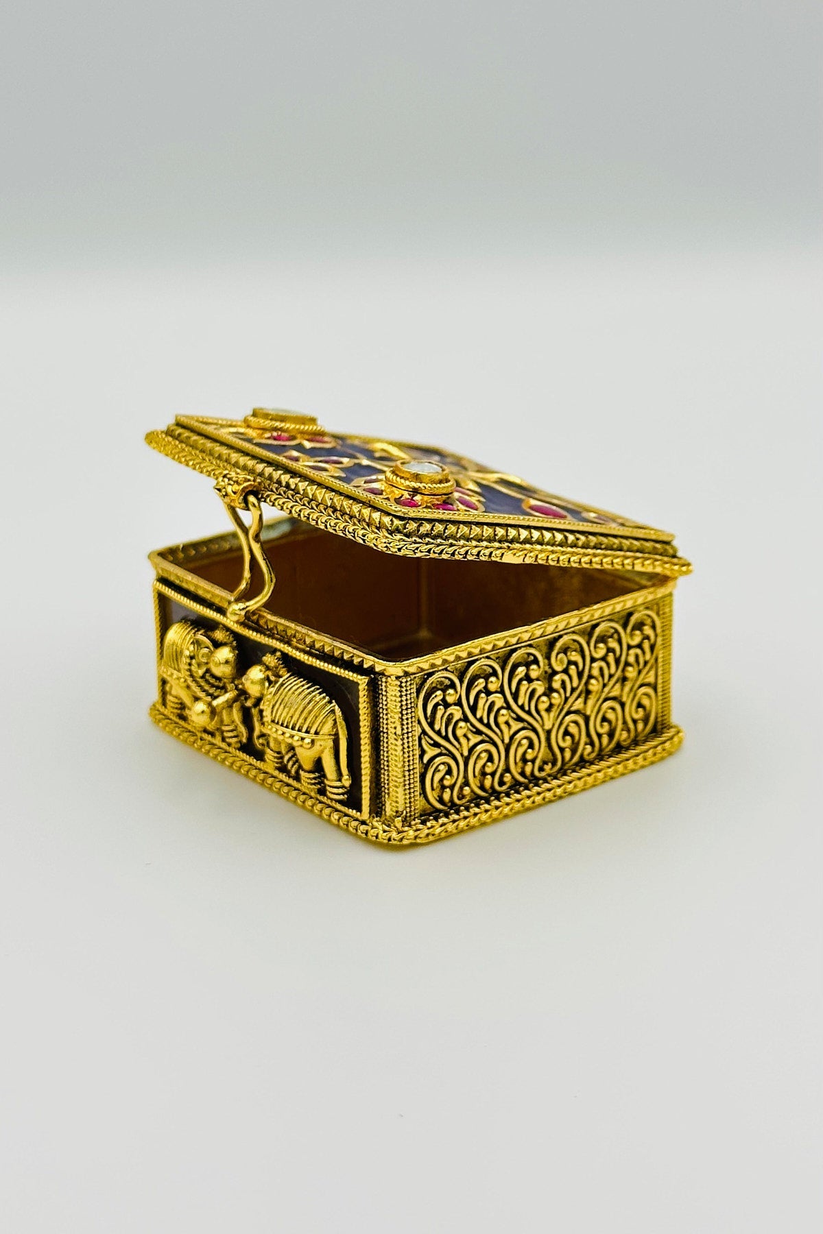 Discover a piece where craftsmanship meets artistry – our hand-carved brass keepsake box. Gracefully showcasing the traditional brilliance of Meenakari carving, this box stands as a testament to time-honored design and contemporary elegance. At its heart sits a radiant Jadau stone, adding a touch of regal charm. More than just a storage piece, it's a testament to timeless beauty.