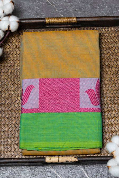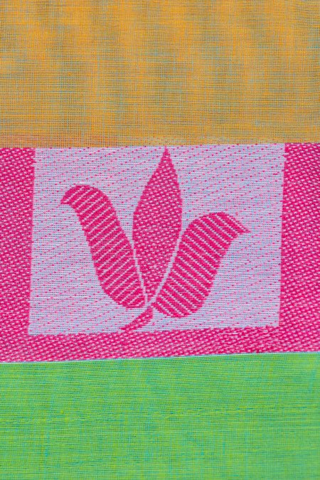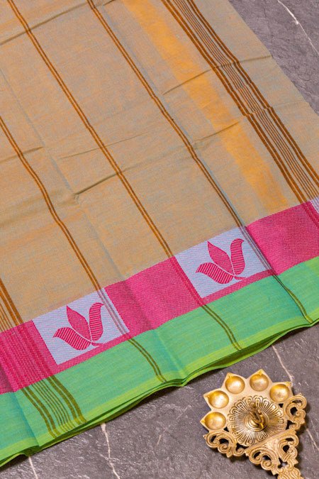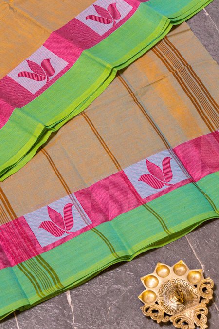 Cream Cotton Saree with Mint Green and Pink Border - swadeshsouq.com
