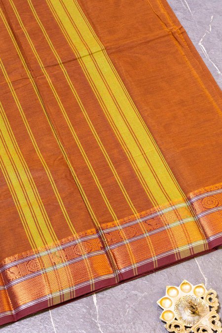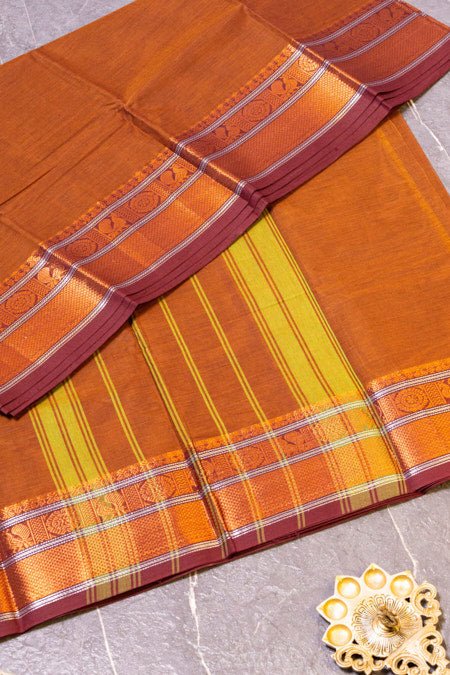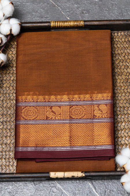 Drape yourself in sophistication with this dark brown Chettinad pure cotton saree, beautifully adorned with rich and elegant zari borders. The deep brown hue exudes timeless charm, while the intricate zari work adds a touch of opulence. Crafted from soft, breathable cotton, this saree offers unmatched comfort and style, making it perfect for festive occasions, cultural gatherings, or refined everyday wear. Experience the heritage of Chettinad weaving in every graceful drape.