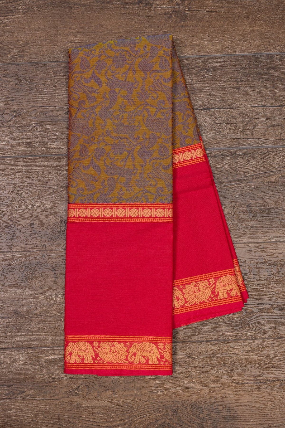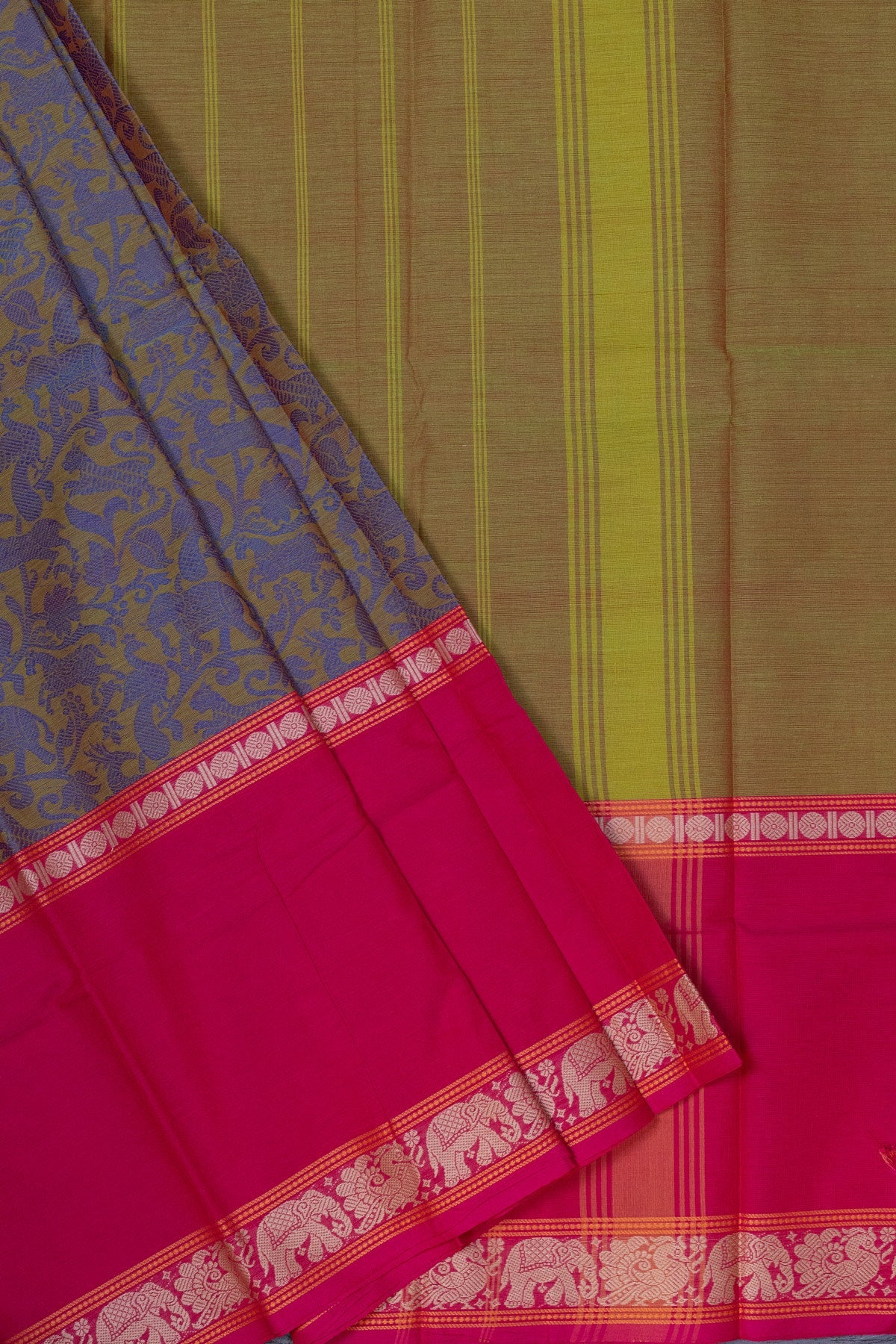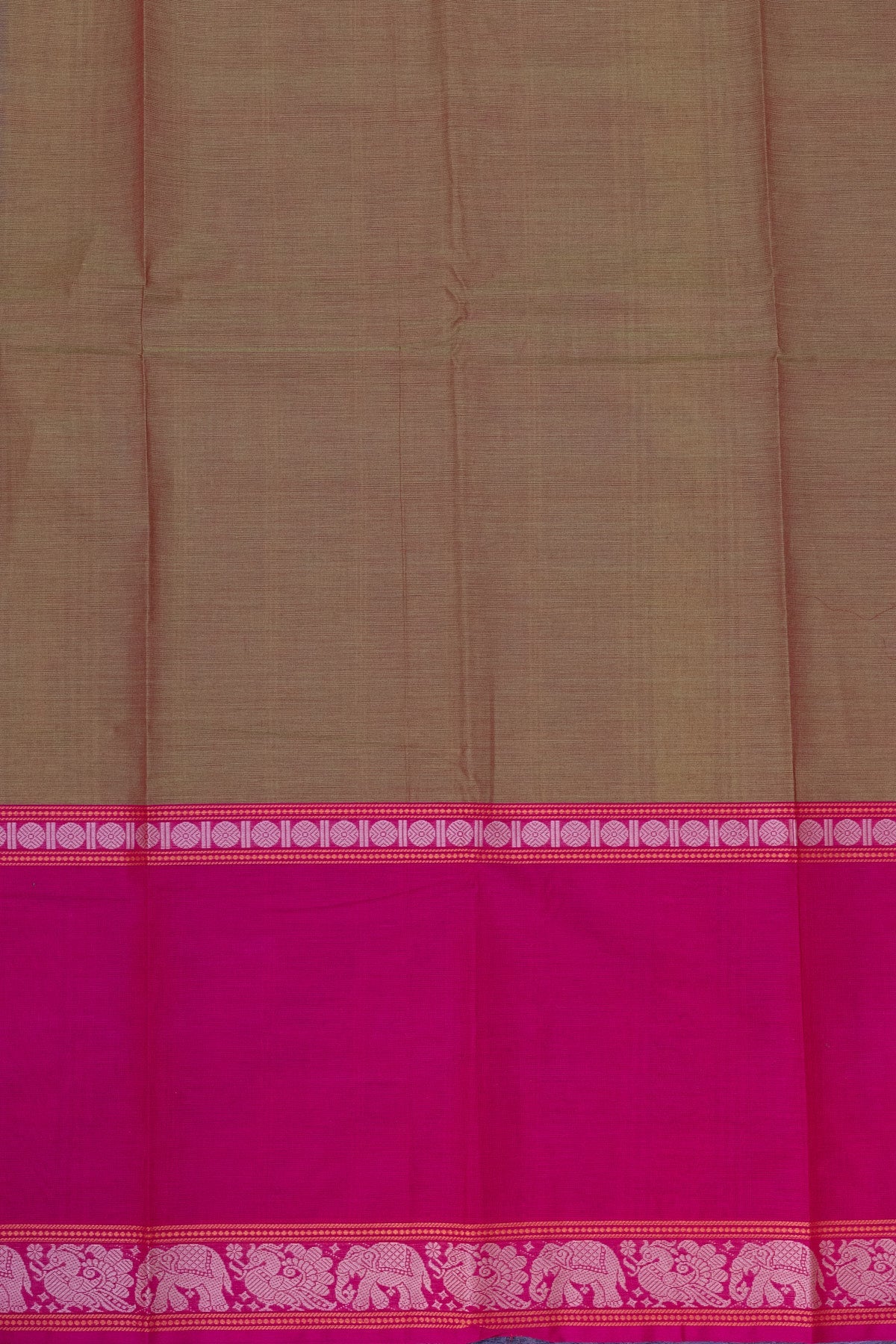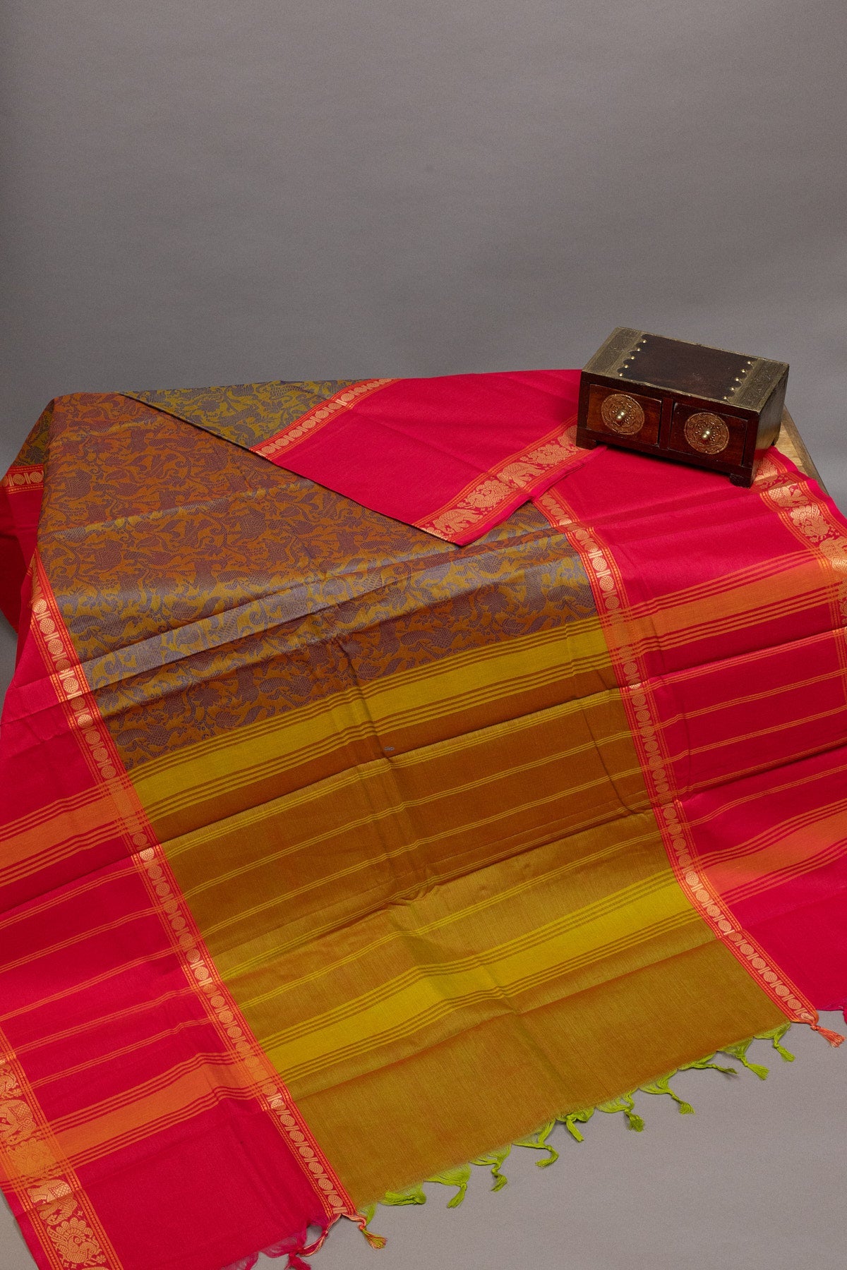 Step into a world where tradition meets contemporary elegance with our Vanasingaram saree. Bathed in the warm glow of mustard green and softened by a blush of pink, this dual-toned wonder stands as a testament to timeless artistry. As the saree drapes gracefully, the intricate weaves playfully catch the light, embodying both heritage and sophistication.