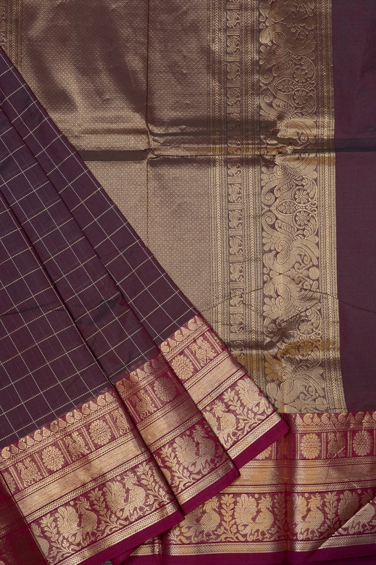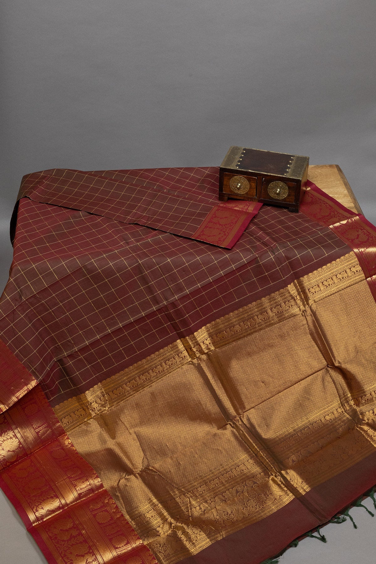 A symphony of tradition and elegance comes alive with our hand-woven Chettinad cotton saree. brown melds with the pink to present a piece that is both grounded and majestic. The saree boasts delicate zari checks that twinkle in muted splendor, complemented perfectly by a lavish zari pallu that adds the final touch of grandeur.