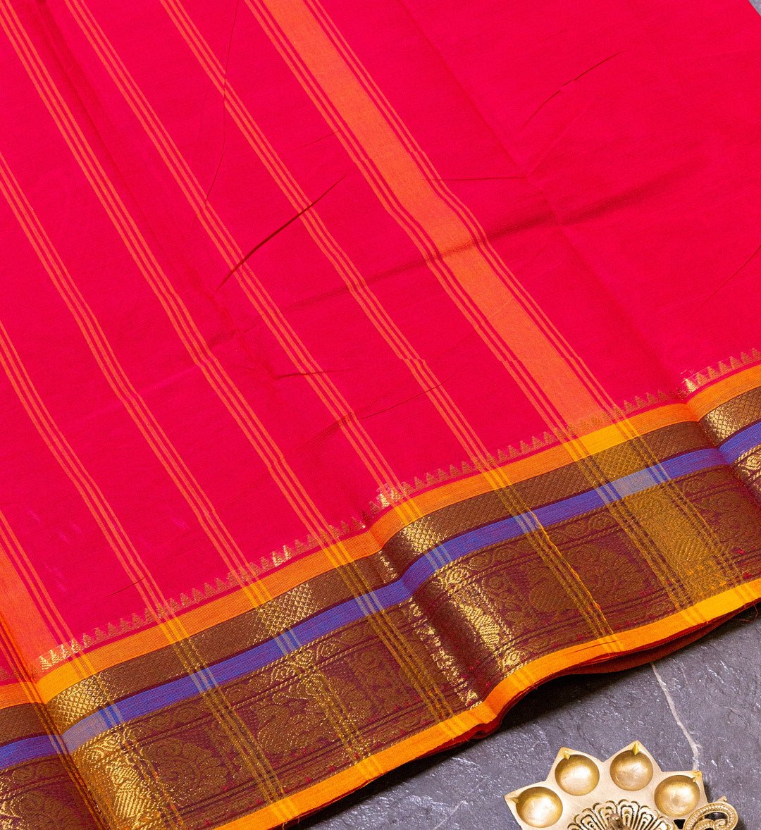 This pink and yellow pure cotton Chettinad saree exudes understated elegance, featuring a simple yet beautiful border that enhances its traditional charm. Crafted from soft, breathable cotton, this saree offers comfort without compromising on style. The fresh combination of pink and yellow makes it ideal for festive occasions, cultural events, or daily wear. Embrace the timeless beauty of Chettinad weaving with this elegant piece, perfect for adding a touch of grace to your wardrobe.