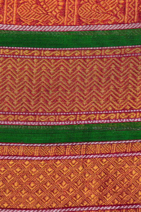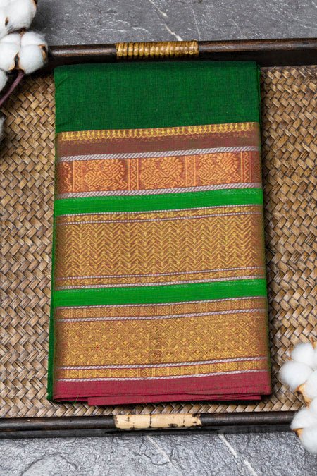 Grace meets tradition in this stunning Chettinad pure cotton saree. The lush green body exudes elegance, beautifully complemented by intricate golden zari patterns across the border and pallu. Delicate hints of maroon and silver accents add depth to the design, creating a timeless masterpiece perfect for any occasion. Crafted from pure cotton, this saree offers comfort and breathability while embracing the charm of heritage craftsmanship. A true blend of sophistication and tradition.