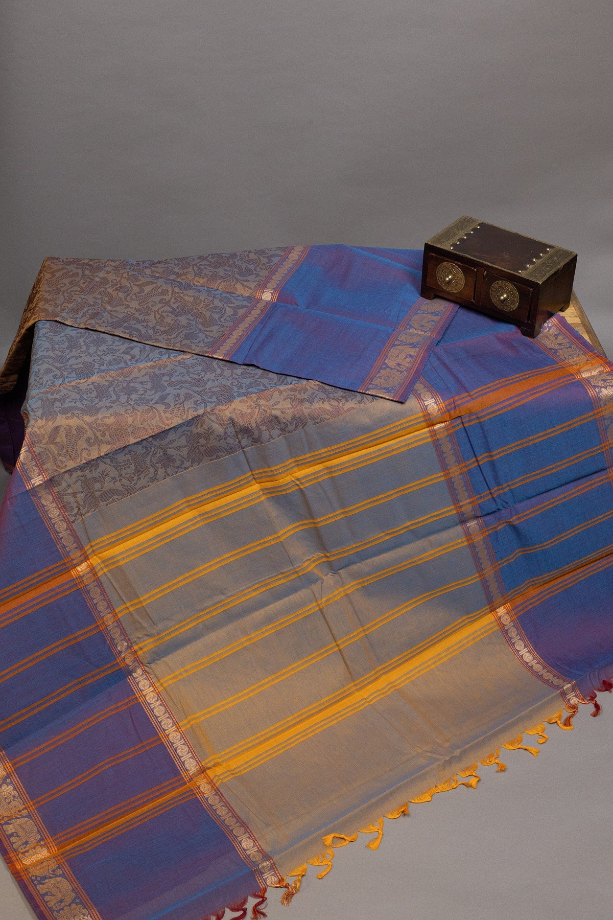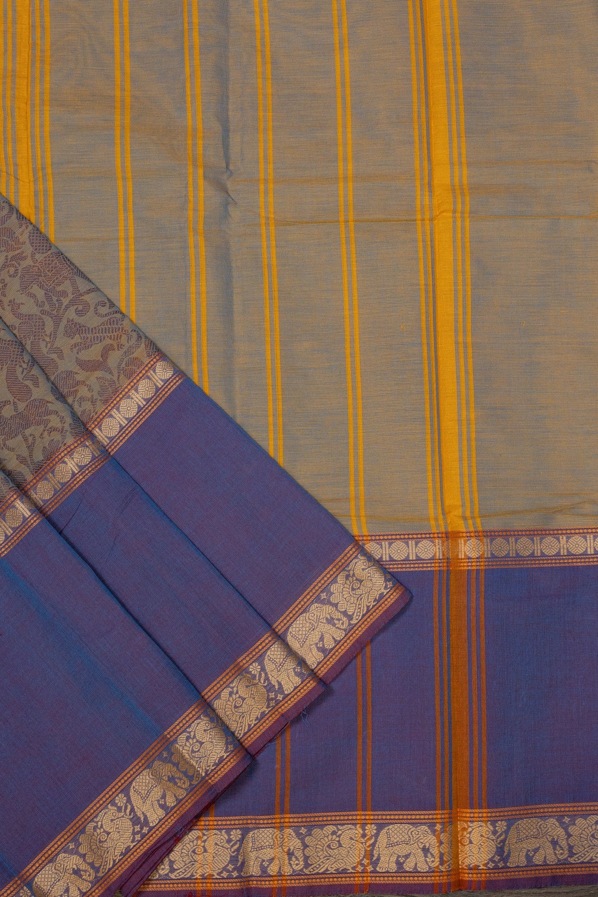 Embrace the captivating allure of our "Enchanting Melody" saree, blending graceful grey and blue hues with a hint of gentle yellow. Adorned with mesmerizing Vanasingaram motifs, this masterpiece exudes timeless elegance. Step into the spotlight with regal allure and embrace the enchanting beauty of this exceptional saree.