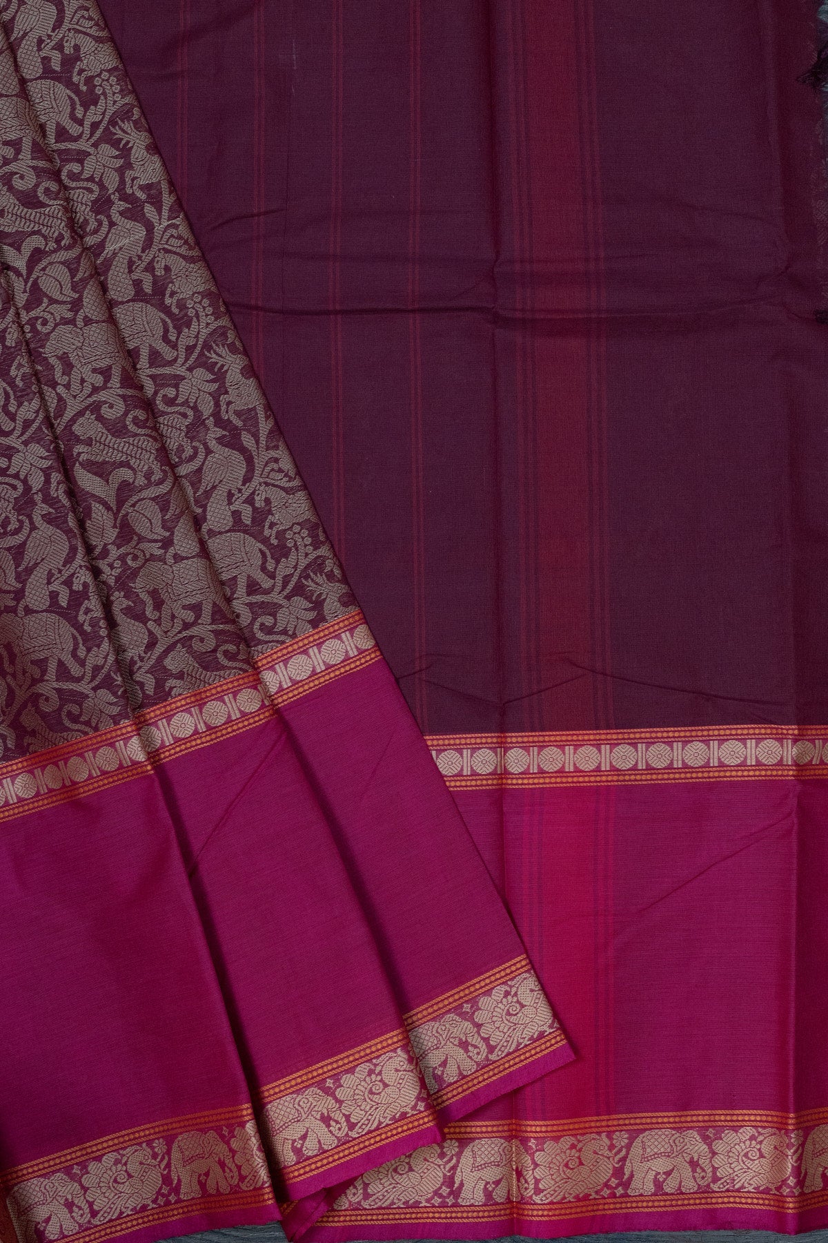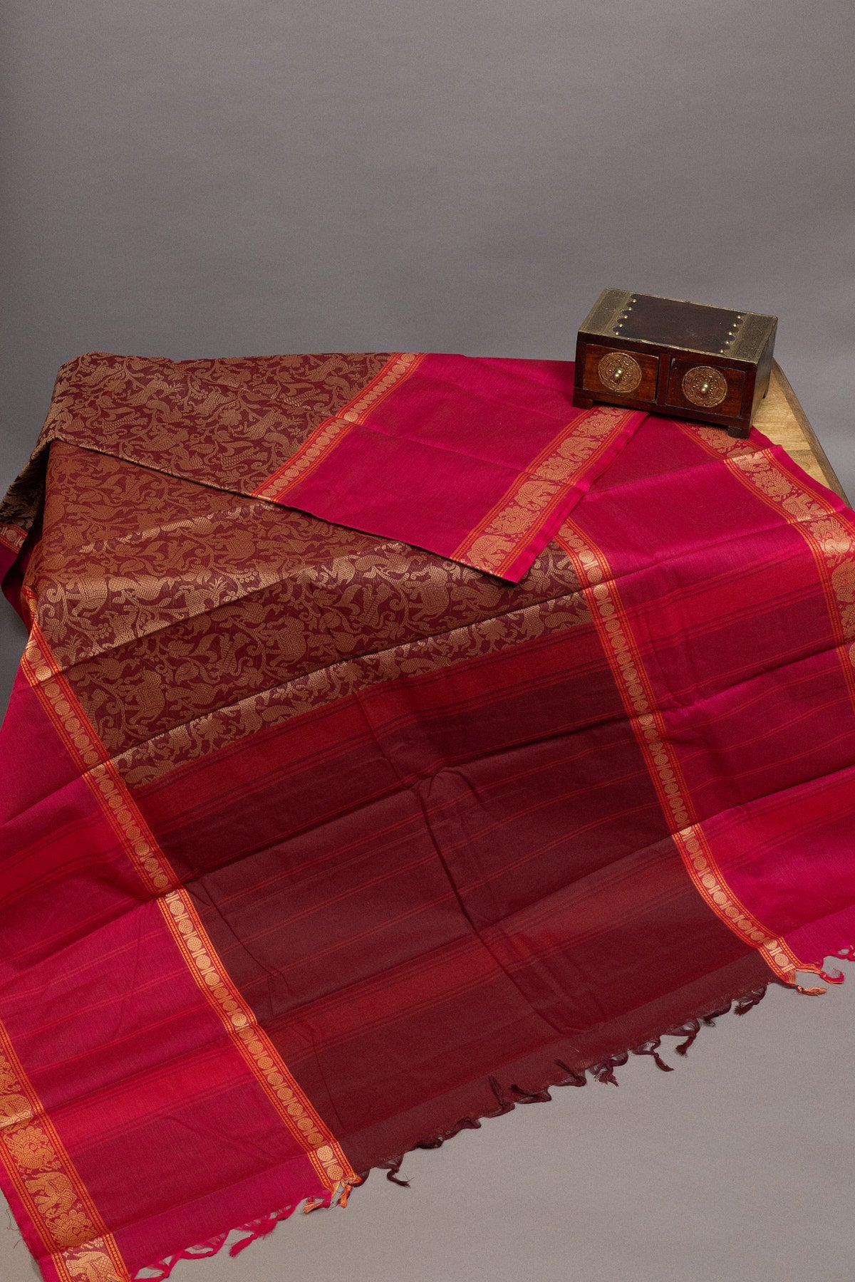 Unveil timeless charm with our "Ethereal Fusion" saree, blending deep purple and pink in a mesmerizing Vanasingaram design. Embrace sophistication and allure at every occasion, as this masterpiece epitomizes tradition and artistry. Elevate your style with the captivating blend of colors and make a lasting impression with this exceptional Vanasingaram saree.