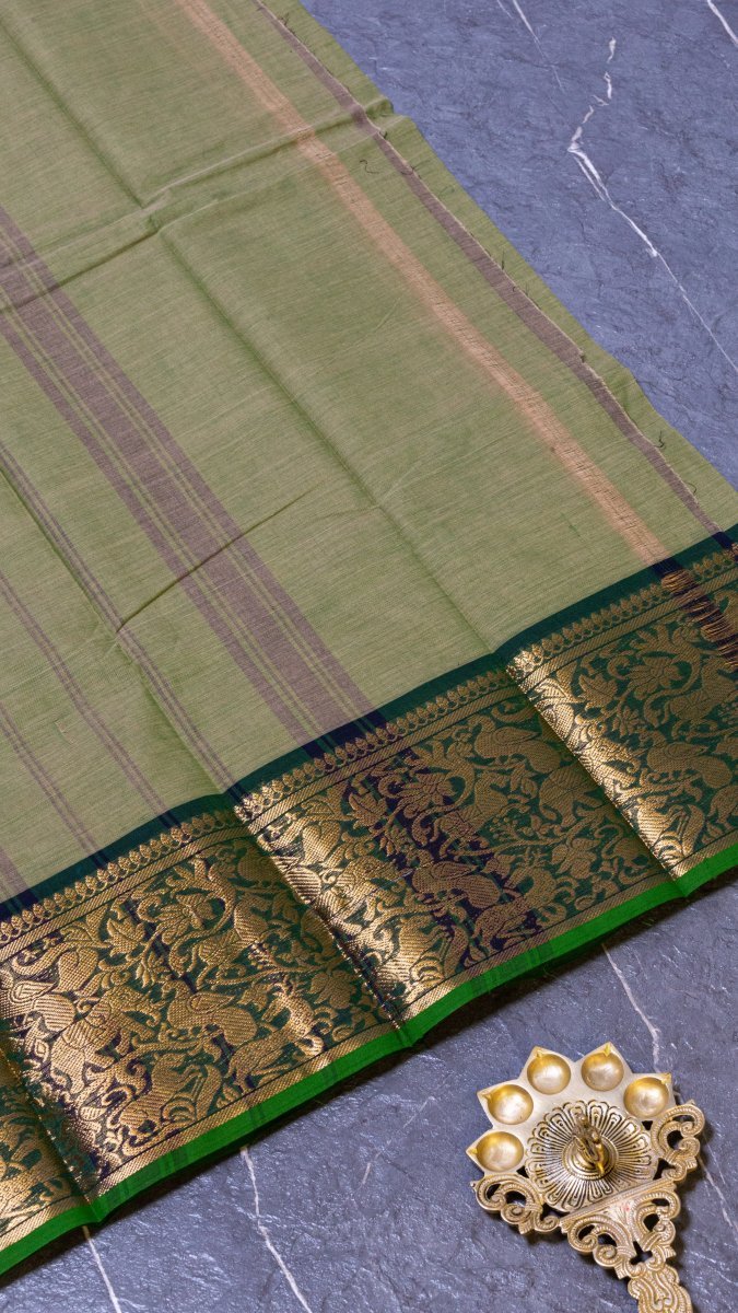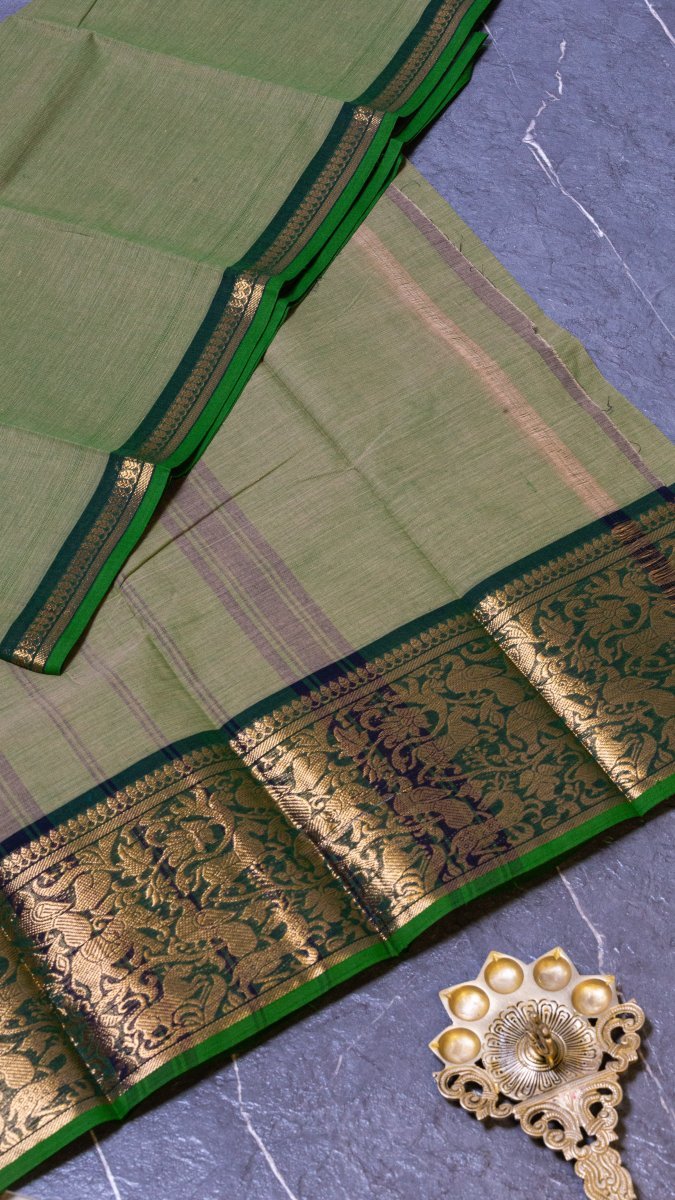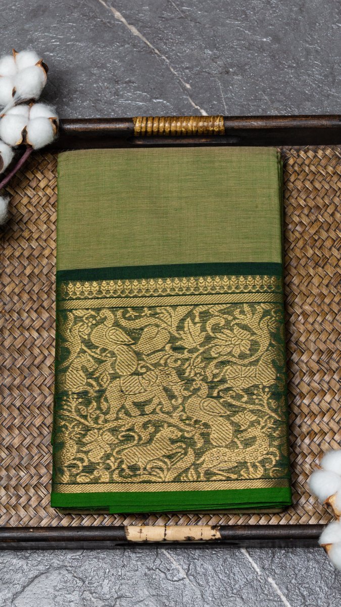 Elevate your ethnic wardrobe with this stunning Olive Green Chettinad Cotton Saree with Zari Border. Handwoven to perfection, this saree showcases the timeless beauty of Chettinad craftsmanship, featuring a rich olive green hue enhanced by a delicate zari border that adds a touch of regal charm. Made from pure cotton, it ensures breathability and comfort, making it perfect for festive occasions, office wear, or casual elegance. Accompanied by a complimentary handblock printed Ajrak pure cotton blouse piece, this saree is a true embodiment of tradition and sophistication.