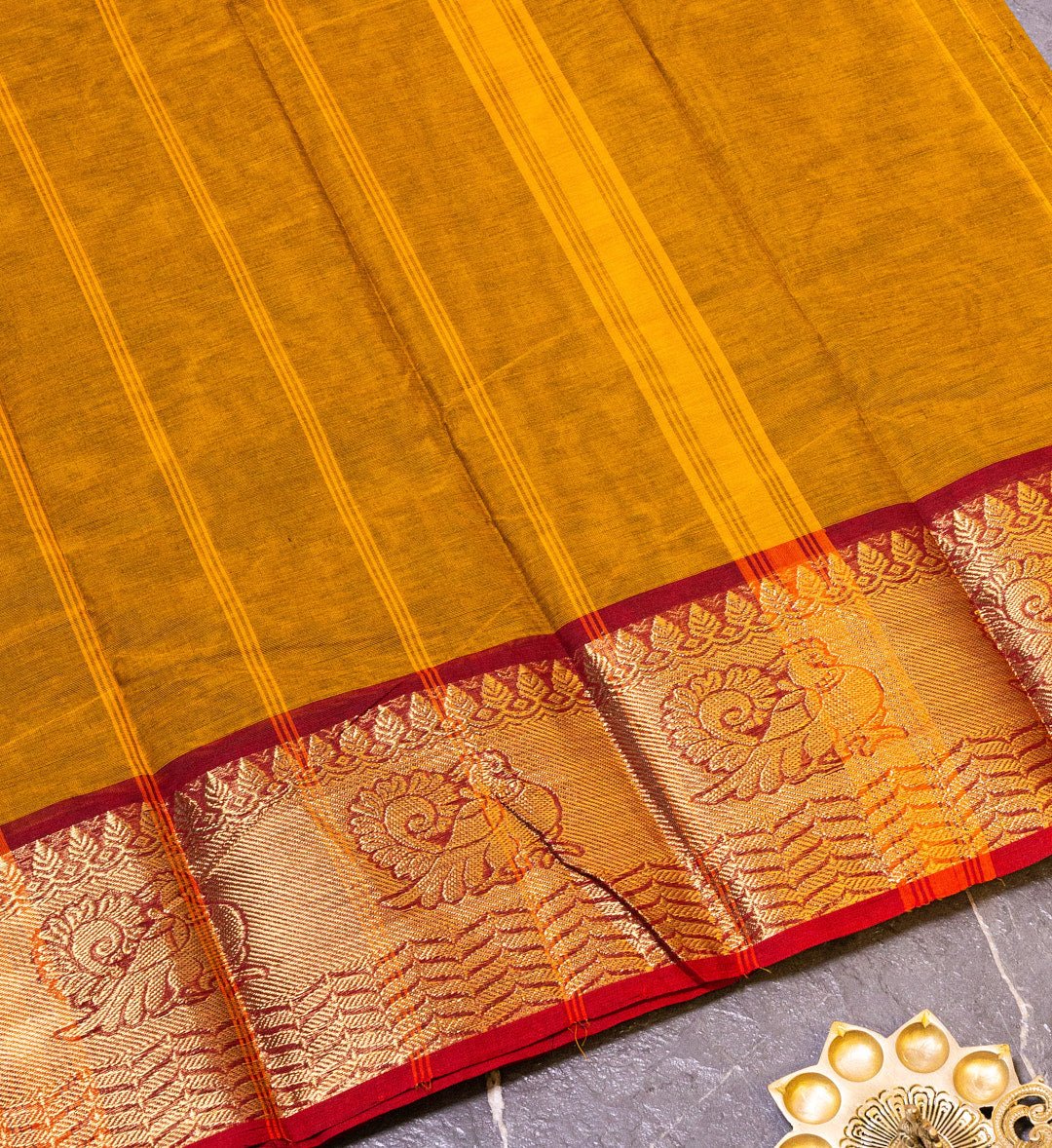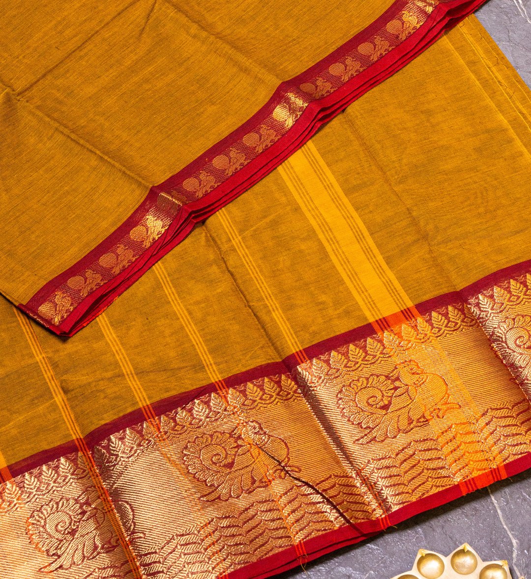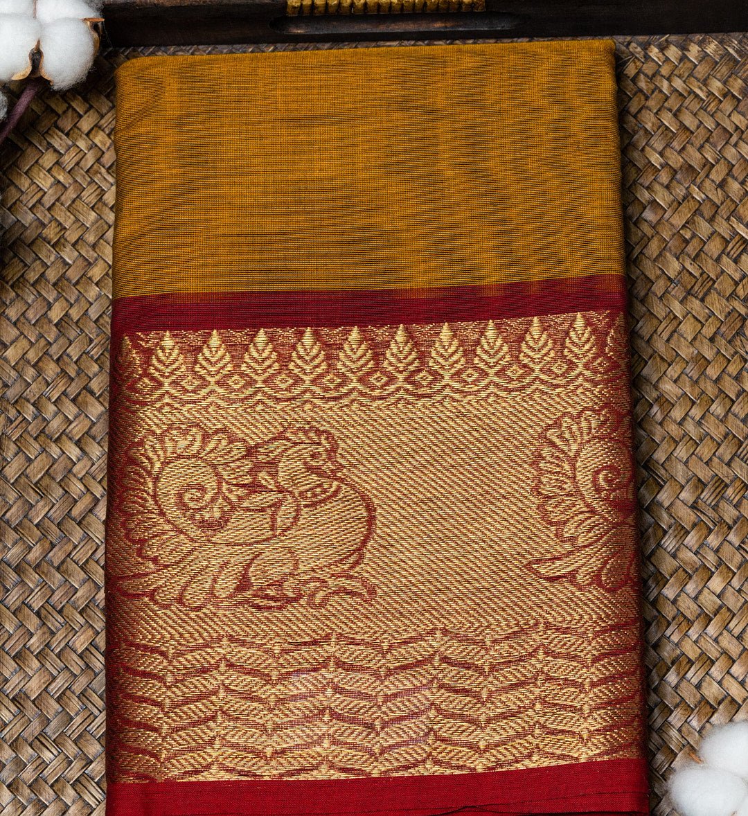 Embrace the regal and elegant beauty of this dark mustard yellow and maroon saree with exquisite zari border and intricate peacock design. Made from high-quality materials, this stunning saree is perfect for any special occasion or event. The intricate peacock design adds a touch of traditional charm and grace to the overall look of the saree, making it a must-have for any fashion-conscious woman. Whether you're attending a wedding, festival, or any other celebration, this saree will surely make you the center of attention with its majestic peacock splendor.