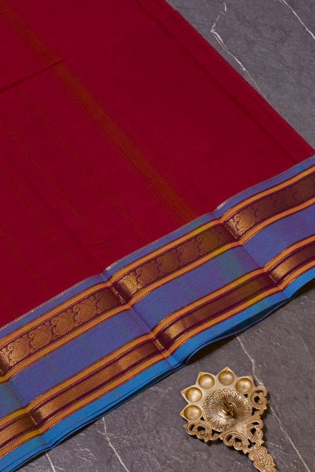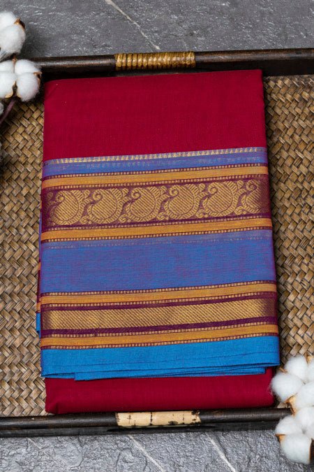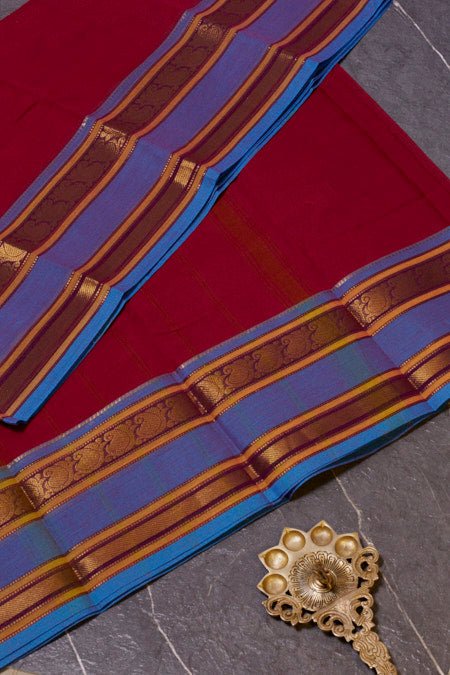 Embrace heritage and elegance with this stunning maroon Chettinad cotton saree, beautifully accented with rich blue woven borders. Crafted from pure, breathable cotton, this saree offers unmatched comfort and grace, making it perfect for festive celebrations, cultural events, or sophisticated everyday wear. The deep maroon hue paired with contrasting blue borders creates a striking look, reflecting the timeless artistry of Chettinad weaving. Add this classic piece to your collection for a touch of tradition and style.