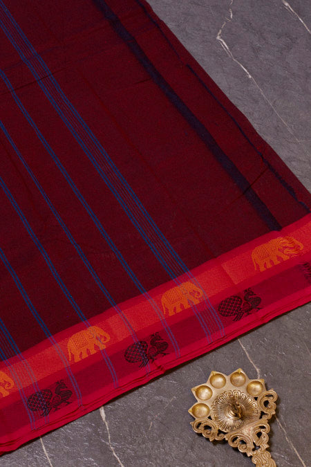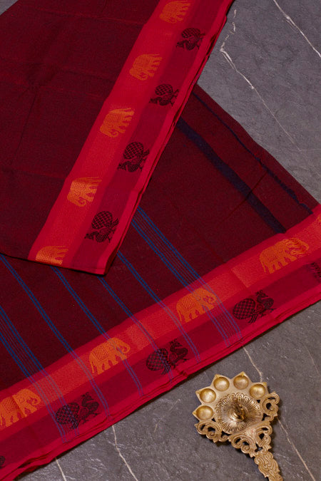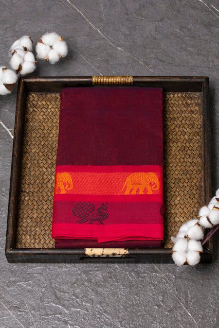Maroon Chettinad Pure Cotton Saree with Graceful Pink Borders