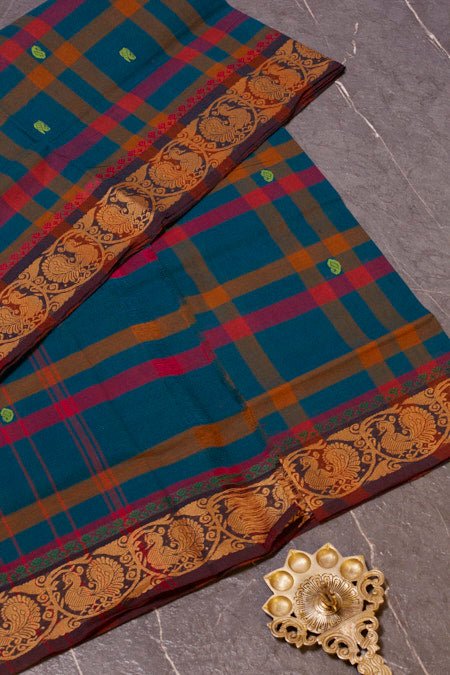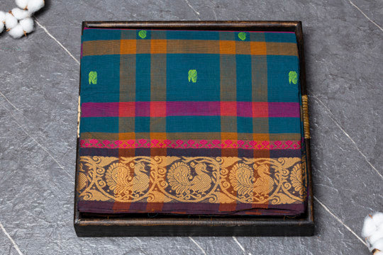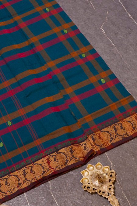 Embrace the rich heritage of Chettinad craftsmanship with this stunning pure cotton saree, featuring a vibrant multicolour checks pattern. Woven from soft, breathable cotton, this saree offers unmatched comfort while showcasing timeless tradition. Perfect for festive occasions, cultural events, or casual elegance, the striking colour combination makes it a standout piece in any wardrobe. Add a touch of classic charm with this beautifully crafted Chettinad saree.