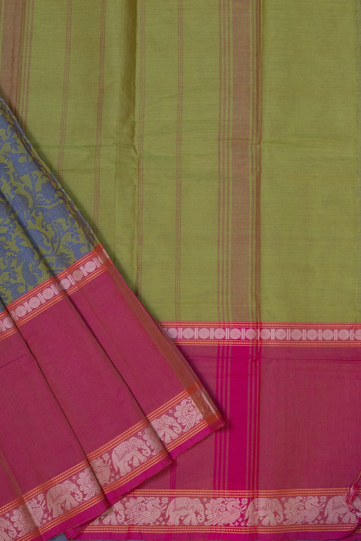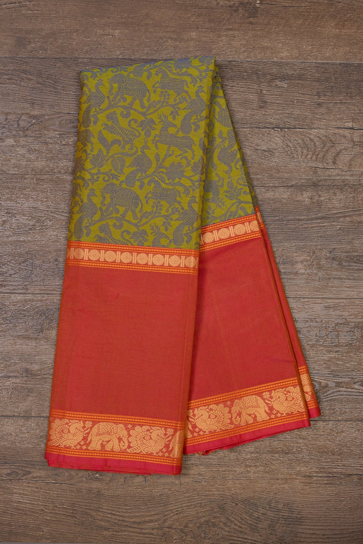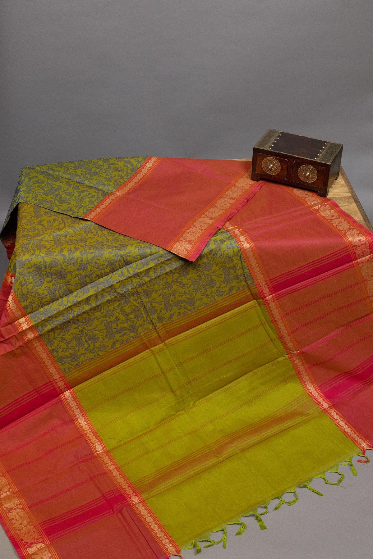 Immerse yourself in a tapestry of vivid hues with our Vanasingaram saree. The refreshing parrot green seamlessly merges with a burst of sun-kissed orange, creating a vibrant canvas reminiscent of tropical landscapes. The heritage Vanasingaram weave intricacies dance across the saree, offering a luxurious blend of tradition and contemporary style.