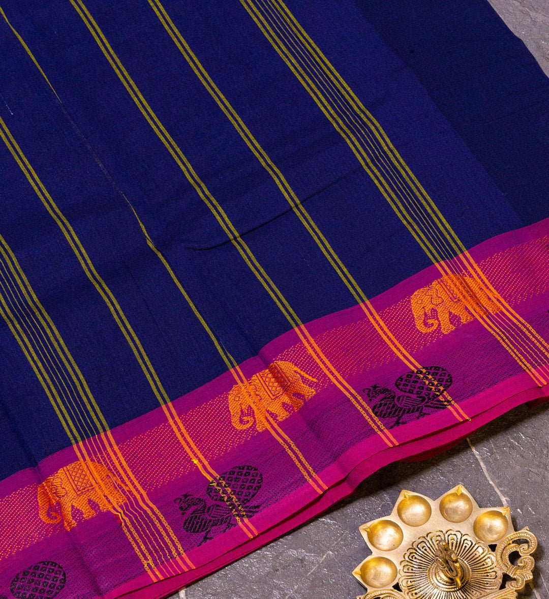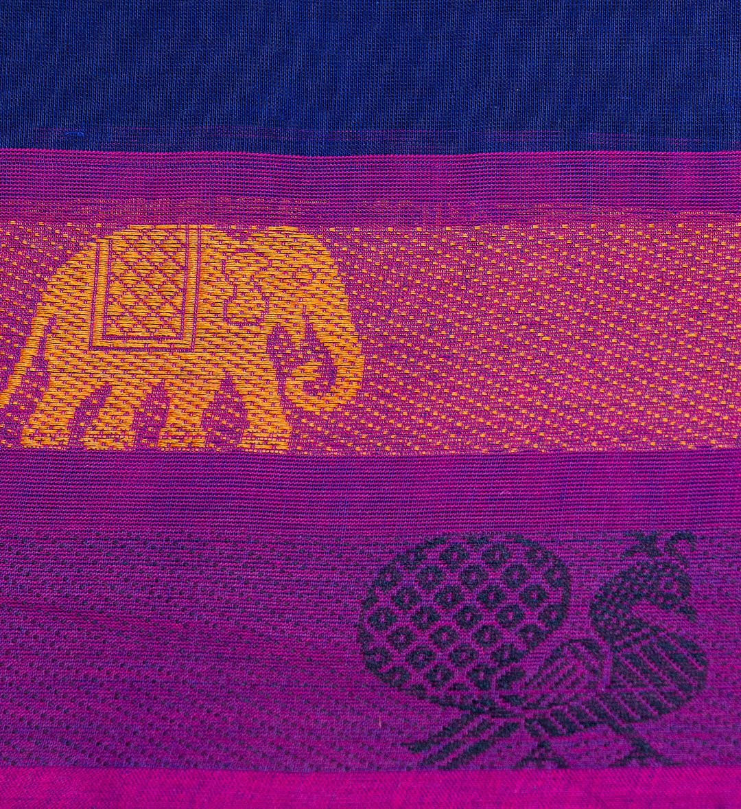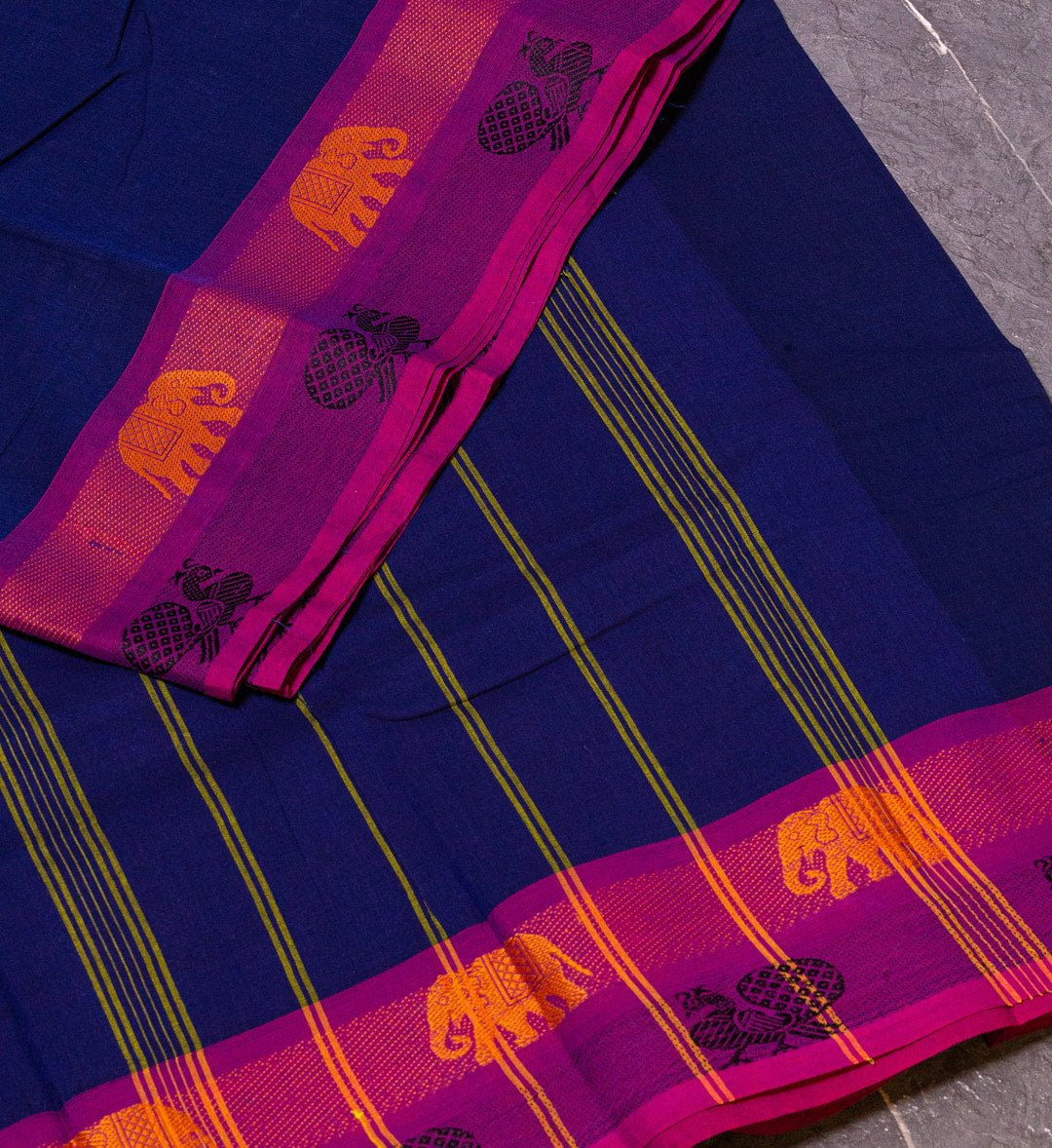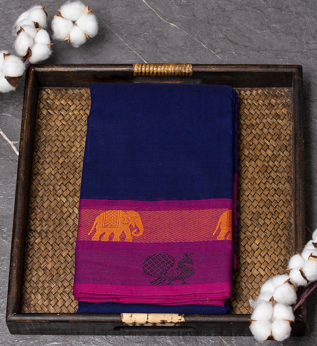 The Peacock and Elephant Symphony saree is a beautiful and intricate piece of traditional Indian textiles. This stunning Royal Blue and Pink Cotton Chettinad saree features exquisite elephant and peacock motifs, symbolizing grace and beauty. The saree also boasts a double border that adds a touch of elegance and sophistication. Made from high-quality cotton, this saree drapes beautifully and is comfortable to wear for long hours. The saree is perfect for all occasions, from formal events to casual outings, and its versatile design makes it a wardrobe staple. With its impeccable quality and stunning design, the Peacock and Elephant Symphony saree is a true work of art that is sure to turn heads.