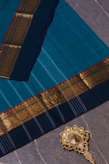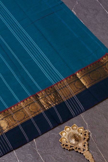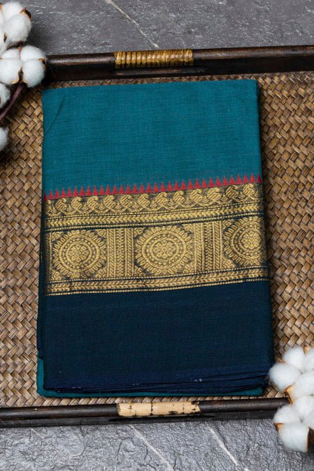Drape yourself in the vibrant elegance of this peacock green Chettinad cotton saree, beautifully handwoven with intricate details. The rich peacock green color is complemented by a stunning zari border, adding a touch of regal charm to the traditional design. Crafted from soft, breathable cotton, this saree offers ultimate comfort and is perfect for festive occasions, weddings, or cultural events. Experience the timeless appeal of Chettinad craftsmanship with this exquisite cotton saree, combining tradition and style effortlessly.