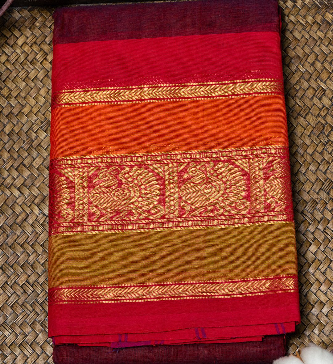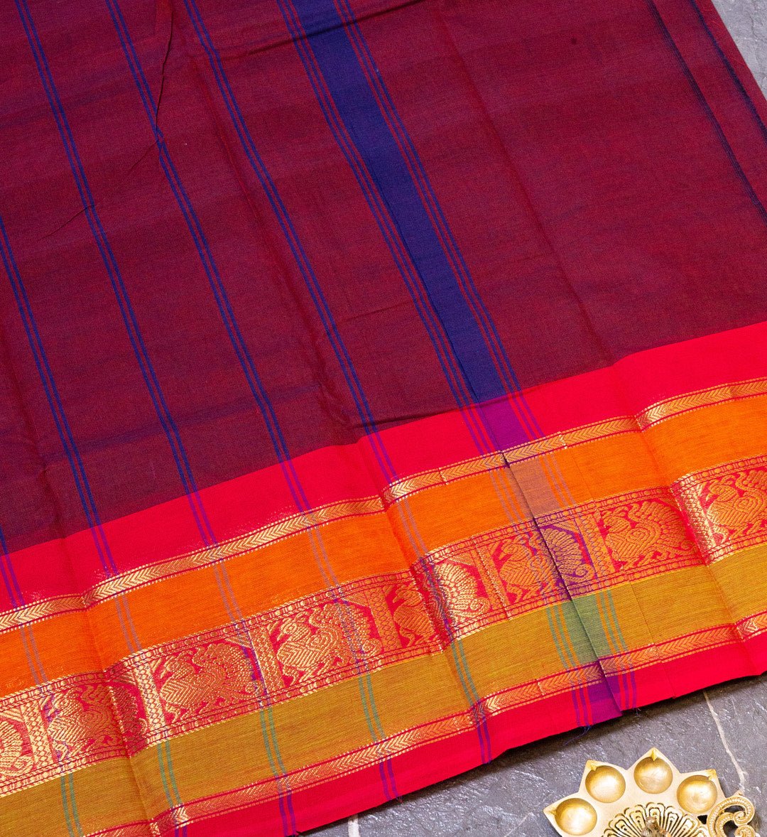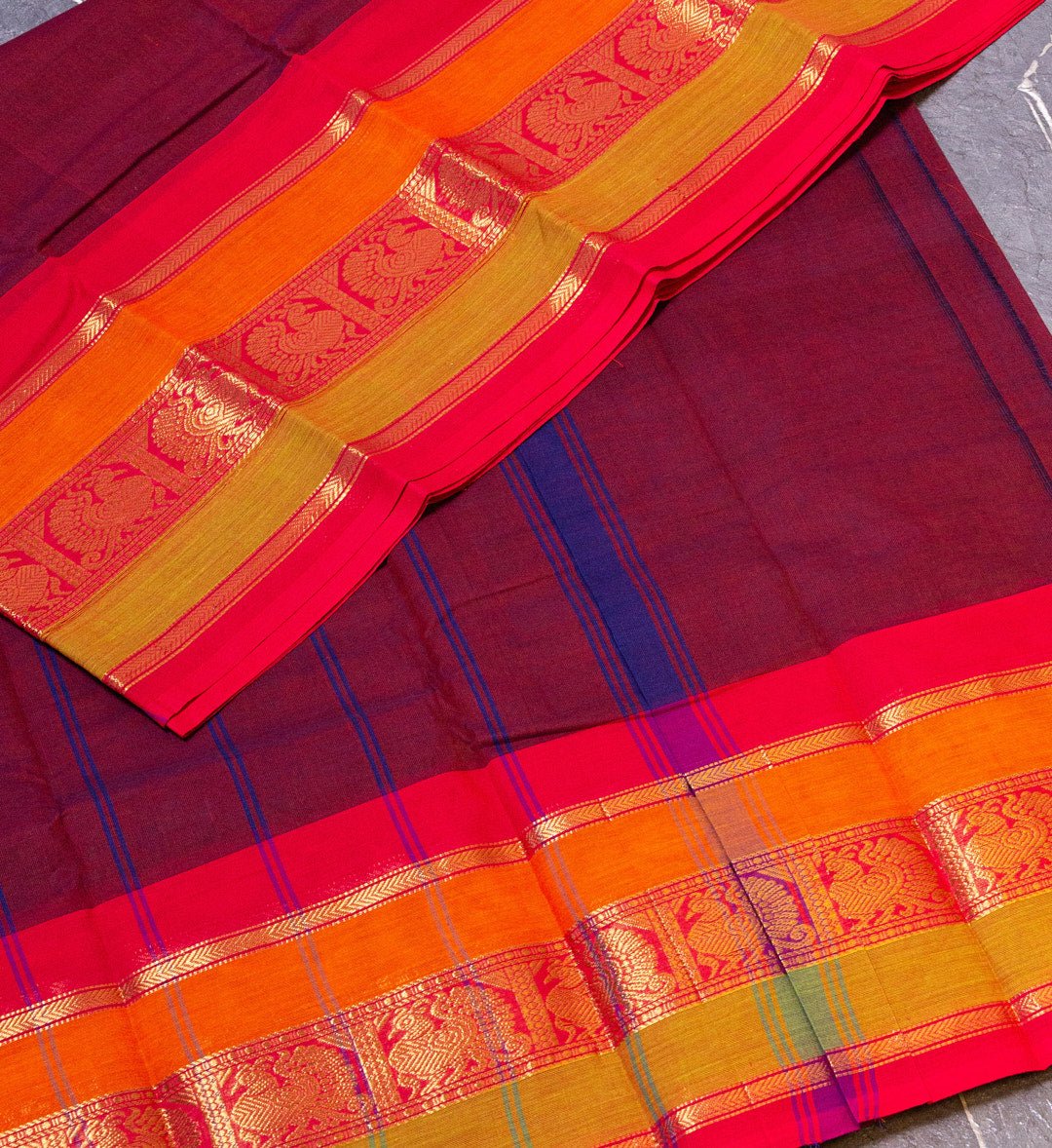 Experience the regal beauty of the Dark Maroon and Red Chettinad Cotton Long Border Saree. With its rich and timeless elegance, this saree is perfect for any occasion. The intricate long border adds a touch of sophistication to the overall look. Made from high-quality chettinad cotton, this saree is comfortable to wear and easy to care for. Elevate your ethnic style with this stunning piece.
