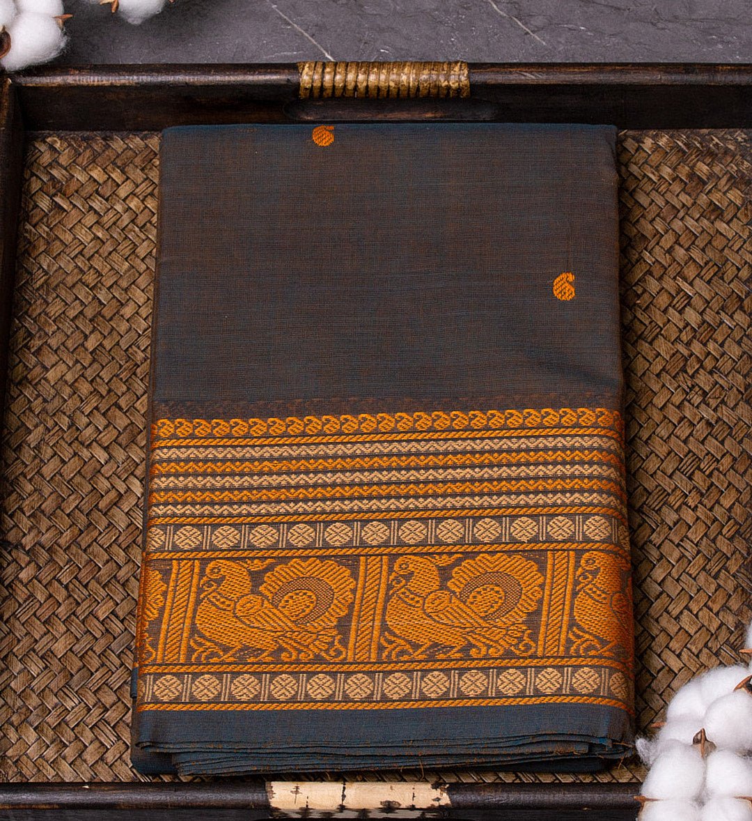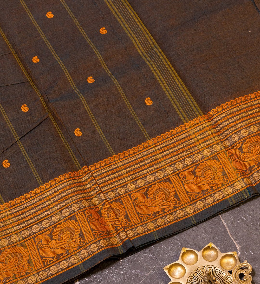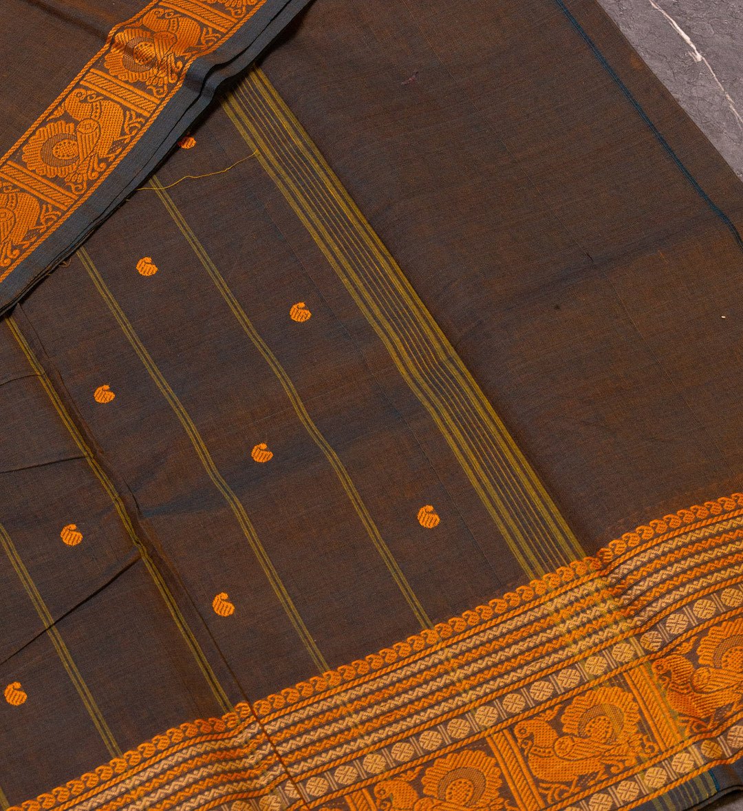 Experience the charm of intricate weaving and craftsmanship with our Brown Thread Butta Chettinad Saree. The delicate threadwork detailing and smooth texture of the saree will add a touch of elegance to any occasion.