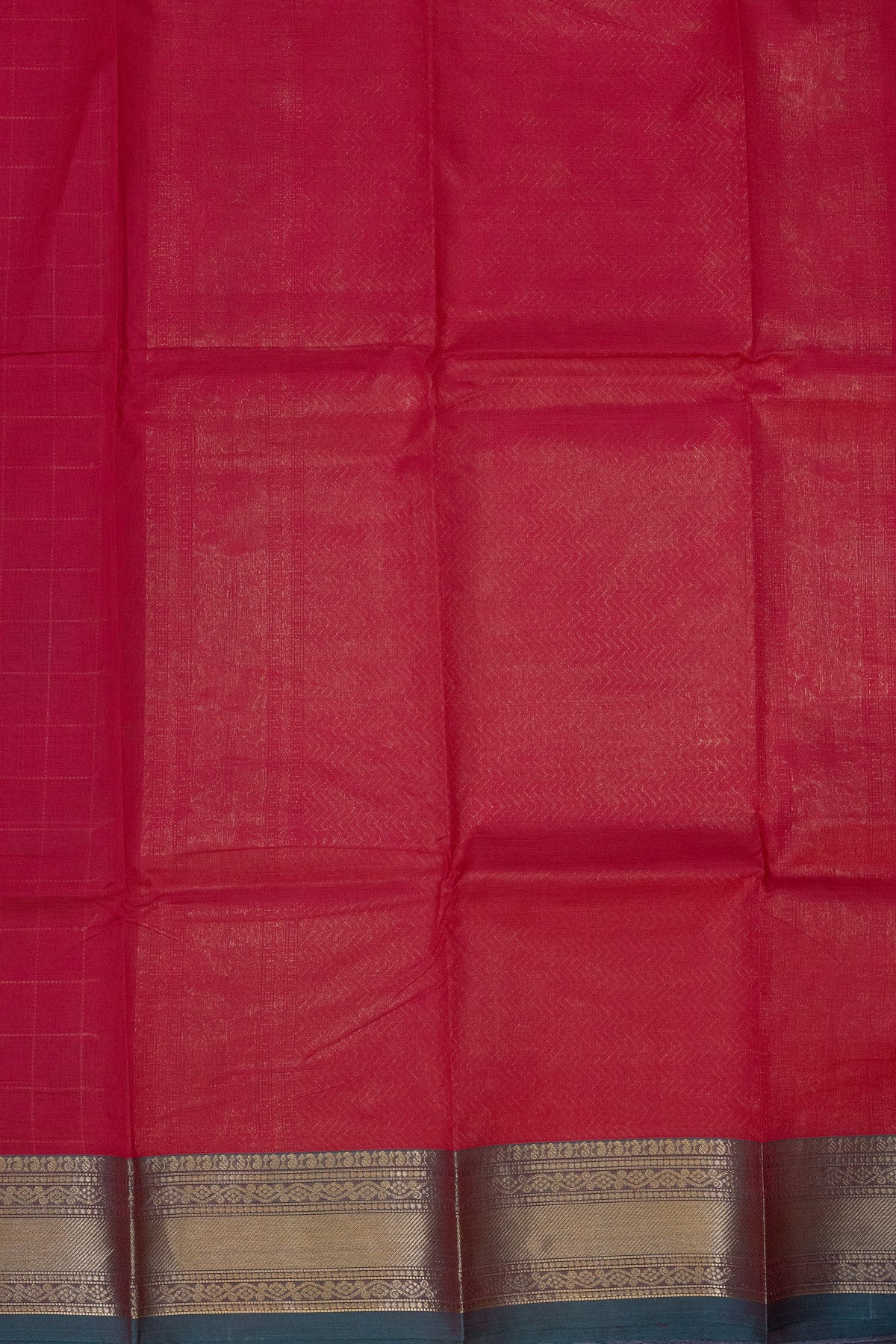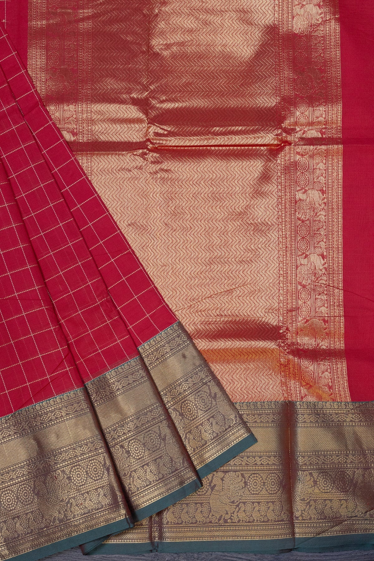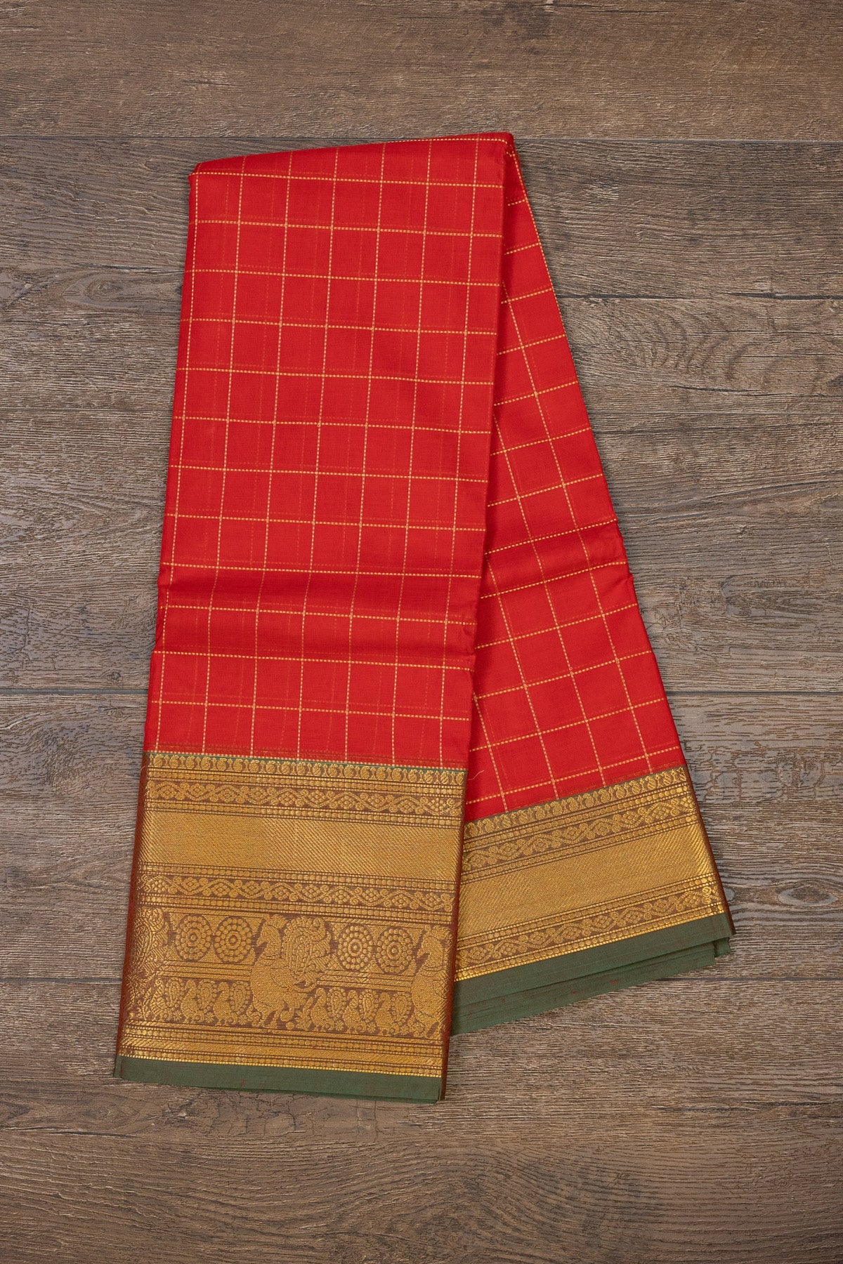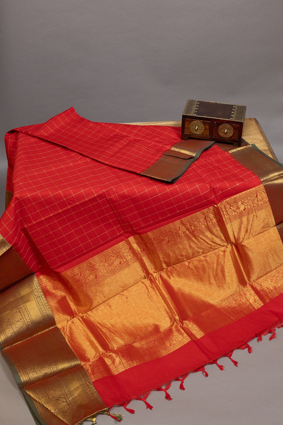 Celebrate the exuberance of color with our hand-woven Chettinad cotton saree. The vivacious red, synonymous with celebration, marries the lush green in an embrace of cultural magnificence. With delicate zari checks shimmering across, the saree culminates in a grand zari pallu, making it a quintessential piece for those who appreciate heritage and style.