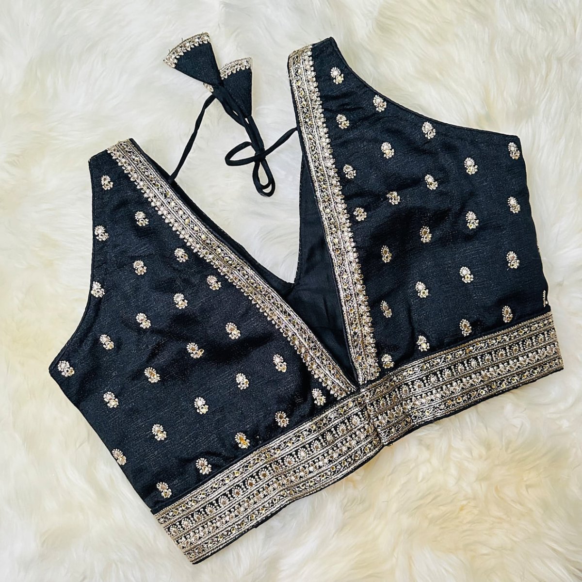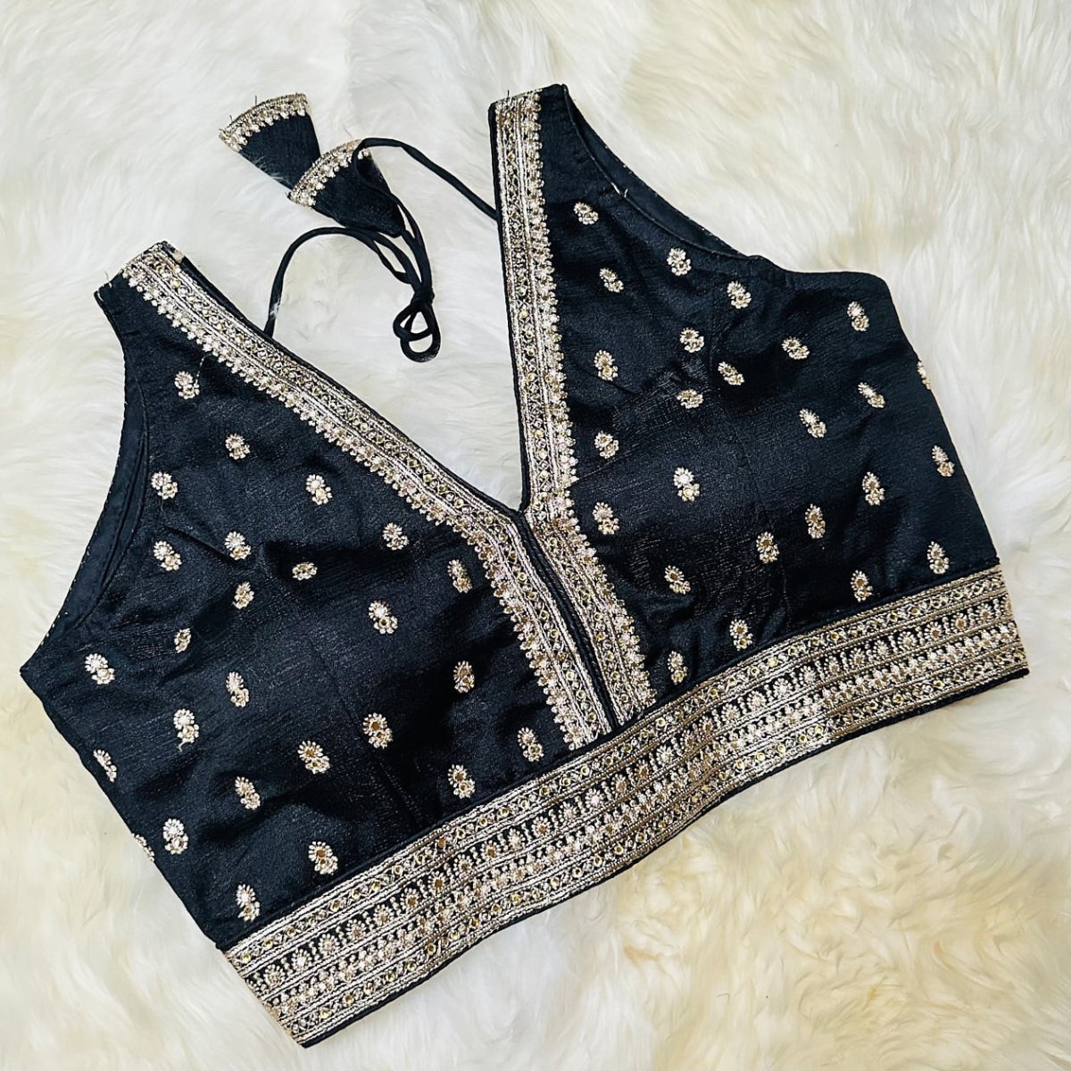 Black Silk Blouse with Exquisite Embroidery & Stone Embellishments – Adjustable Fit (32 to 36)