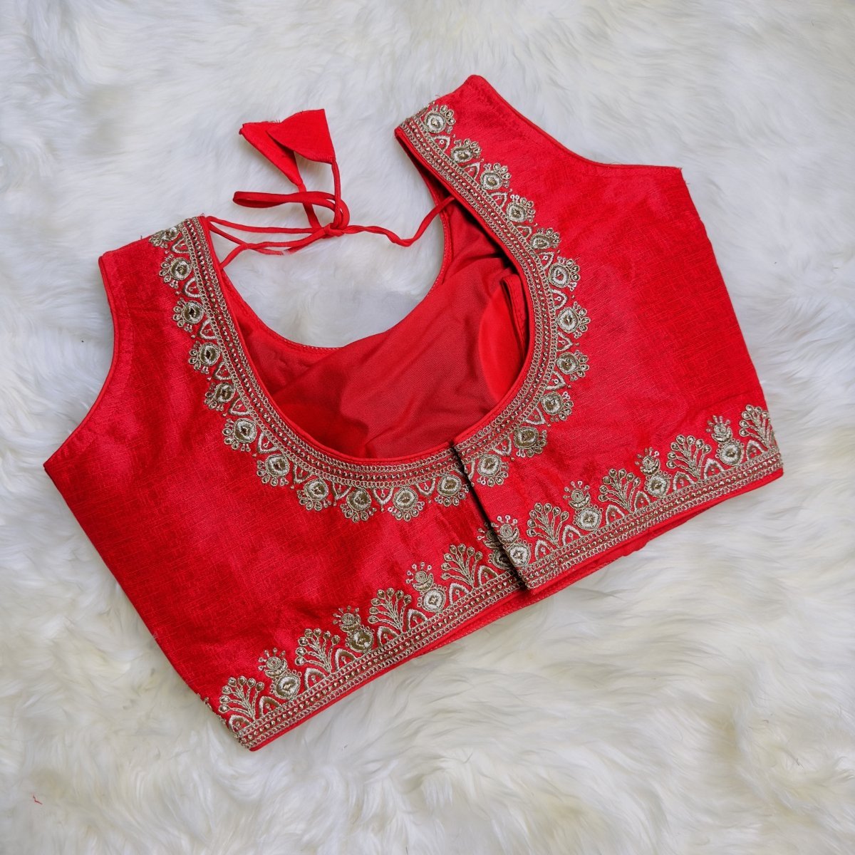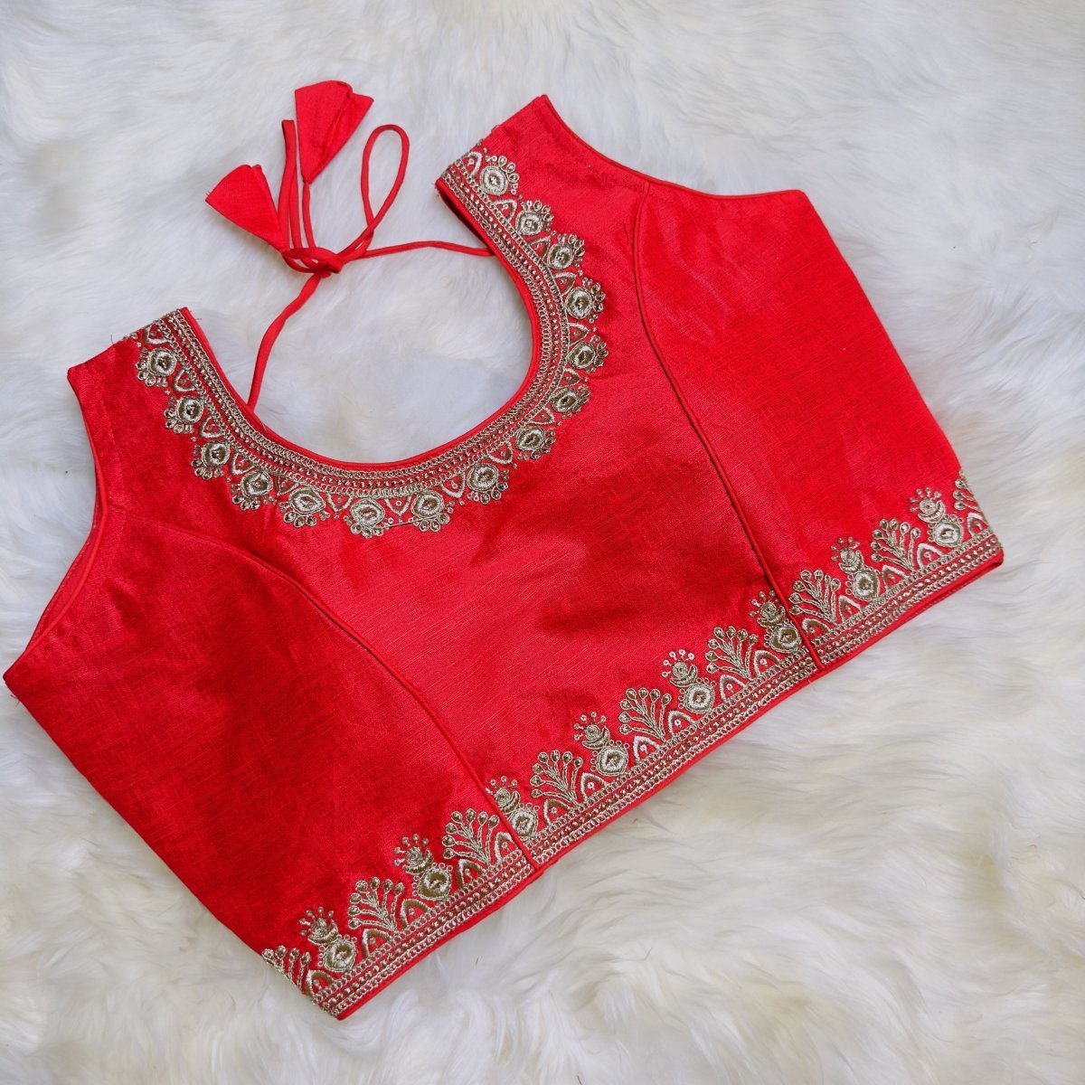 Add a vibrant touch to your festive collection with this Elegant Red Blouse with Intricate Embroidery. Made from high-quality fabric, this blouse features beautiful golden embroidery that adorns the neckline and waistline, adding a hint of royal charm. The blouse is designed to bring out the best in you during weddings, festive gatherings, or special occasions. With its classic design, it pairs beautifully with sarees or lehengas to complete a traditional look. Sleeves are included, enhancing the versatility and comfort of this lovely blouse.