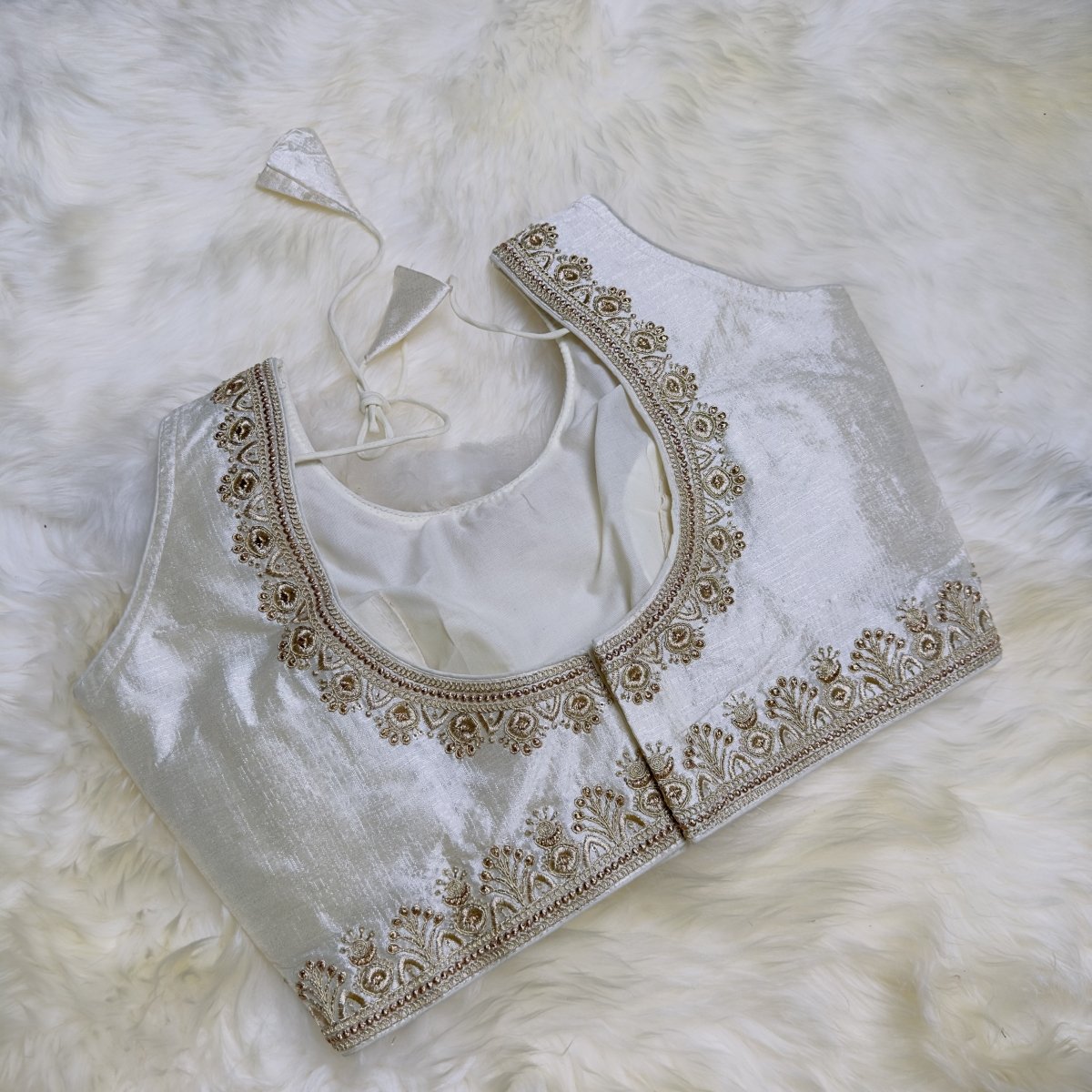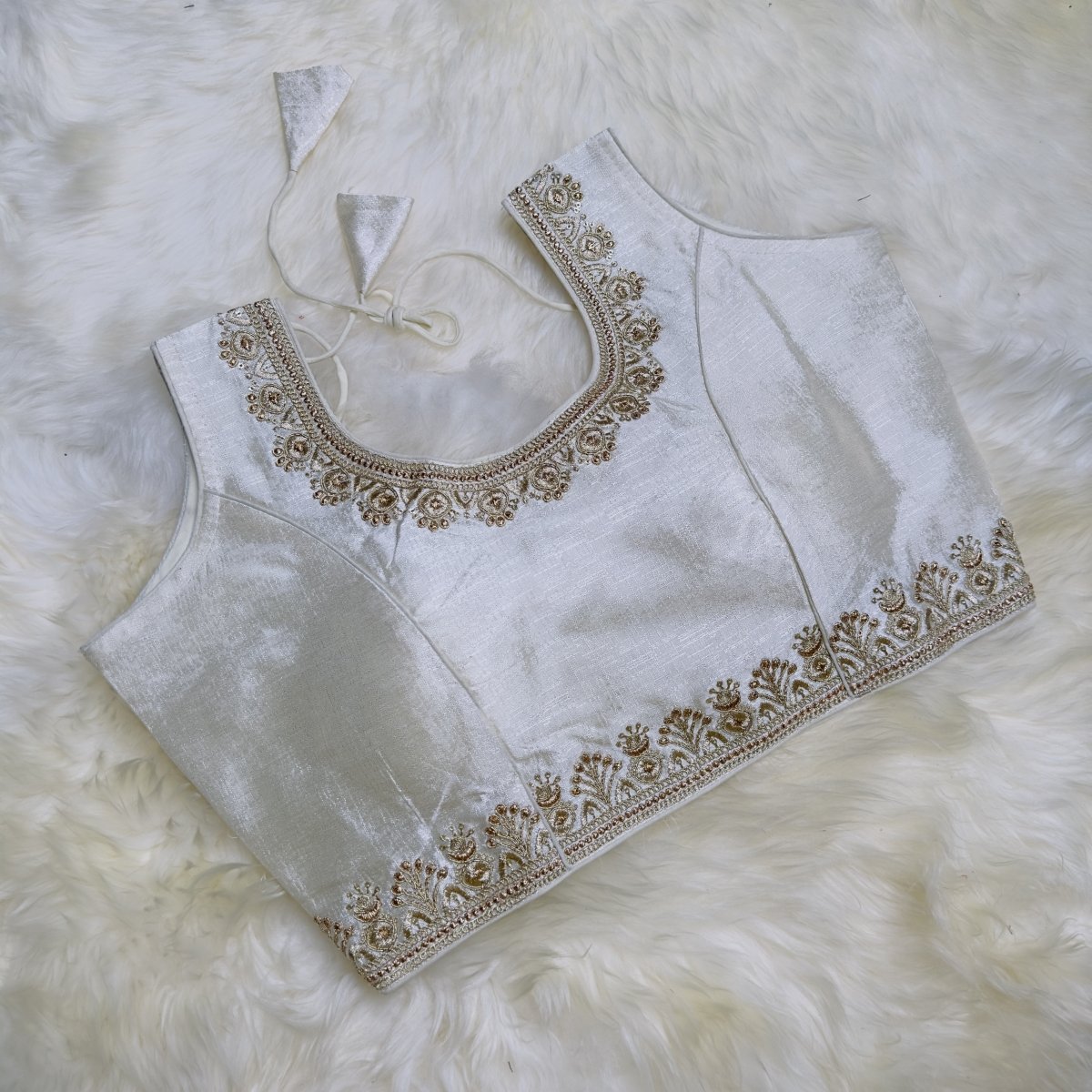Add a touch of elegance to your wardrobe with our Off White Blouse featuring Intricate Embroidery. Made with high-quality fabric, this blouse is designed to offer both style and comfort. The delicate golden embroidery around the neckline and hem adds a sophisticated and luxurious flair, making it an ideal choice for weddings, festive occasions, or any special gathering. The blouse includes sleeves, offering versatility and a timeless look. Pair it with your favorite saree or lehenga for an effortlessly graceful ensemble.