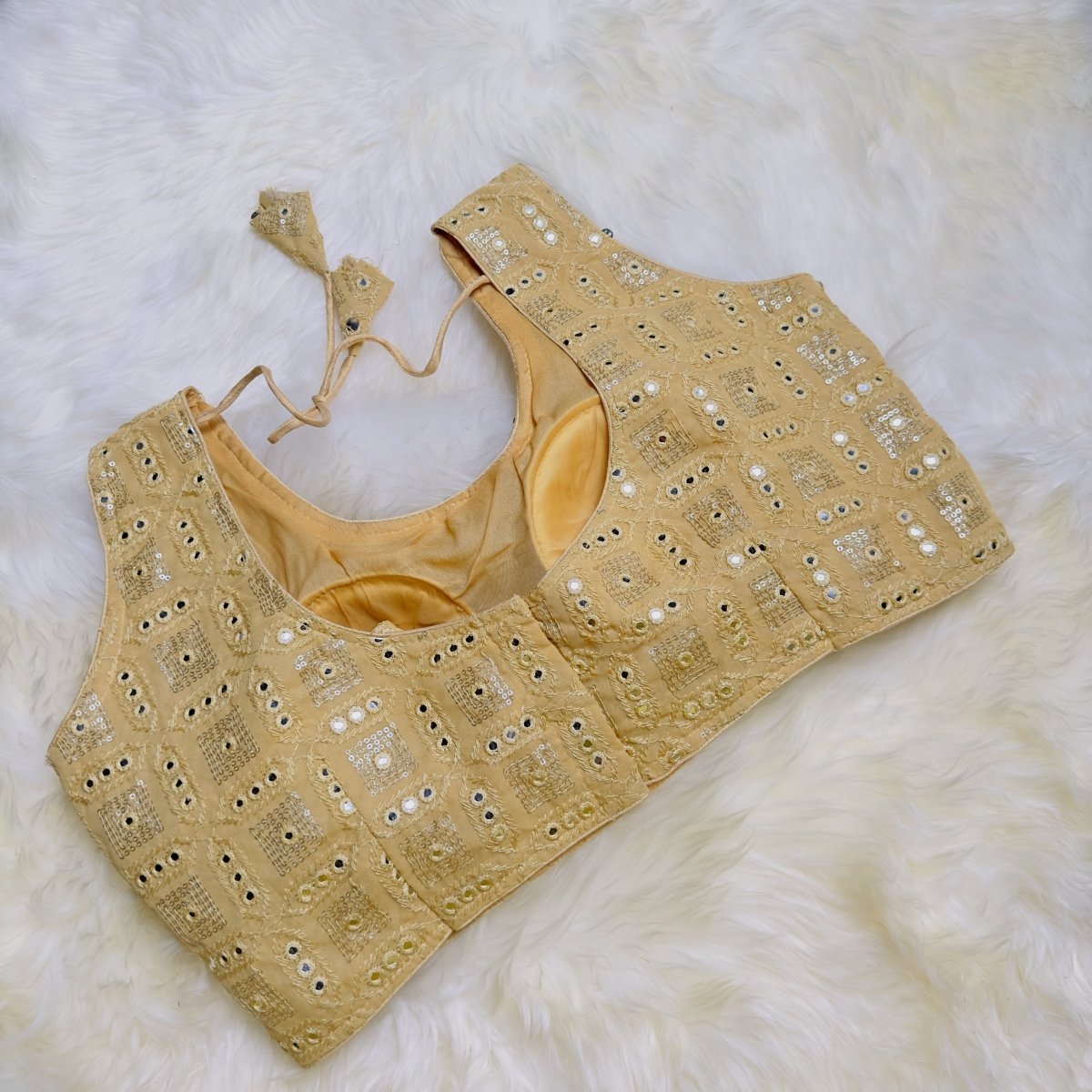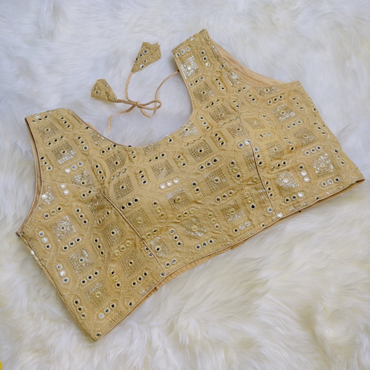 Sparkle with elegance with this beautiful designer blouse, embellished with intricate mirror work that catches the light in the most flattering way. Crafted in a stunning golden hue, this blouse adds a touch of glamour to any outfit, whether paired with sarees or lehengas. It features a flattering fit with attached sleeves and adjustable sizing, making it suitable for festive events, weddings, and special occasions. Stand out with confidence in this statement piece!